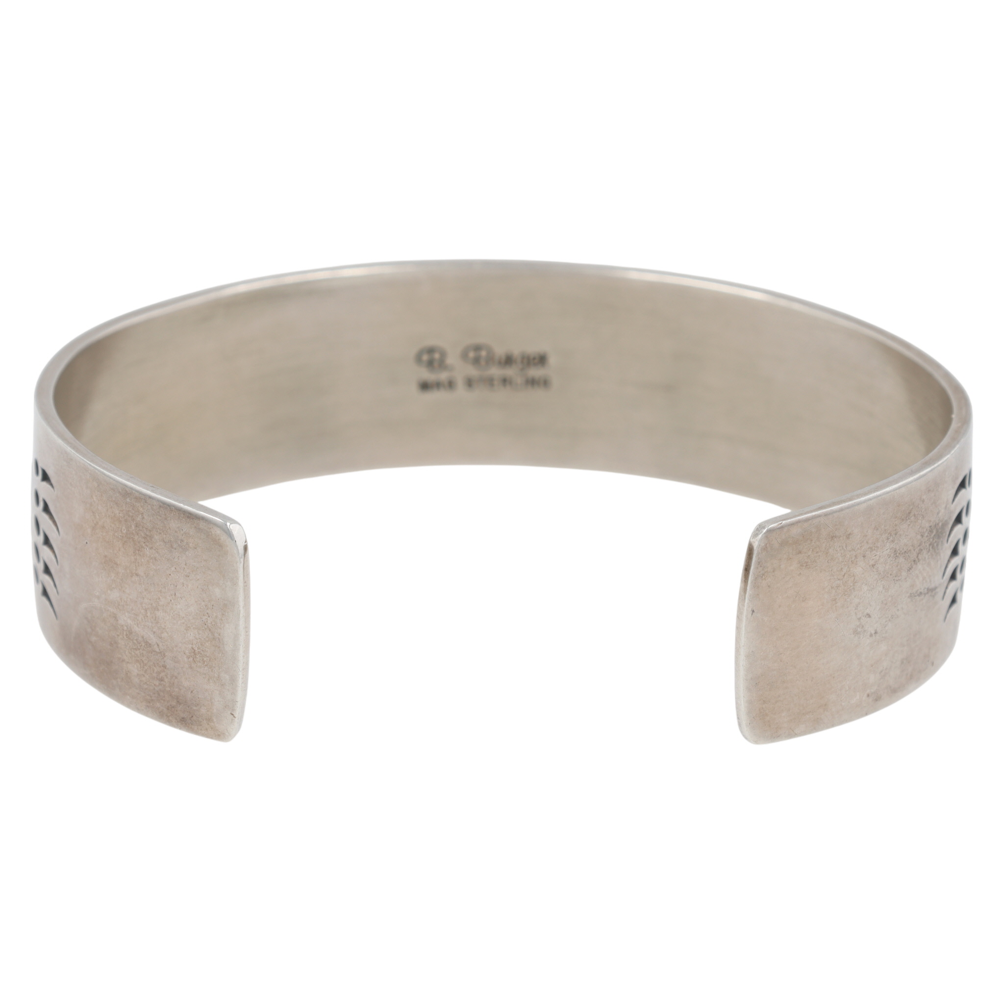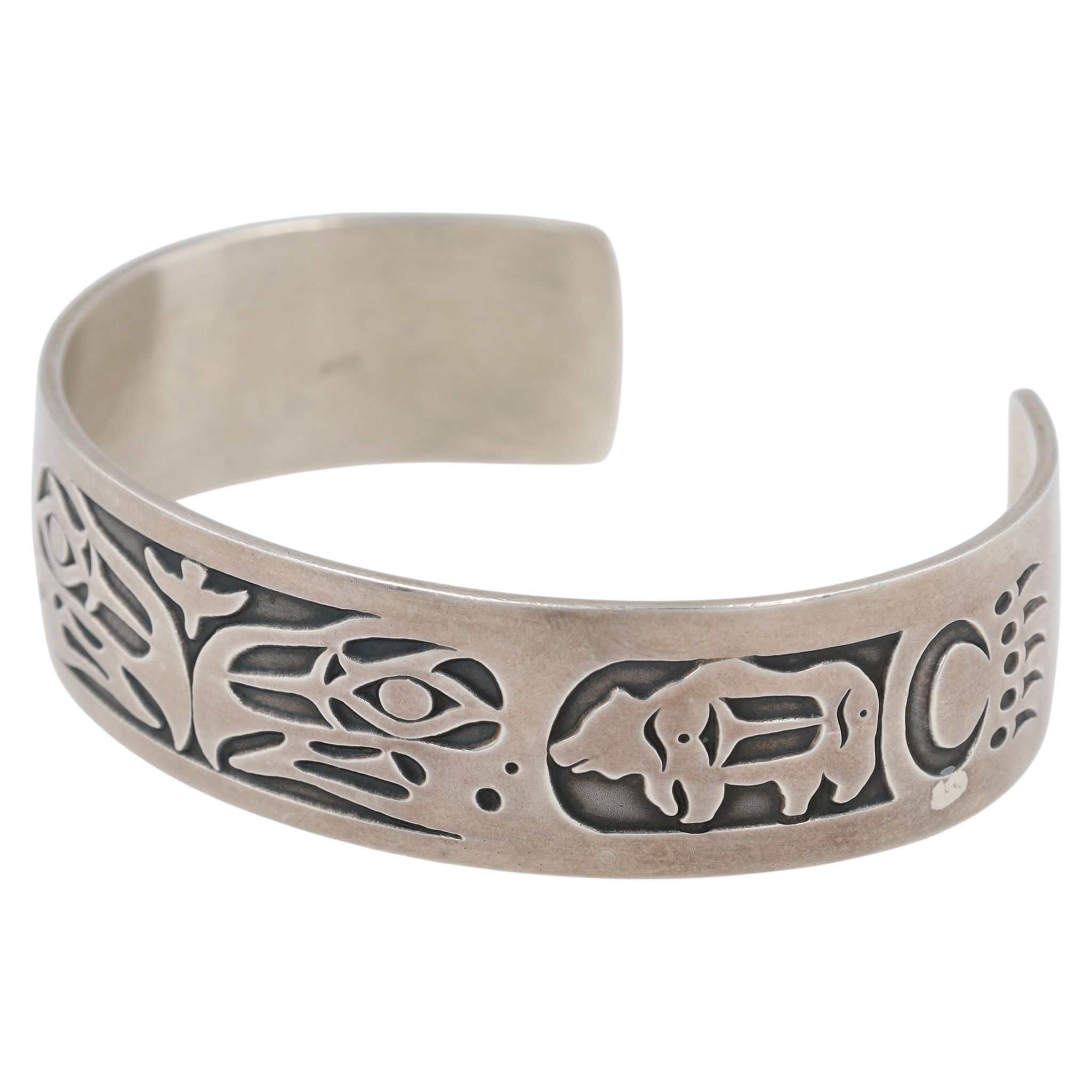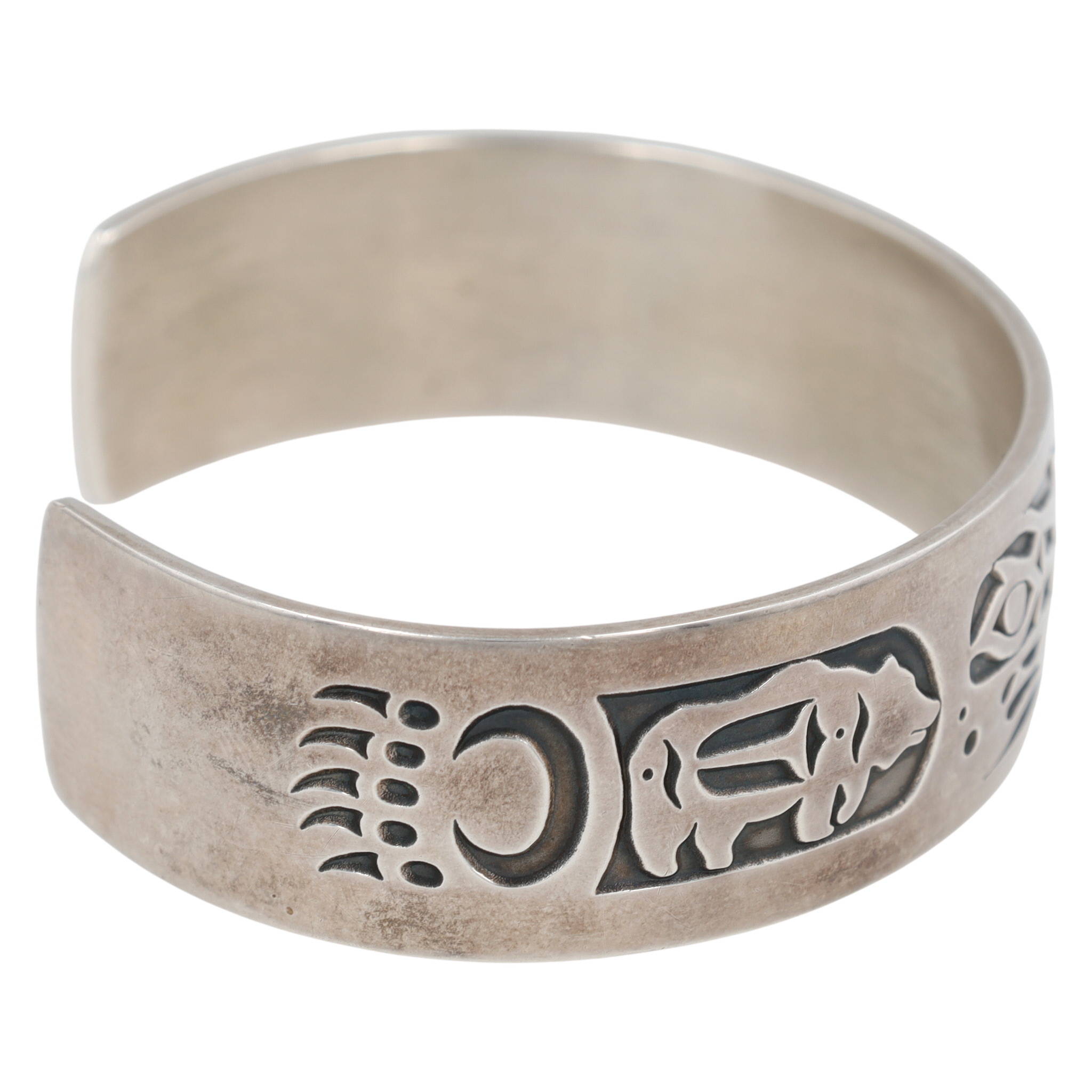 A Barry Burger Pacific Northwest sterling cuff bracelet featuring engraved stylized animal patterns, inscribed on the inside with “B. Burger” and “MAG STERLING” for Metal Arts Group, measuring approximately 7 inches, and weighs 32g.