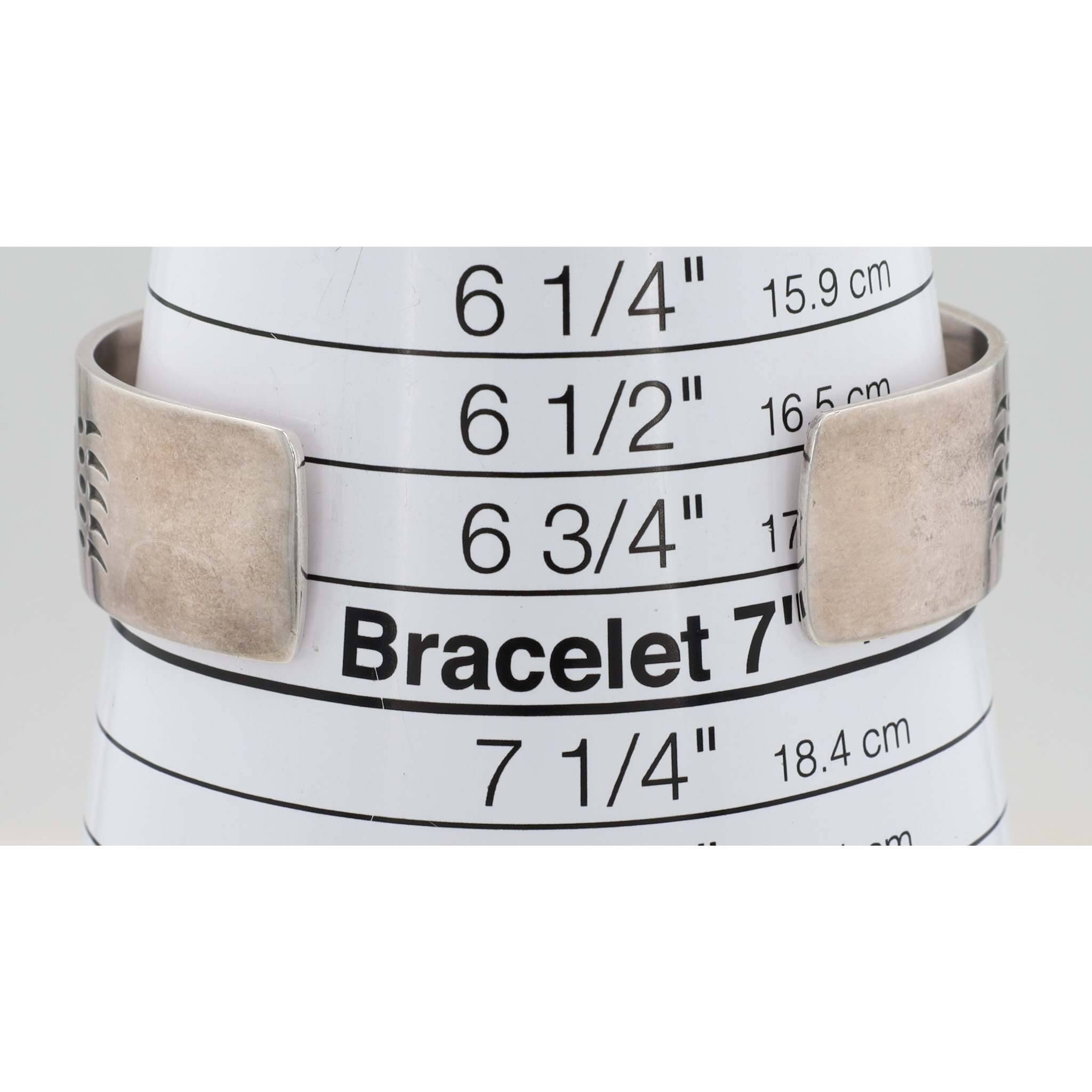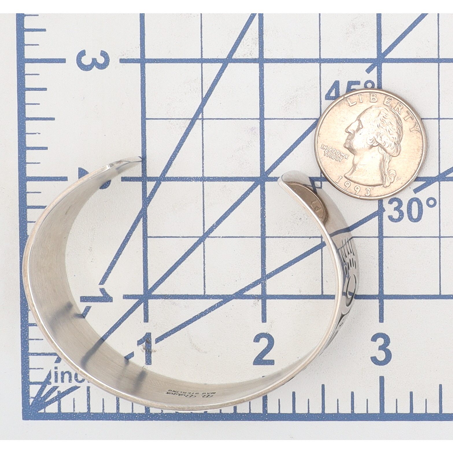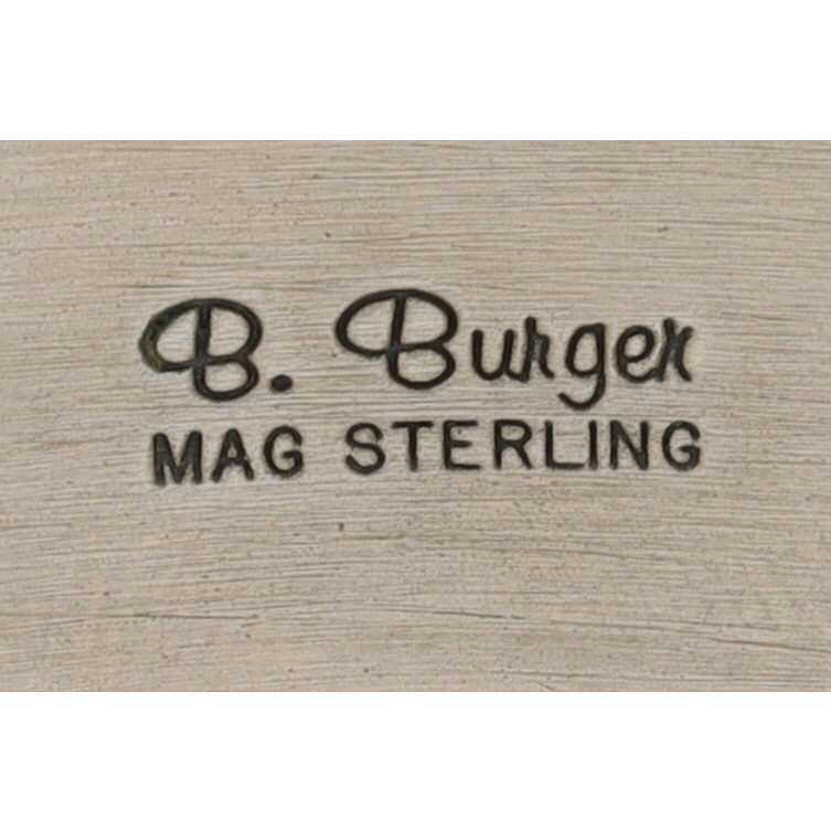 A Barry Burger Pacific Northwest sterling cuff bracelet featuring engraved stylized animal patterns, inscribed on the inside with “B. Burger” and “MAG STERLING” for Metal Arts Group, measuring approximately 7 inches, and weighs 32g.