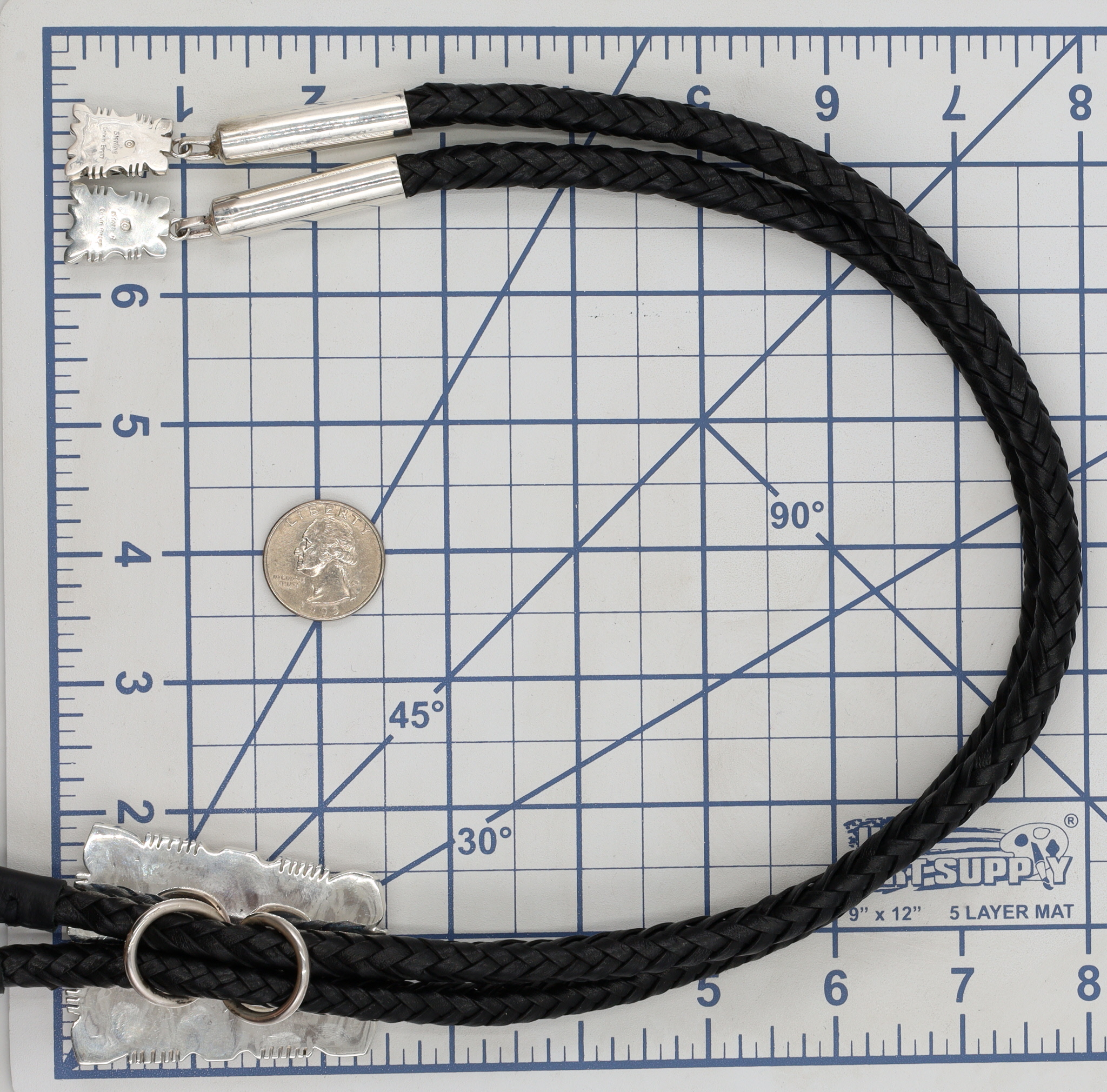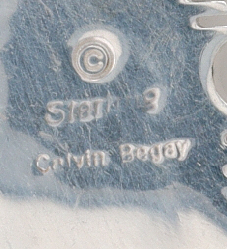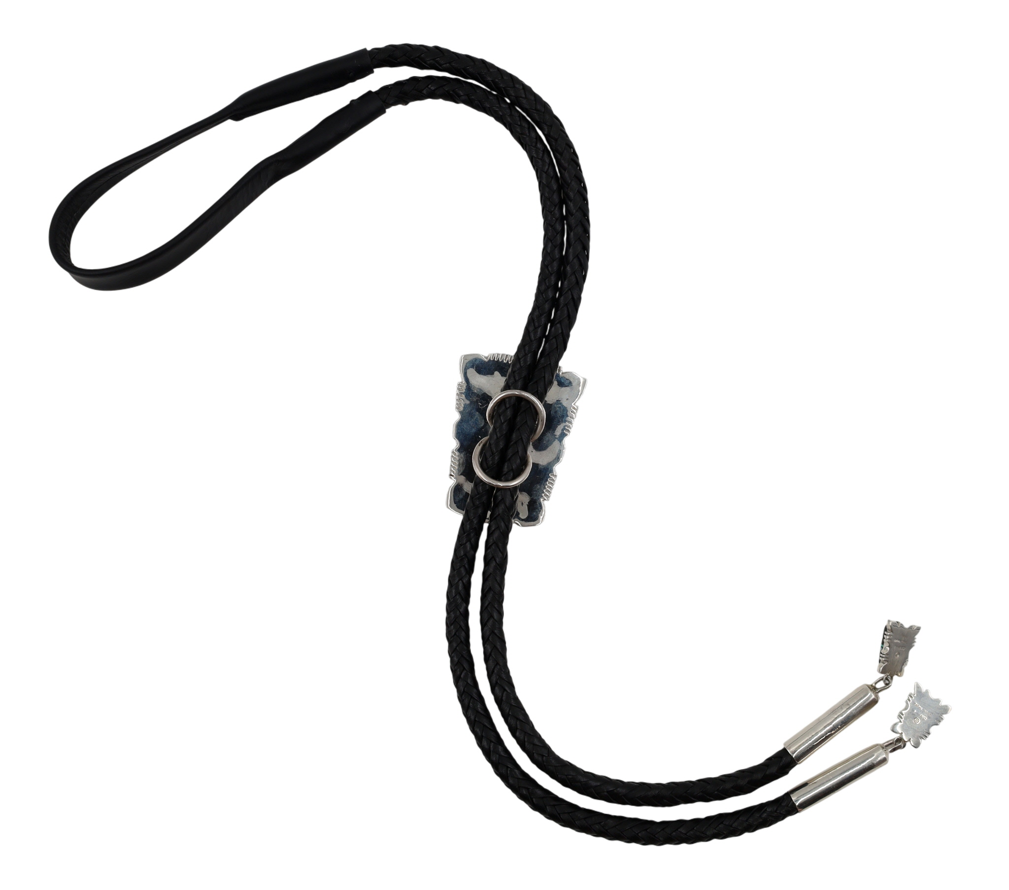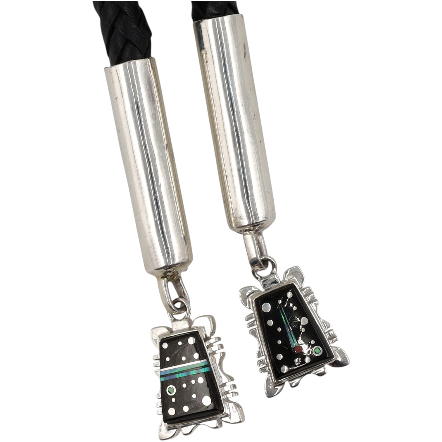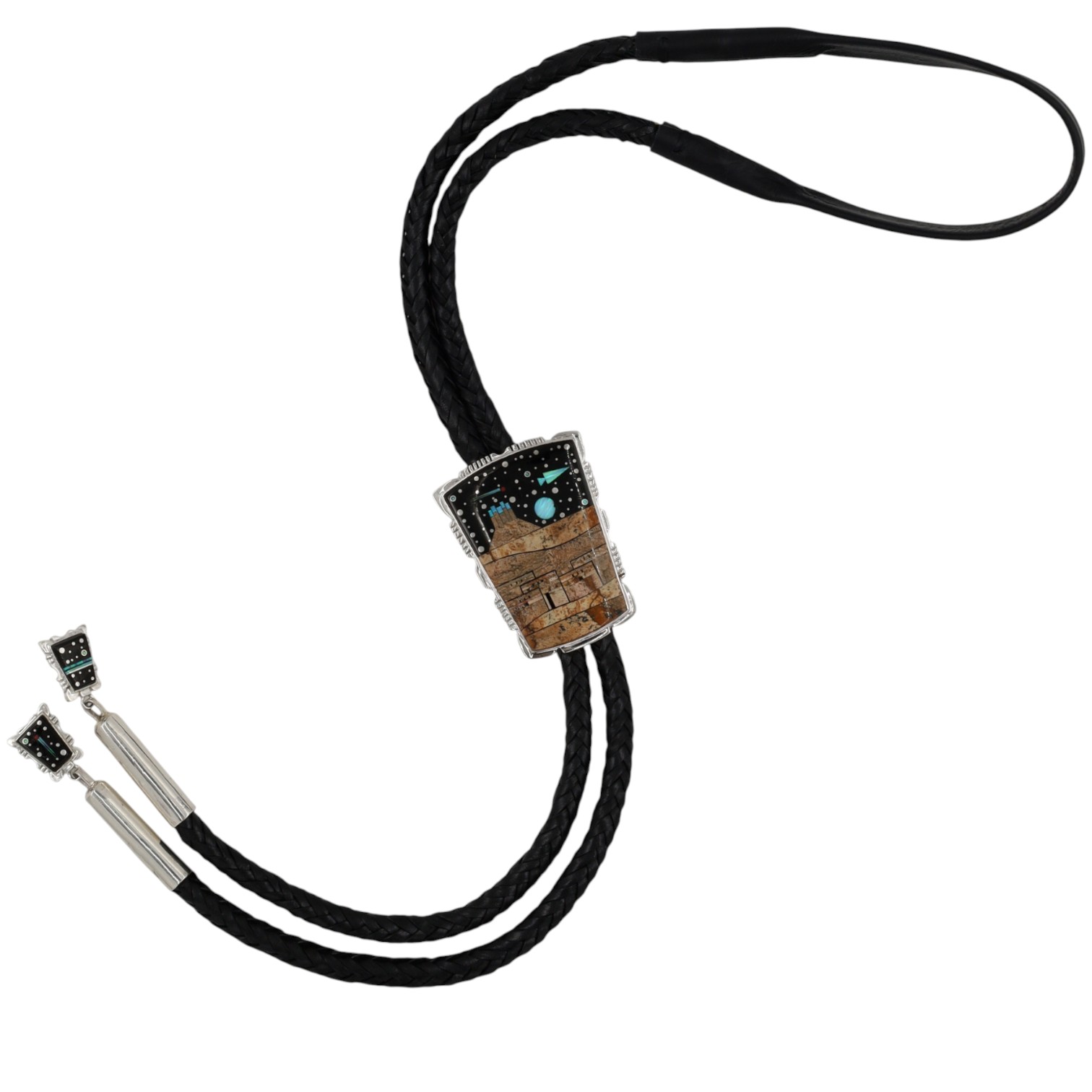 Calvin Begay Navajo Sterling bolo tie depicting a landscape under a starry sky made up picture jasper, opal, coral, onyx, marked “© STERLING” and “Calvin Begay”, weighing 131.5g, with the main slide measuring approximately 1.5 x 2 inches, and a tie length of 24.5 inches.