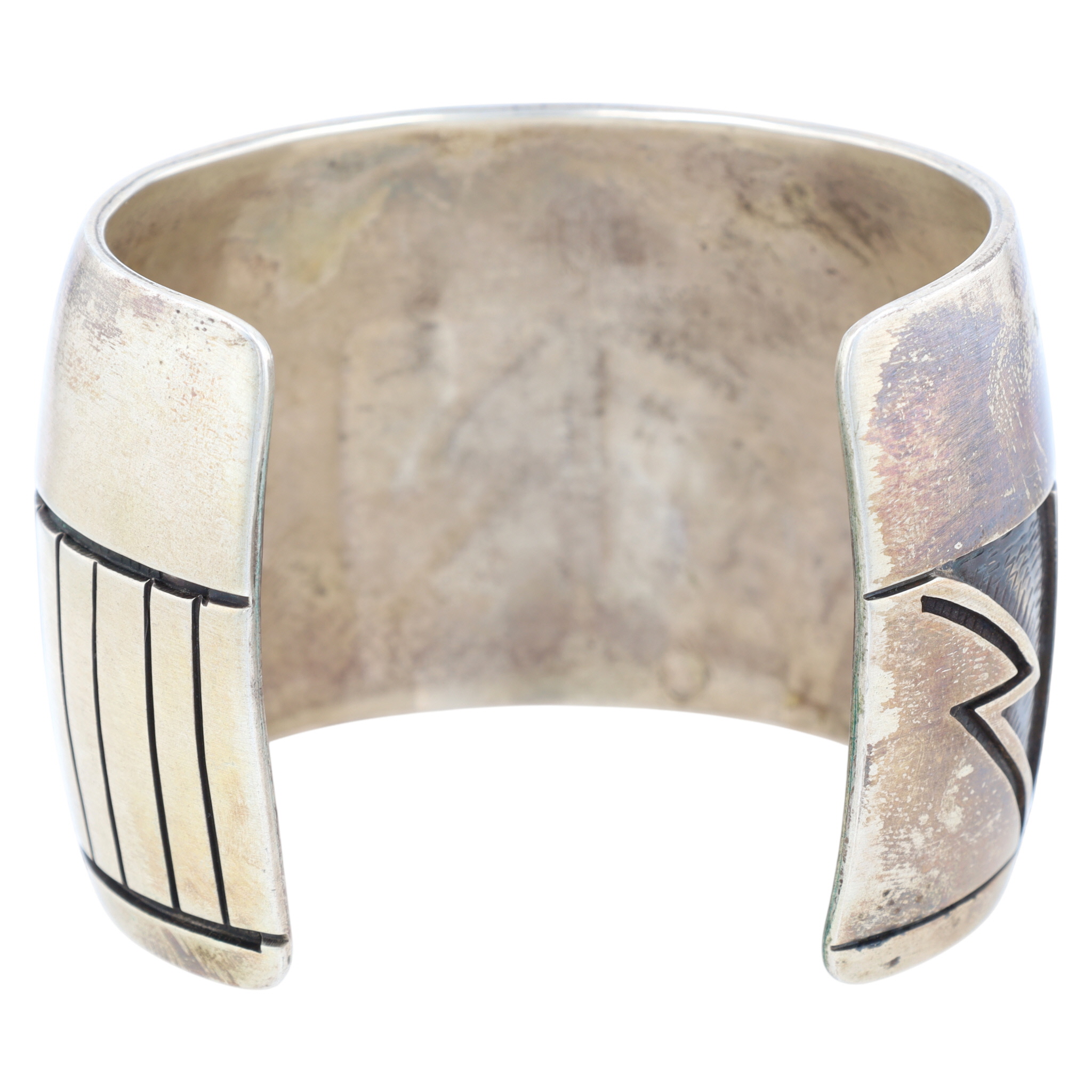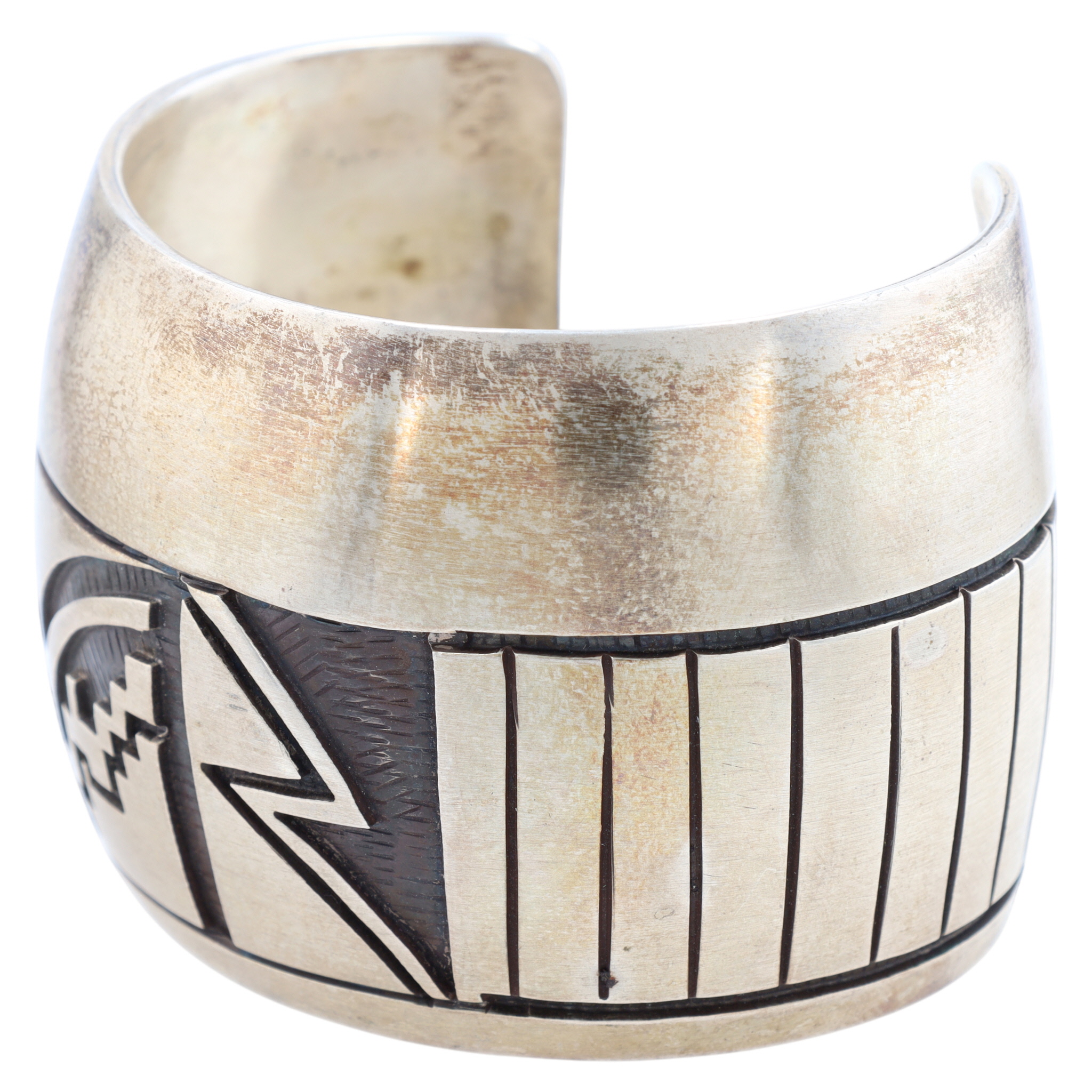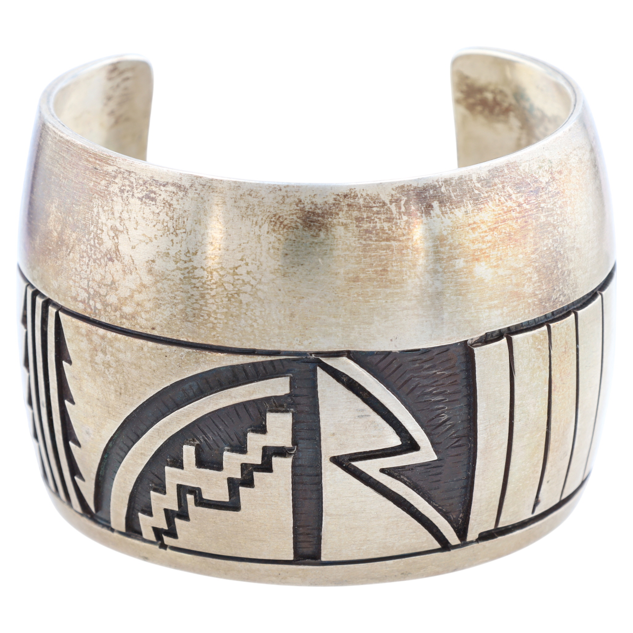 A wide Hopi sterling silver overlay cuff bracelet with dark oxidized geometric patterns by renowned artist Manuel Hoyungowa, featuring an impressed maker’s mark resembling a stylized thundercloud on its interior, weighing 102g and fitting approximately a 6-inch wrist.