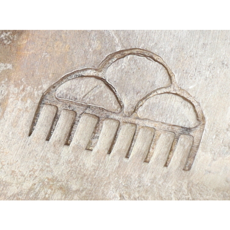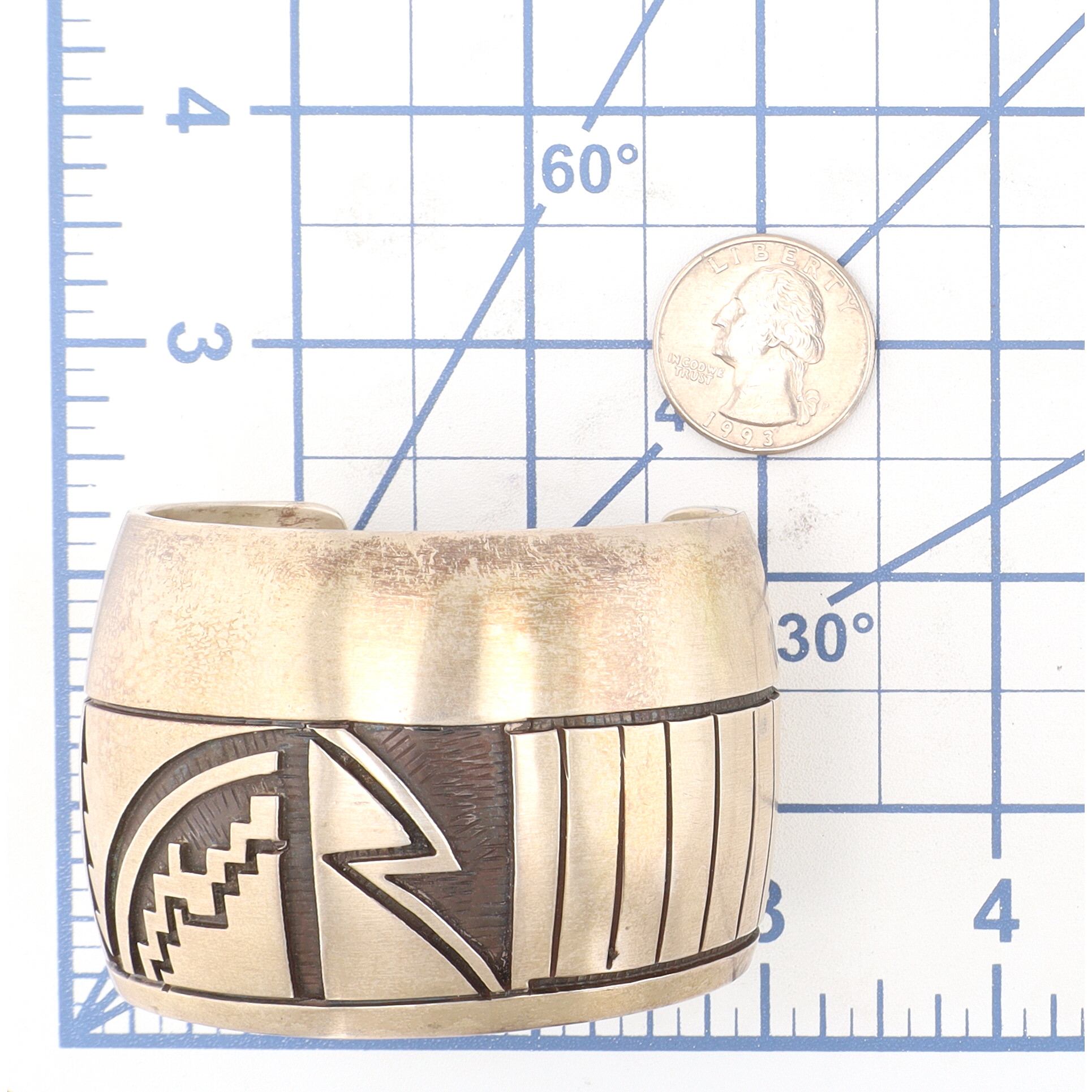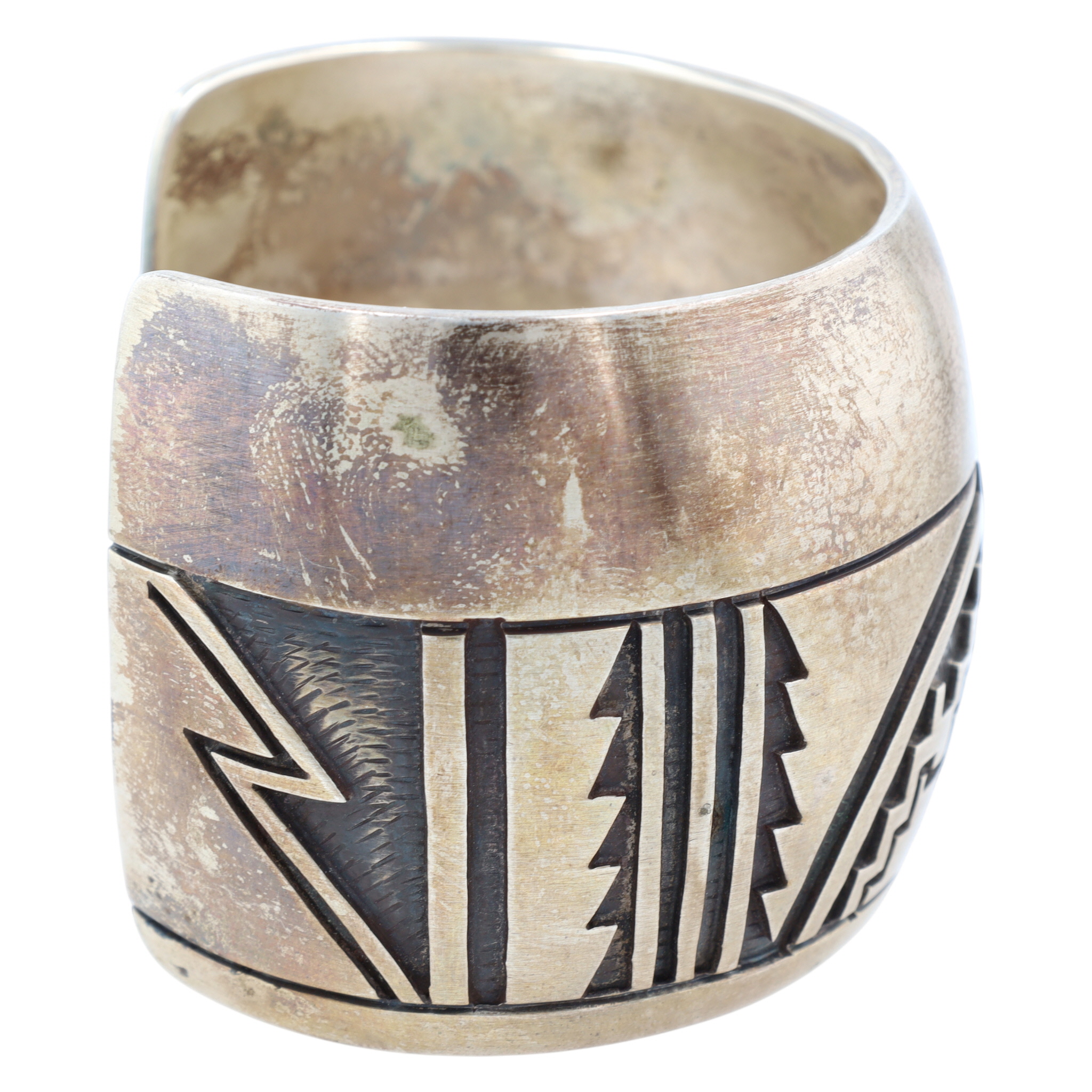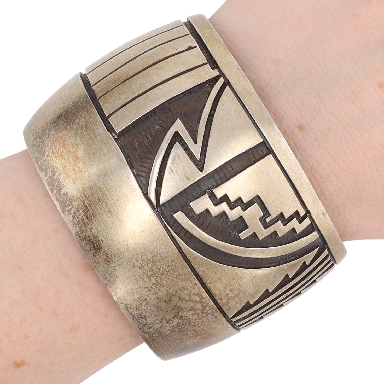 A wide Hopi sterling silver overlay cuff bracelet with dark oxidized geometric patterns by renowned artist Manuel Hoyungowa, featuring an impressed maker’s mark resembling a stylized thundercloud on its interior, weighing 102g and fitting approximately a 6-inch wrist.