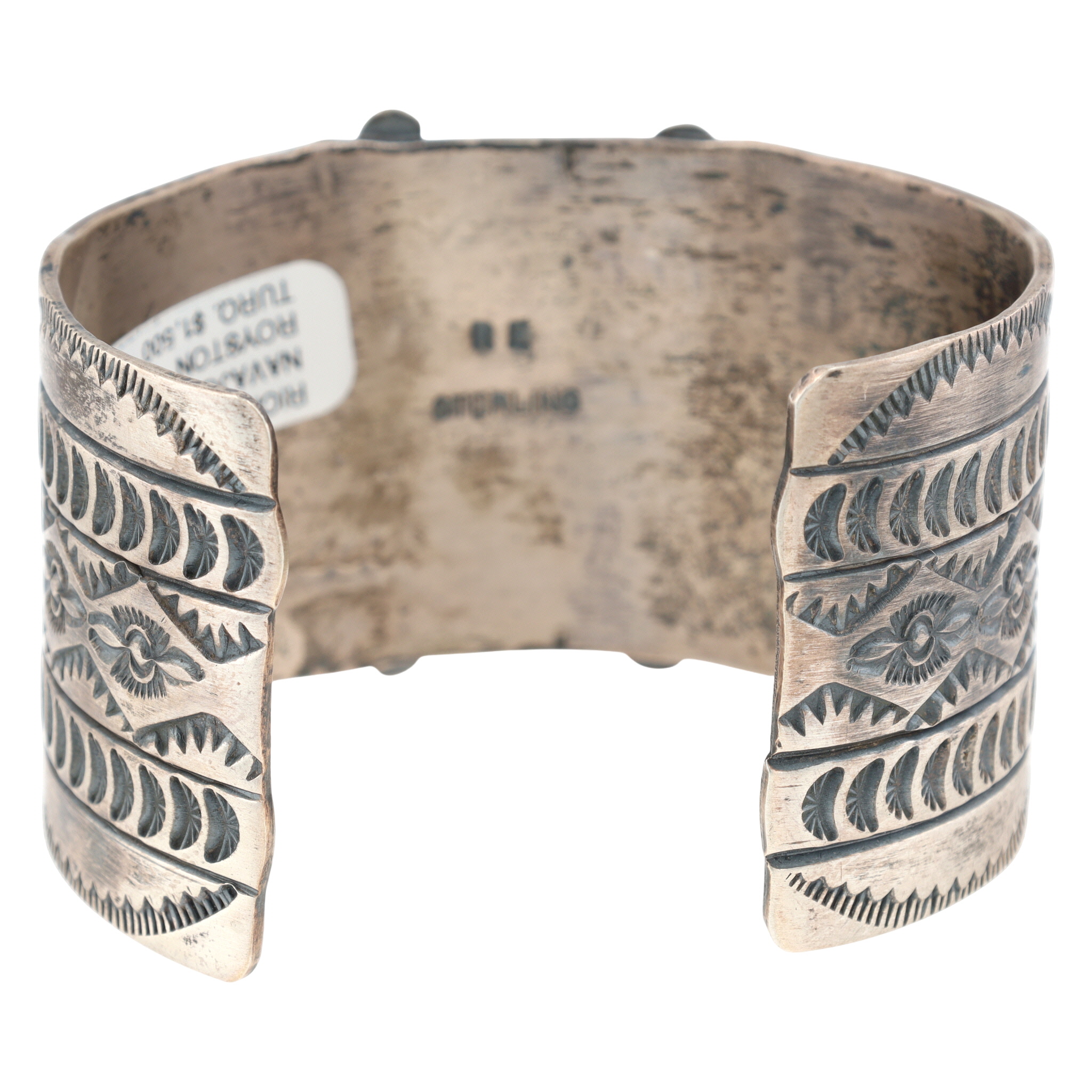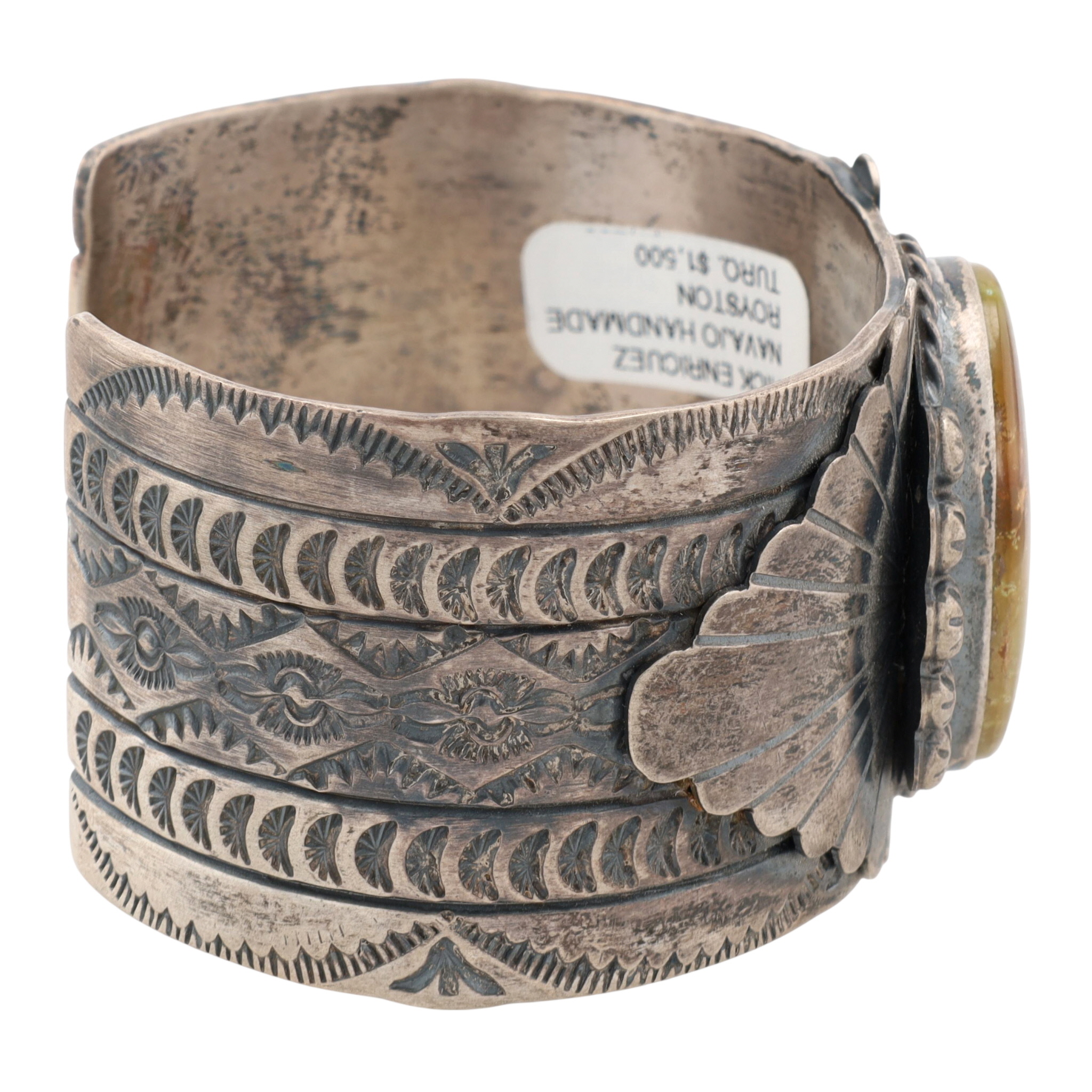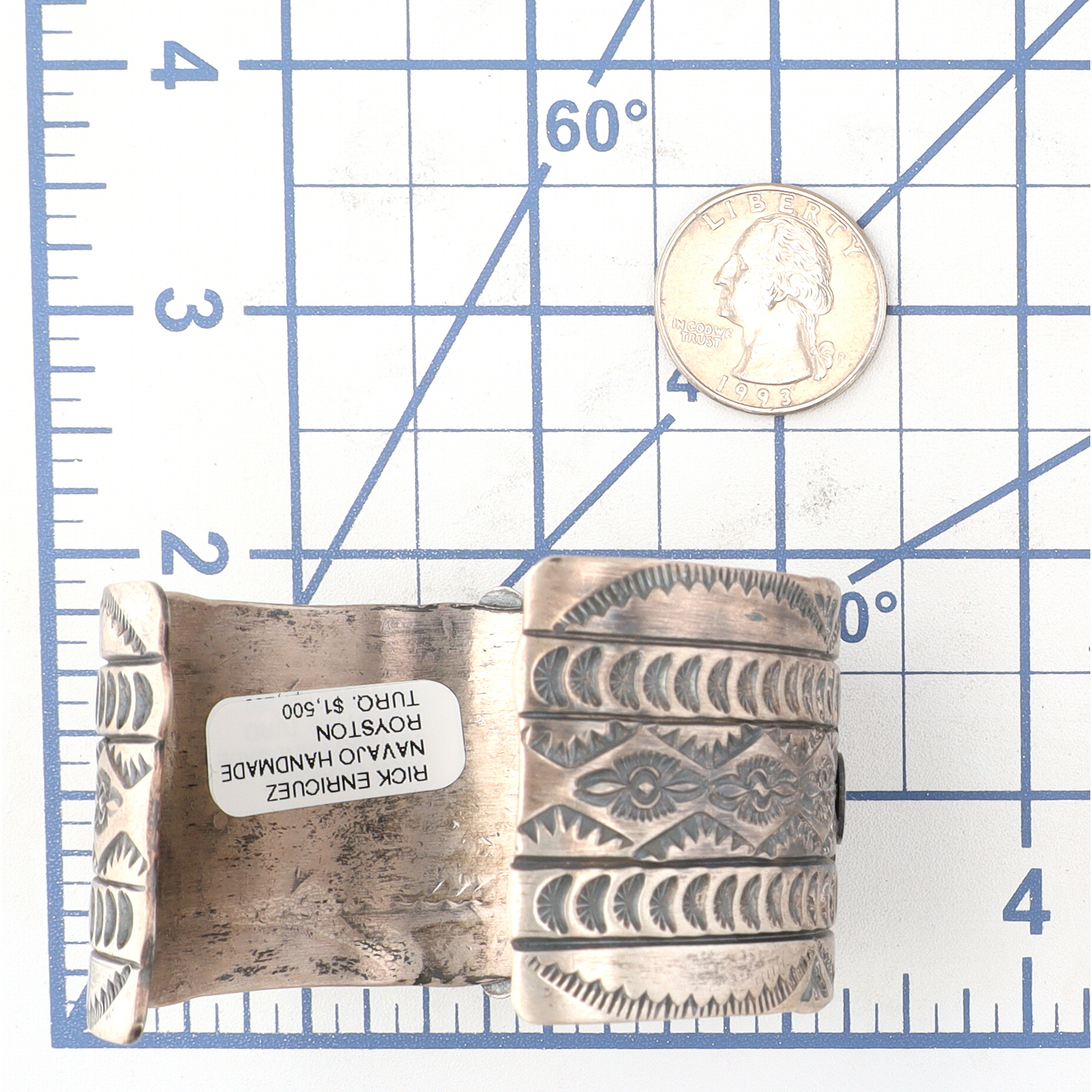 A single Navajo sterling silver cuff bracelet by Rick Enriquez features an olive green/brown mottled Royston turquoise stone, inscribed ‘RE’ and ‘STERLING’, measuring approximately 6 1/2 to 6 3/4 inches, weighing 111g.