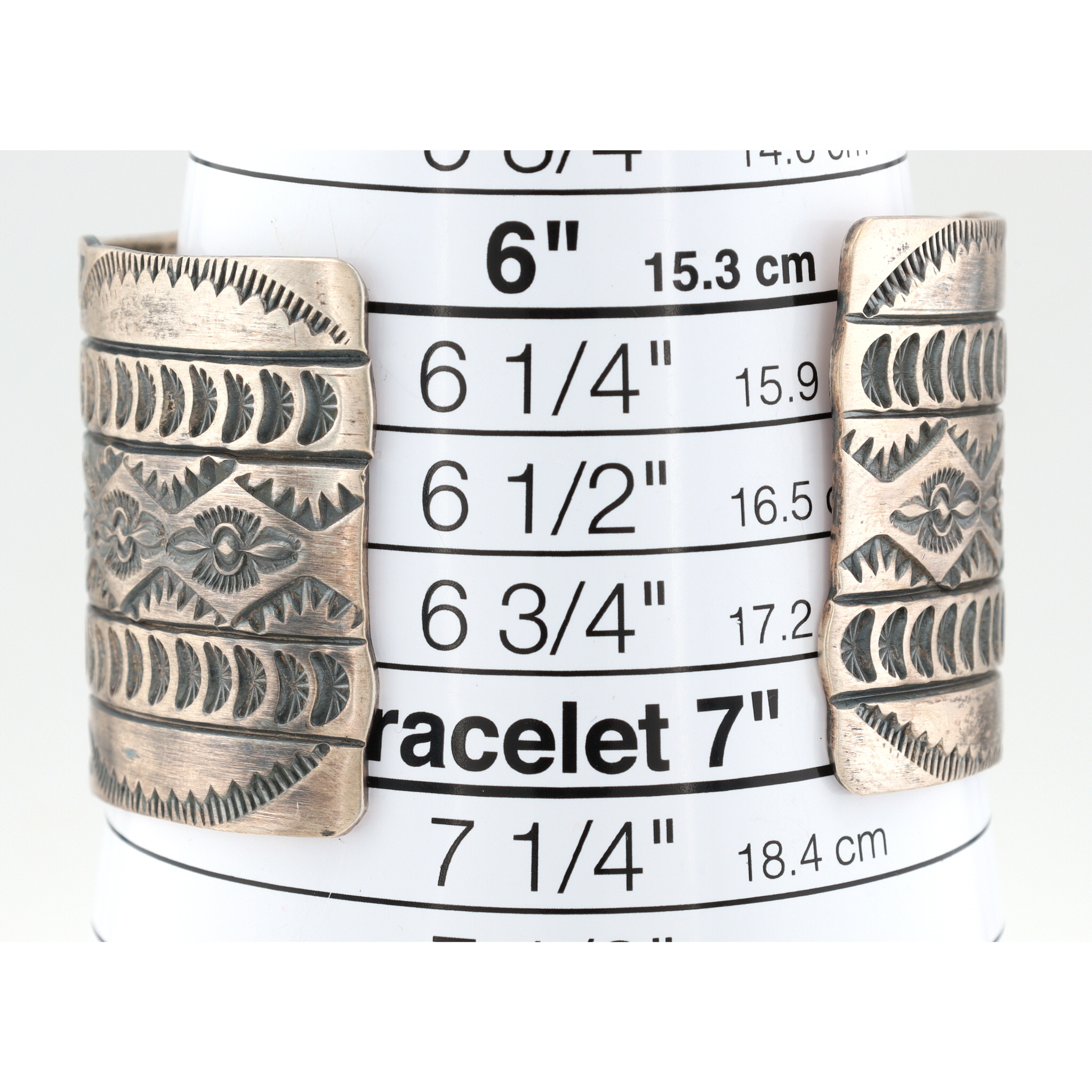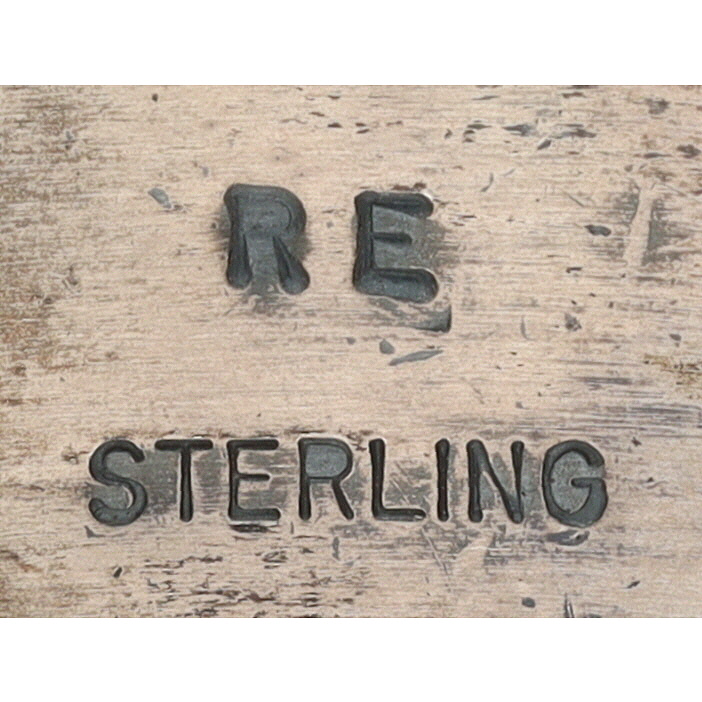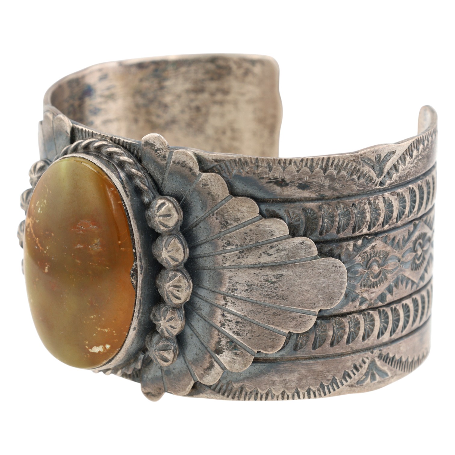 A single Navajo sterling silver cuff bracelet by Rick Enriquez features an olive green/brown mottled Royston turquoise stone, inscribed ‘RE’ and ‘STERLING’, measuring approximately 6 1/2 to 6 3/4 inches, weighing 111g.