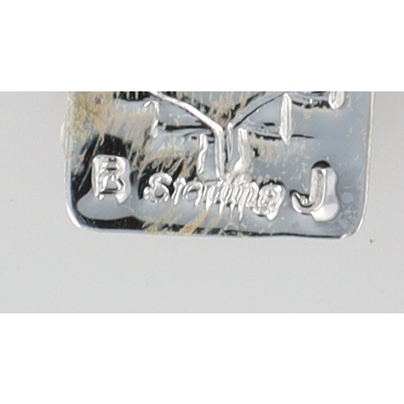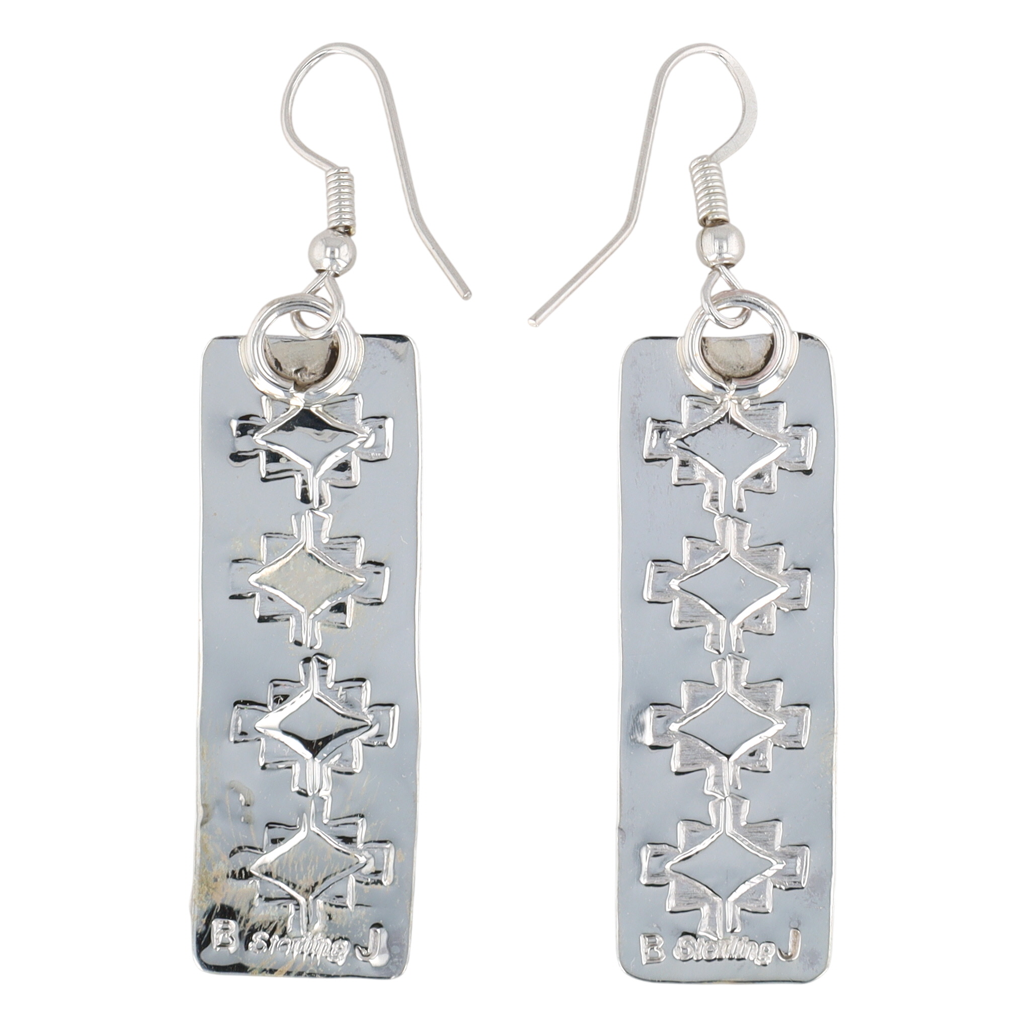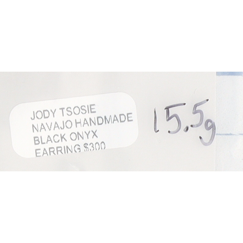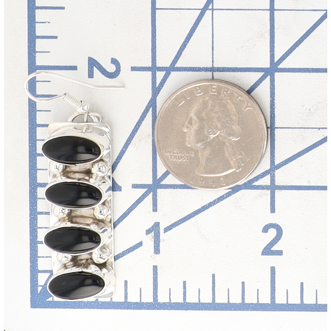 A pair of sterling silver dangle earrings, each featuring four oval black onyx stones, marked ‘B Sterling J’, weighing 15.5g total, and measuring approximately 1.75 inches long.