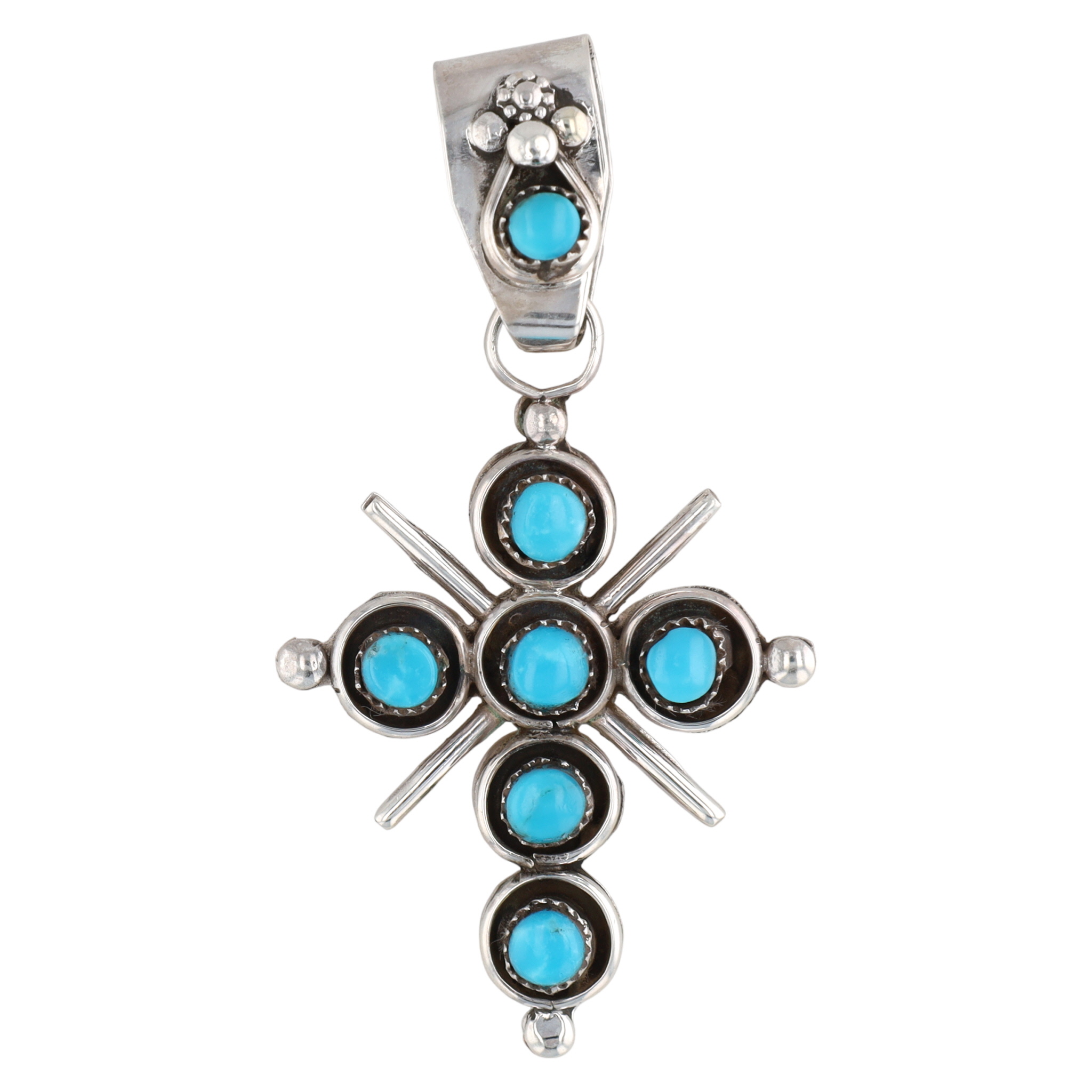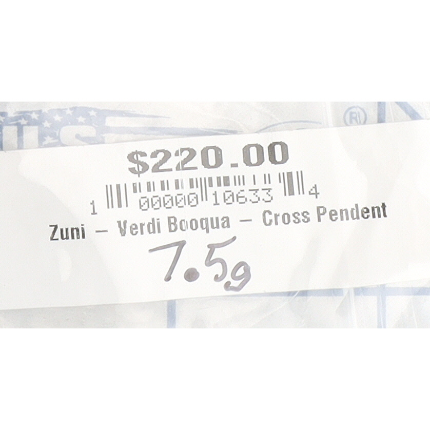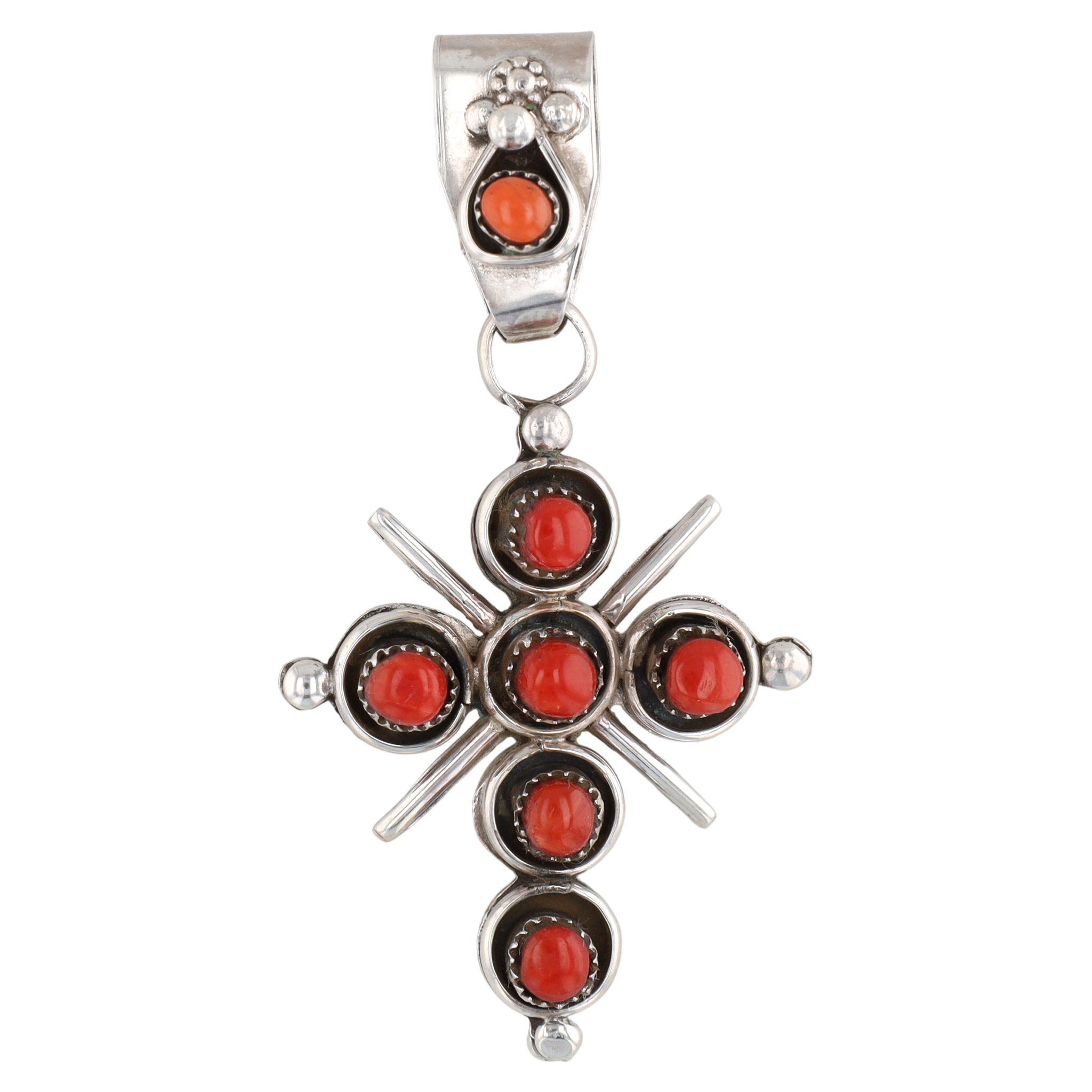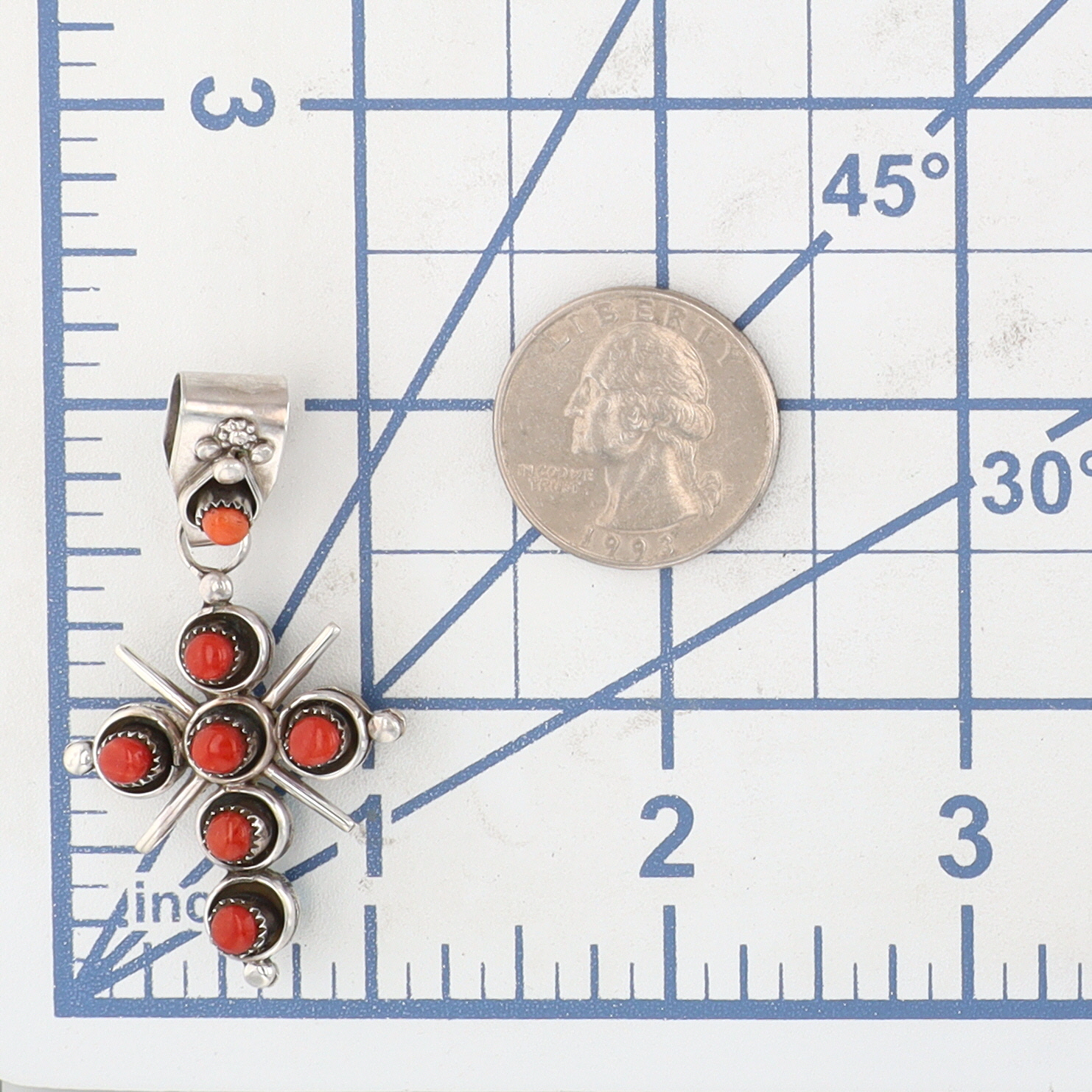 A Zuni sterling silver reversible cross pendant by Verdi Booqua, featuring red coral and turquoise cabochon stones, measuring approximately 1.75 inches long and weighing 7.5g.