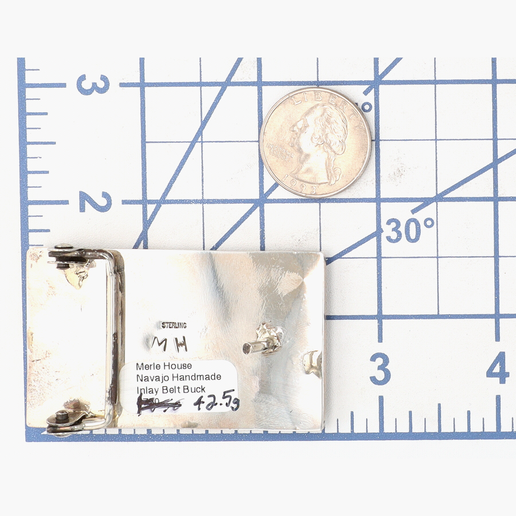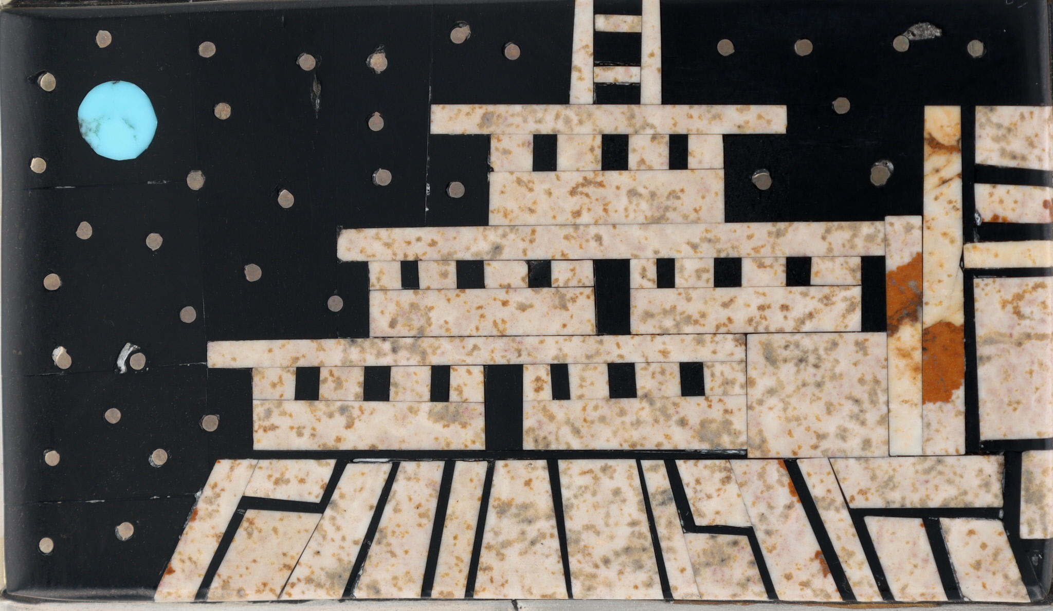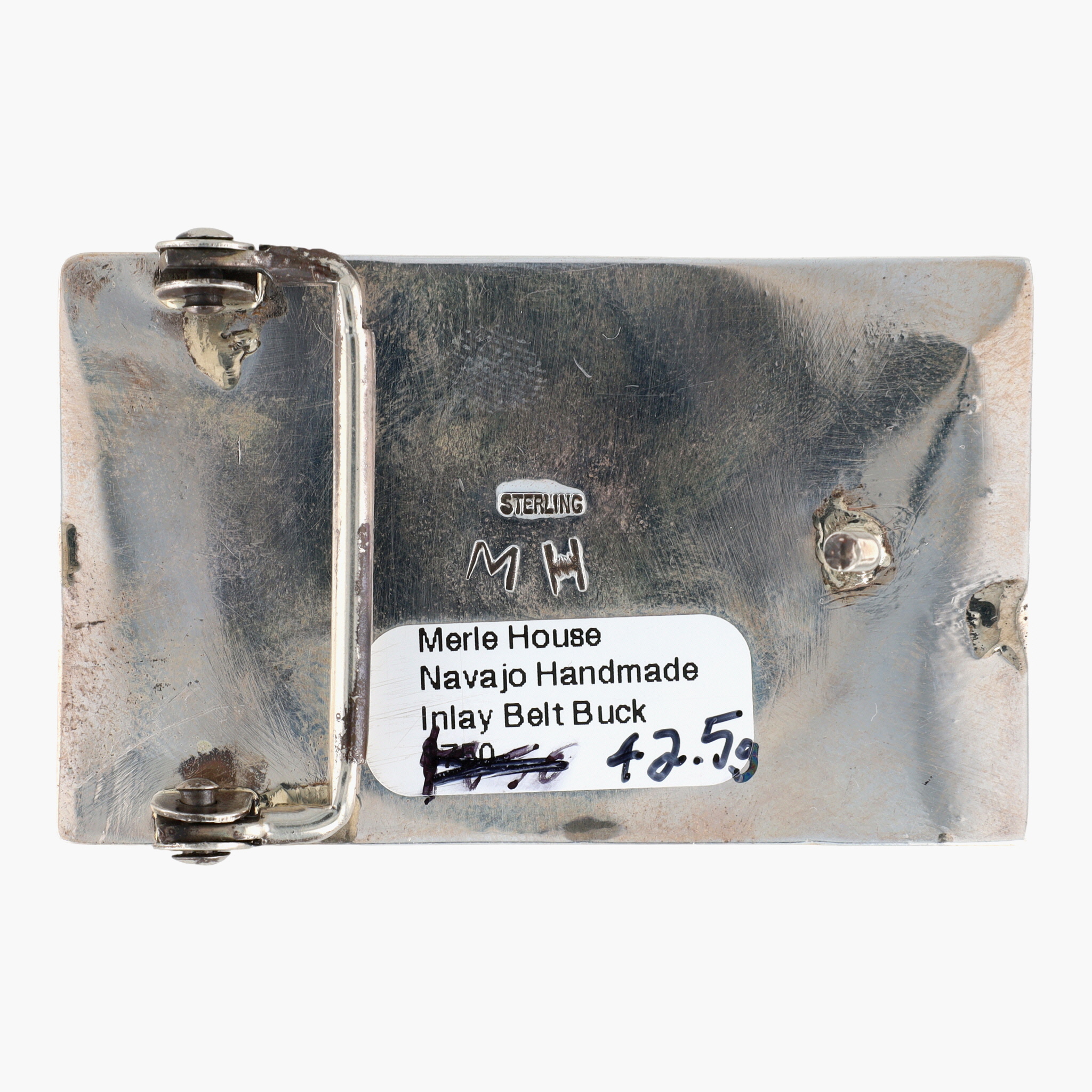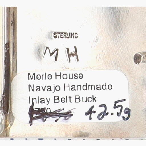 A sterling silver belt buckle with a jet and picture jasper inlaid design of a building under a night sky with a turquoise moon, marked “MH”, identified by a label as “Merle House Navajo Handmade Inlay Belt Buck”, weighing 42.5g, and measuring approximately 2.5 x 1.5 inches.
