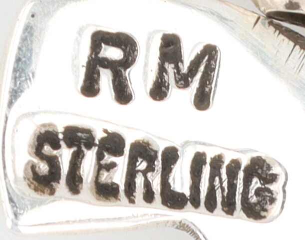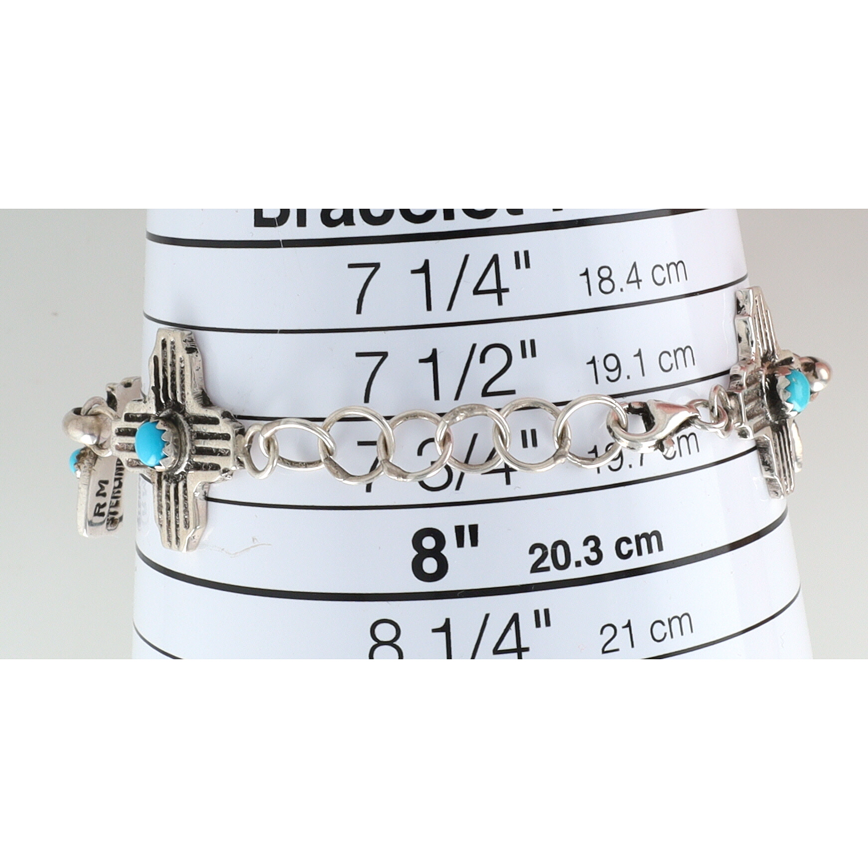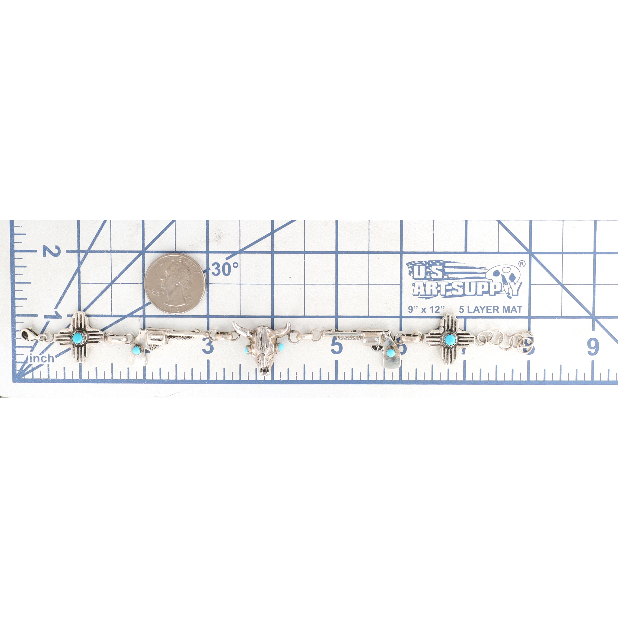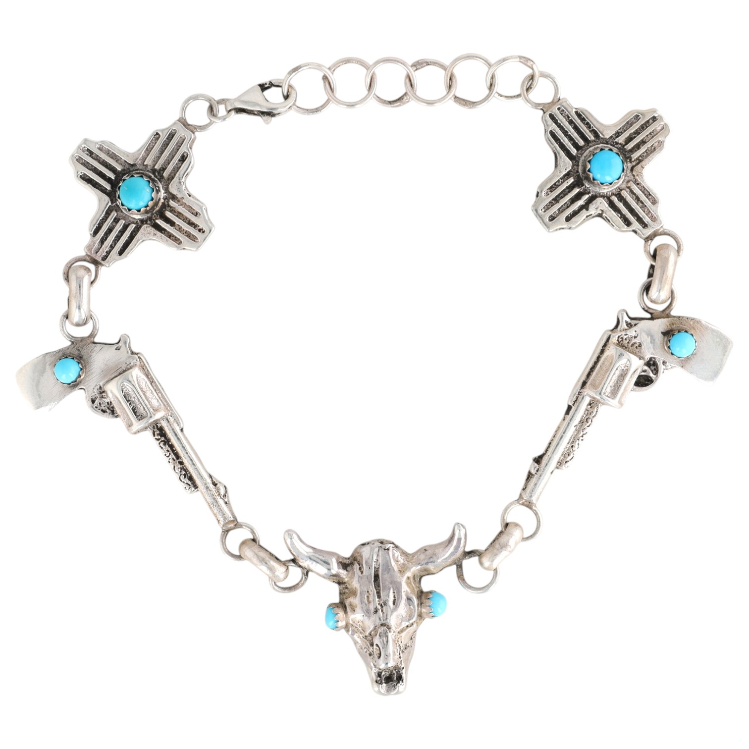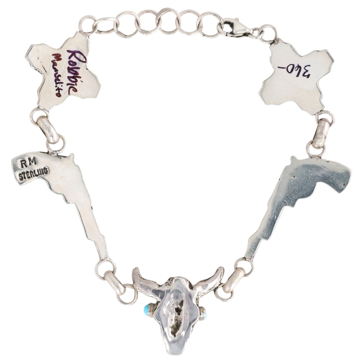 A sterling silver bracelet adorned with two stylized crosses, two pistols, and a bull skull, accented with turquoise, marked “RM STERLING” and handwritten “Robbie Manselito”, measuring approximately 7.5 inches long, weighing 25.5g.