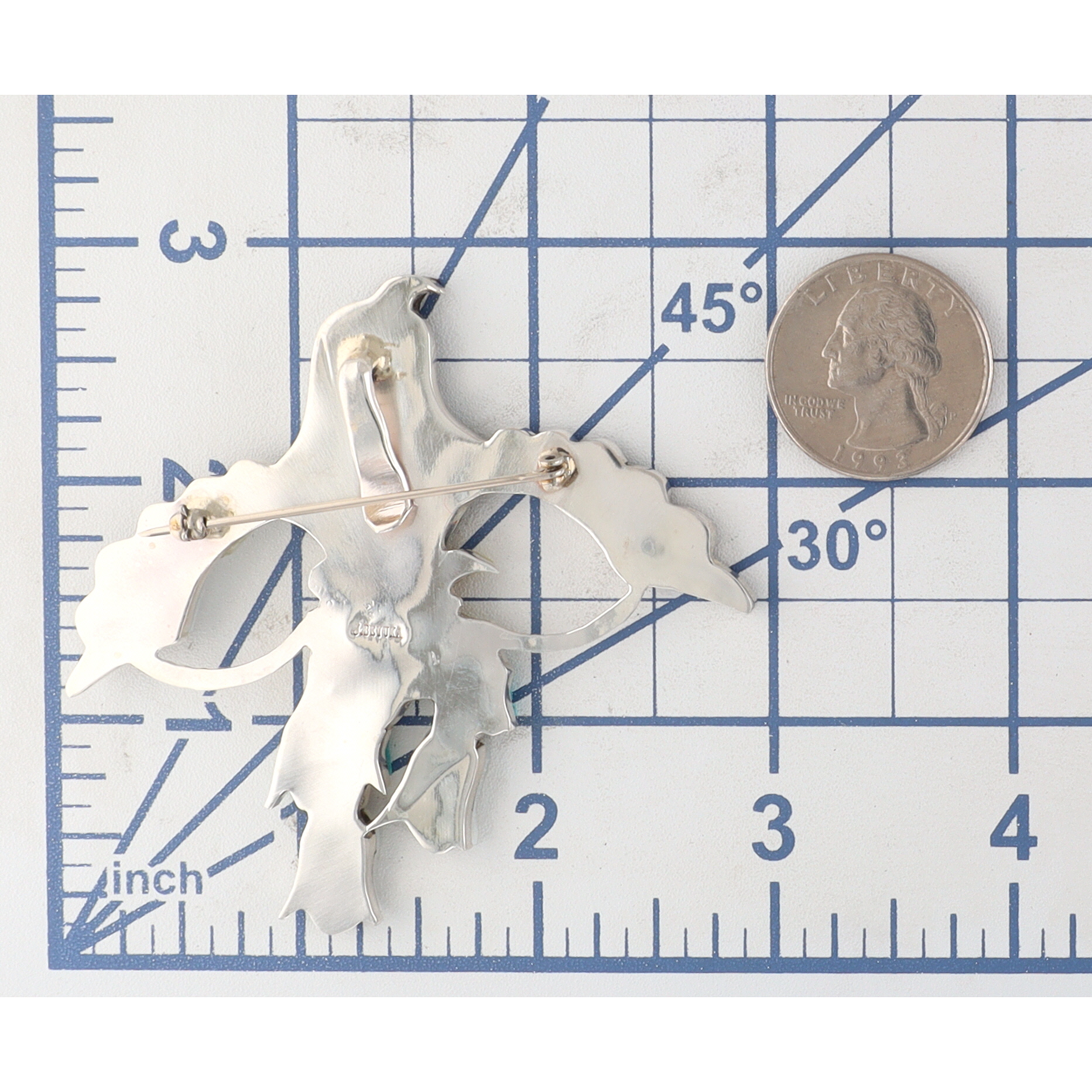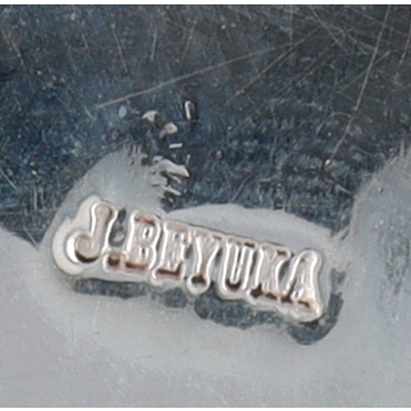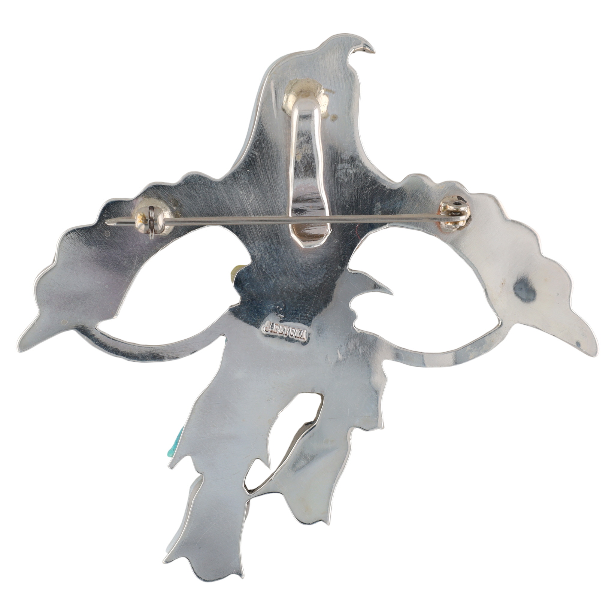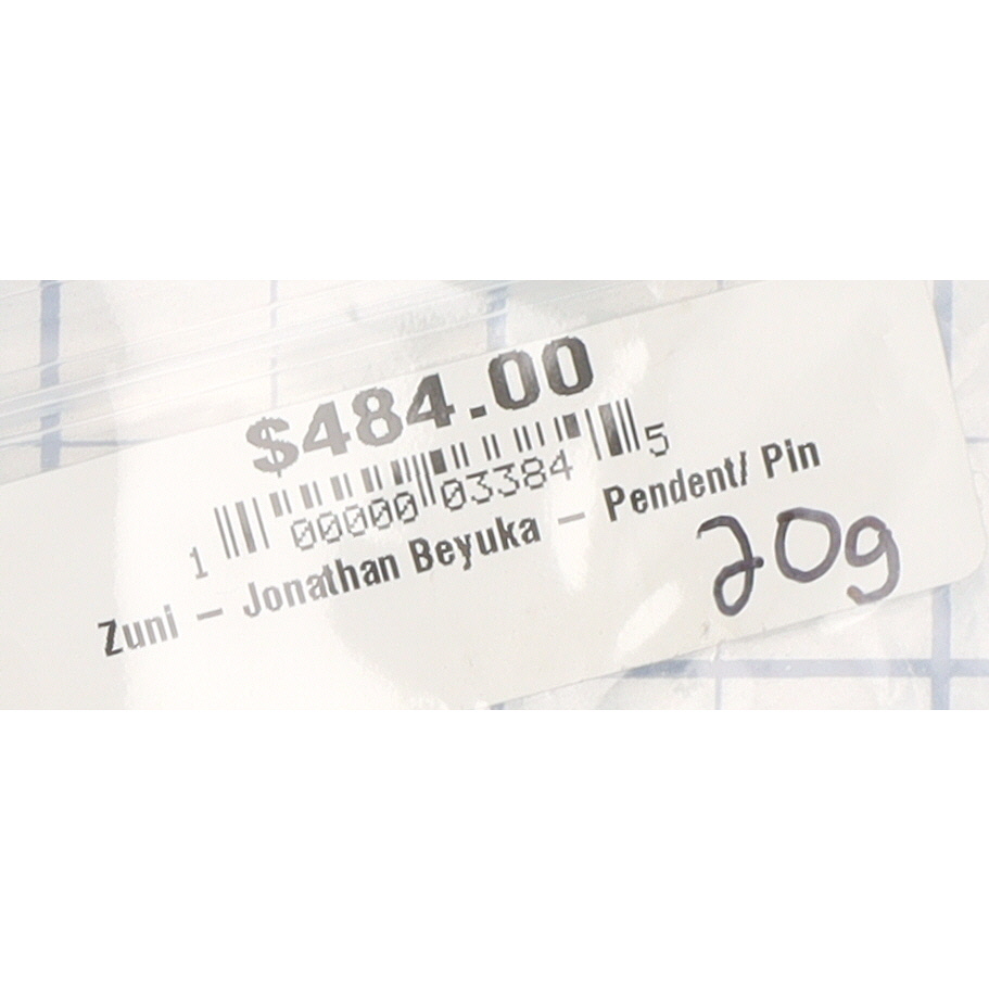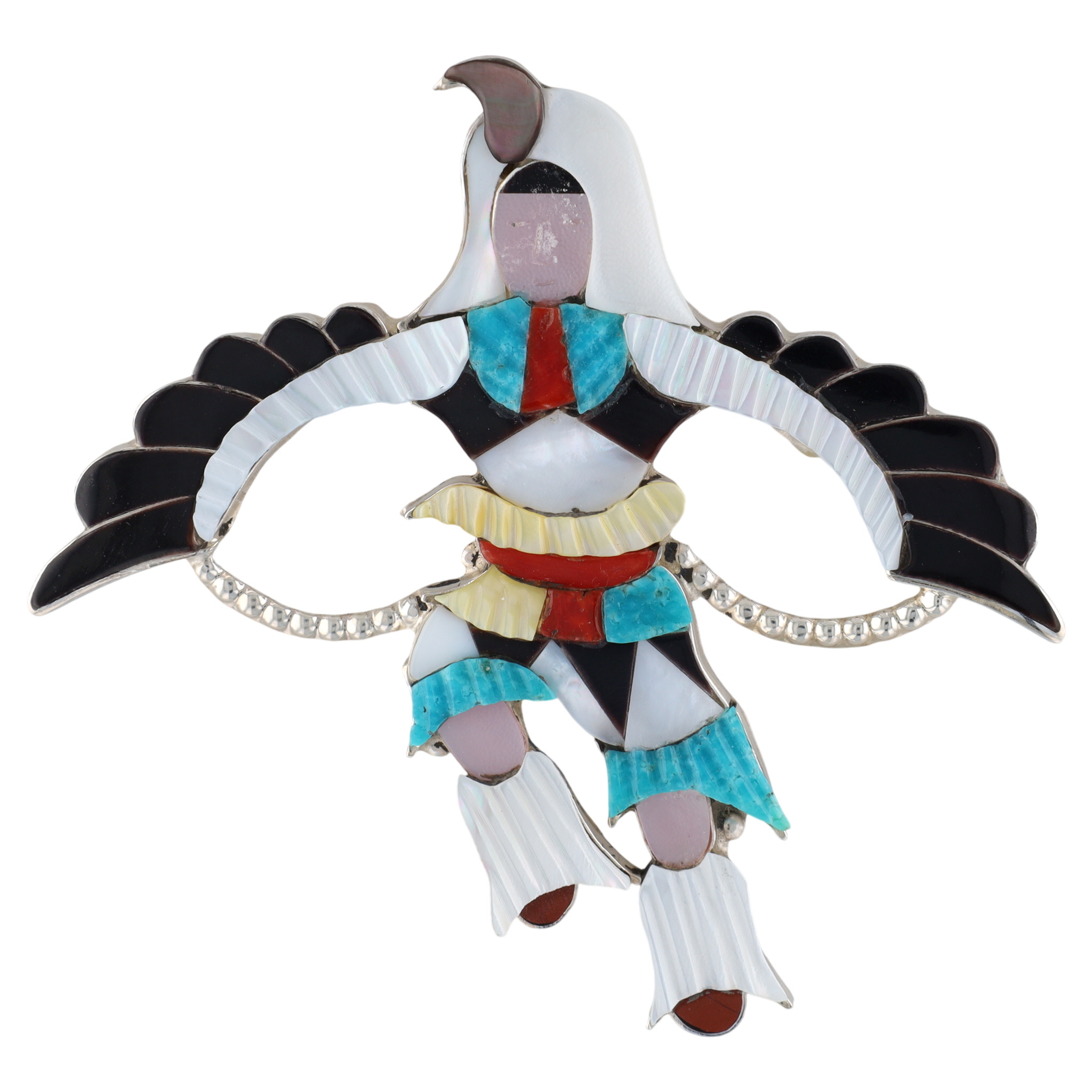 A multi-stone inlaid Zuni silver pendant/pin depicting an eagle dancer, primarily in mother-of-pearl, onyx, abalone, coral, and turquoise, marked ‘J. BEYUKA’, measuring approximately 2.5 inches wide, weighing 20g