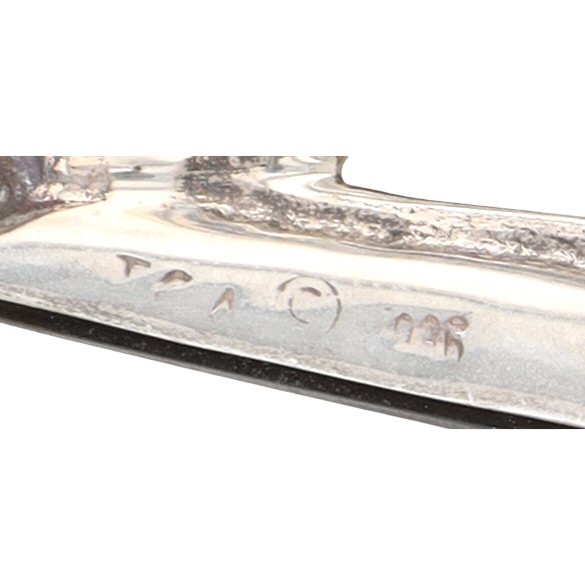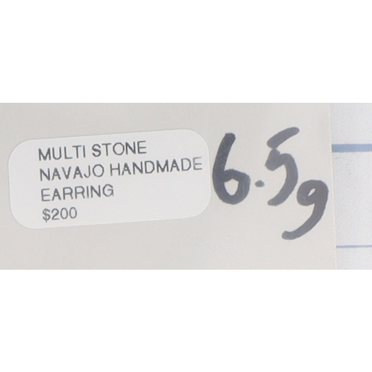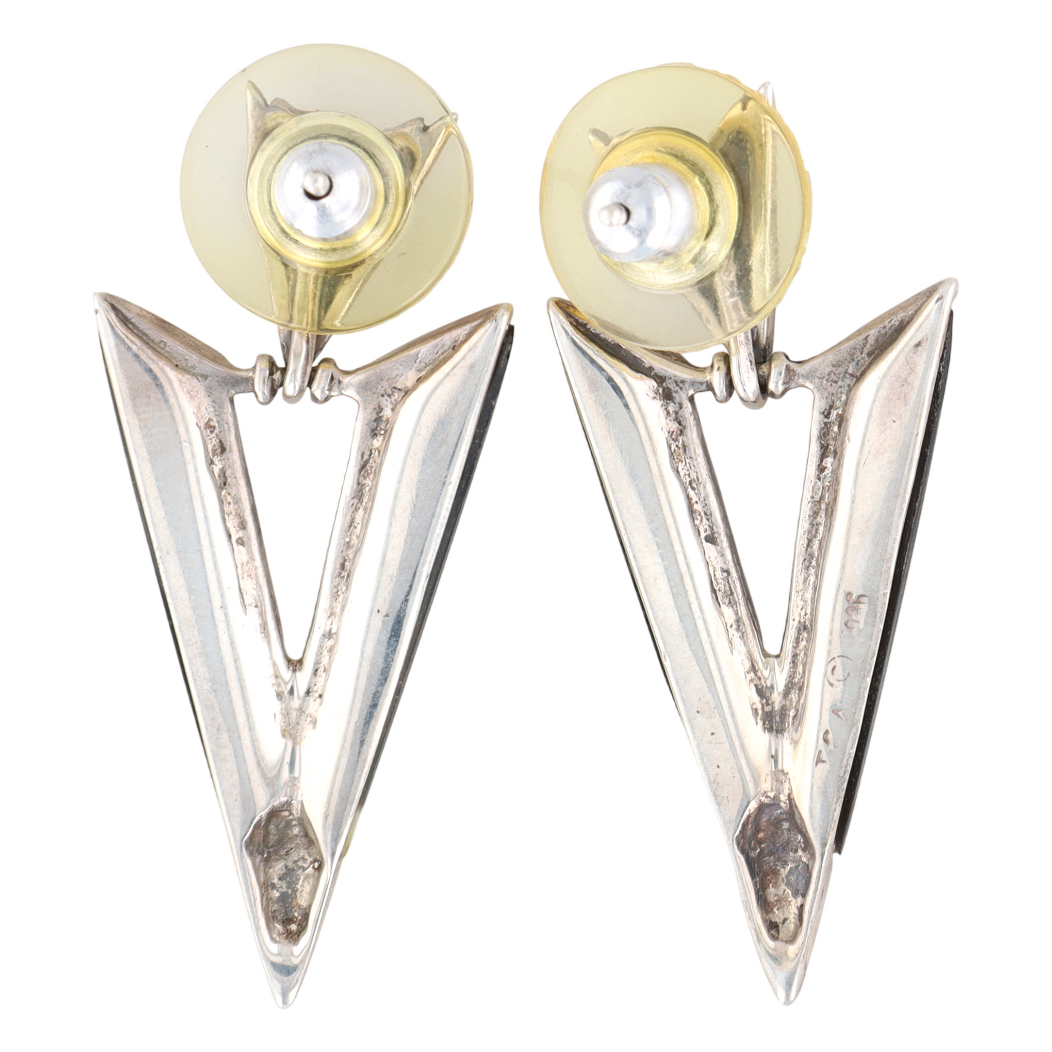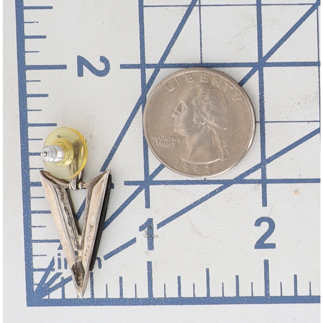 A pair of vintage V-shaped Zuni handmade sterling silver earrings for The Cut Above shop with black onyx inlay and small opal accents, marked “T.C.A.” and “925”, weighing 6.5g and measuring approximately 1.5 inches long.