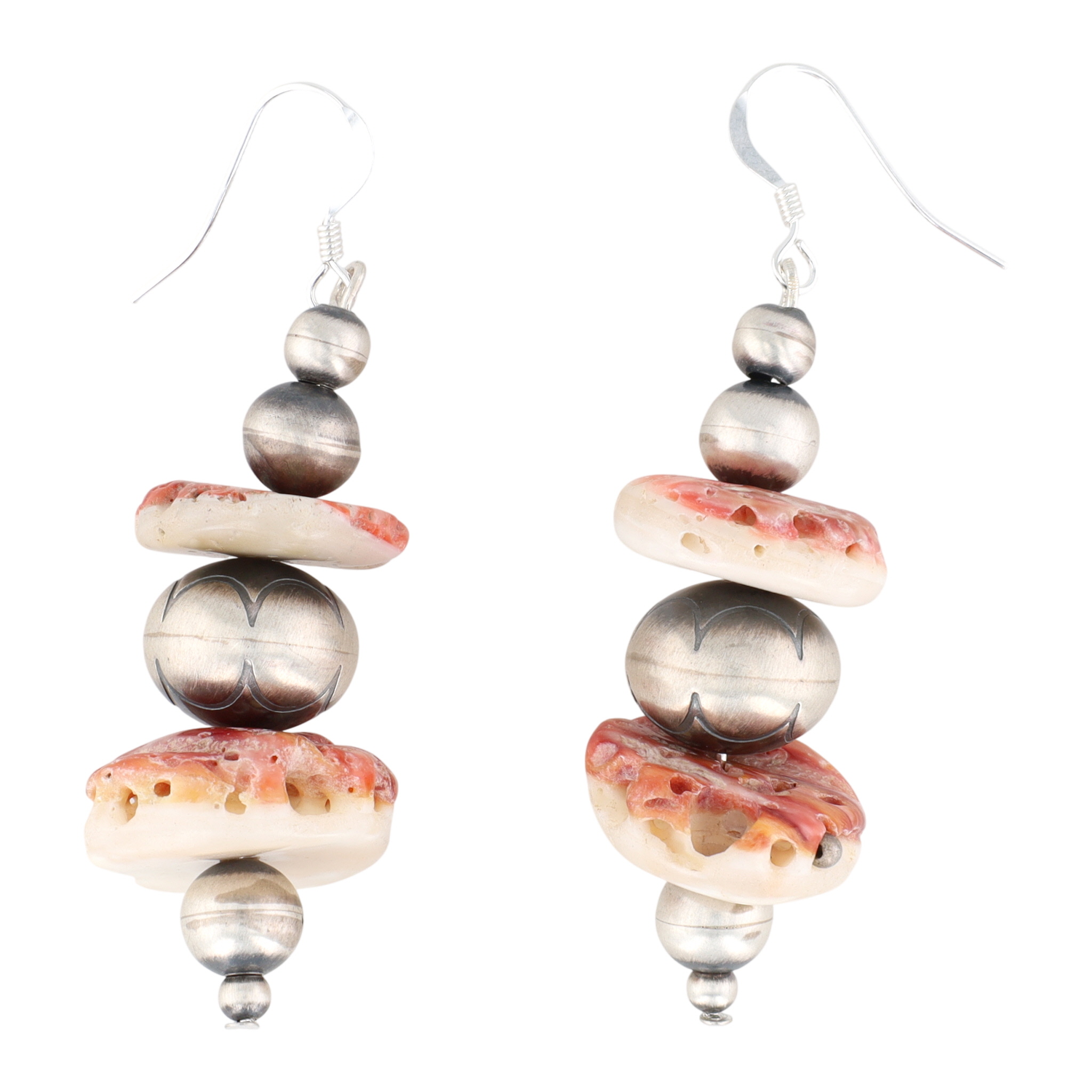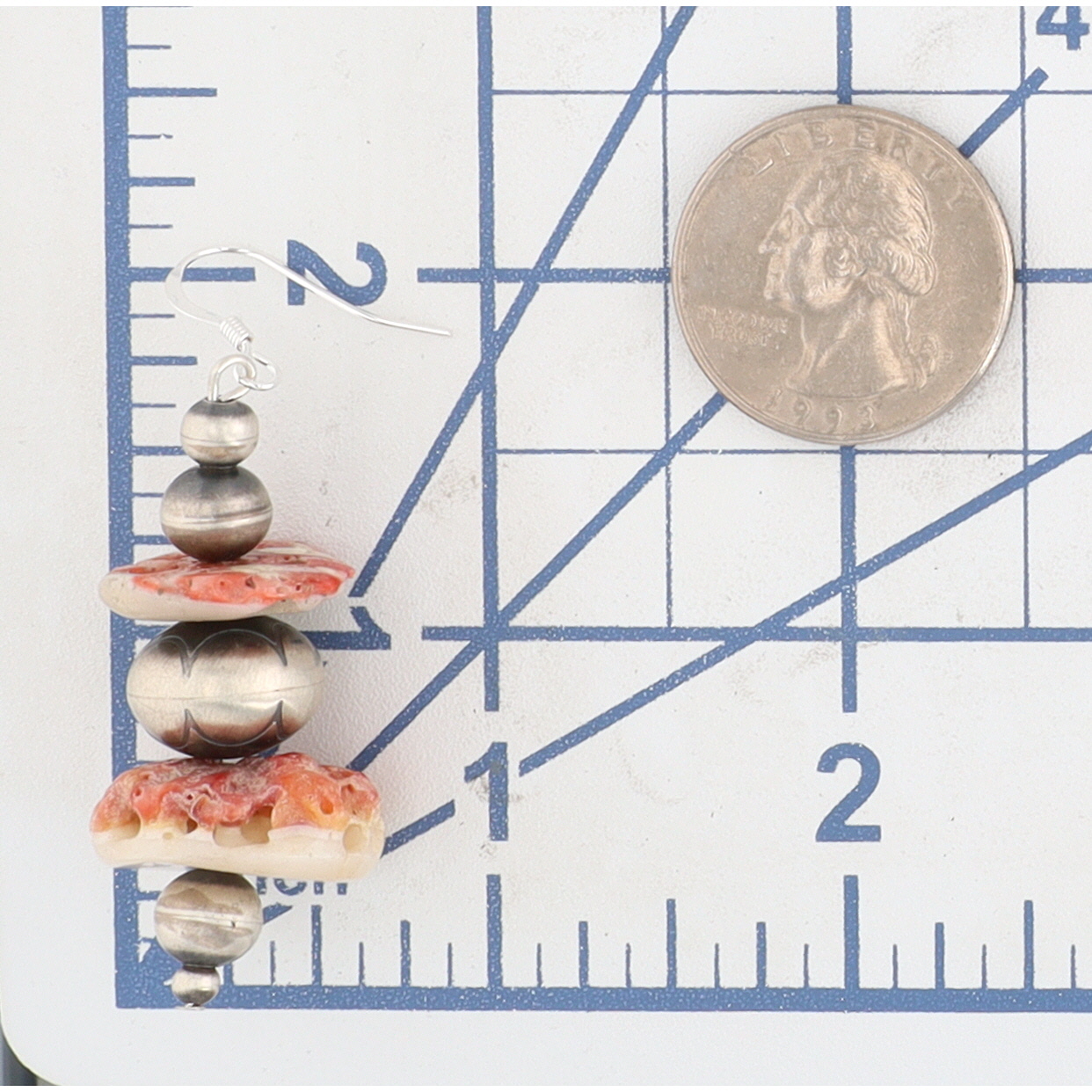 A pair of Coriz Kewa dangle earrings, featuring sterling beads and irregular white and orange/red spiny oyster shell, measuring approximately 2 inches long, weighing 14g