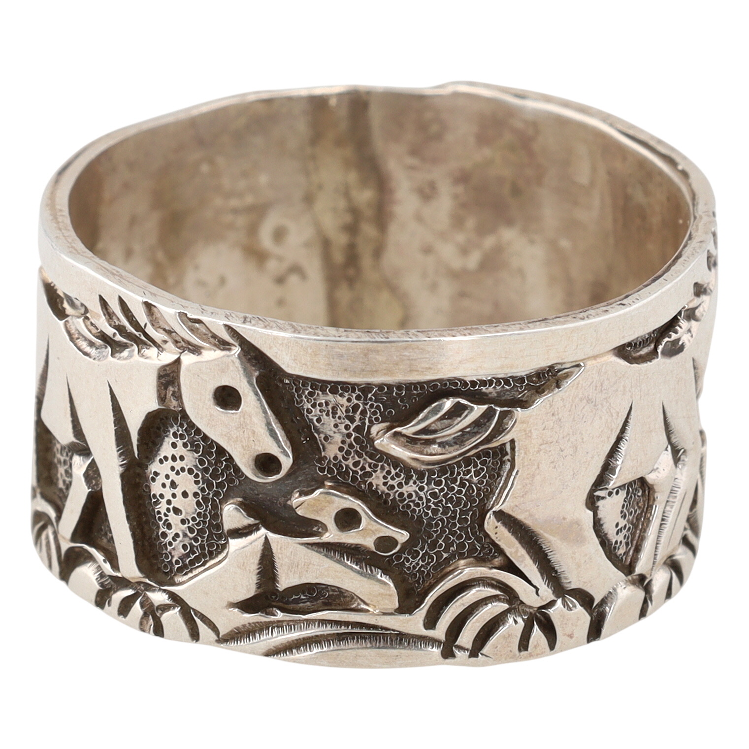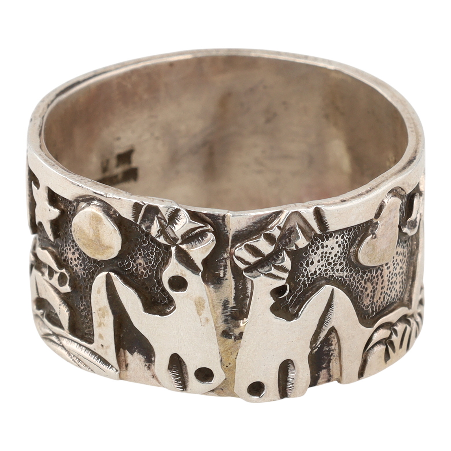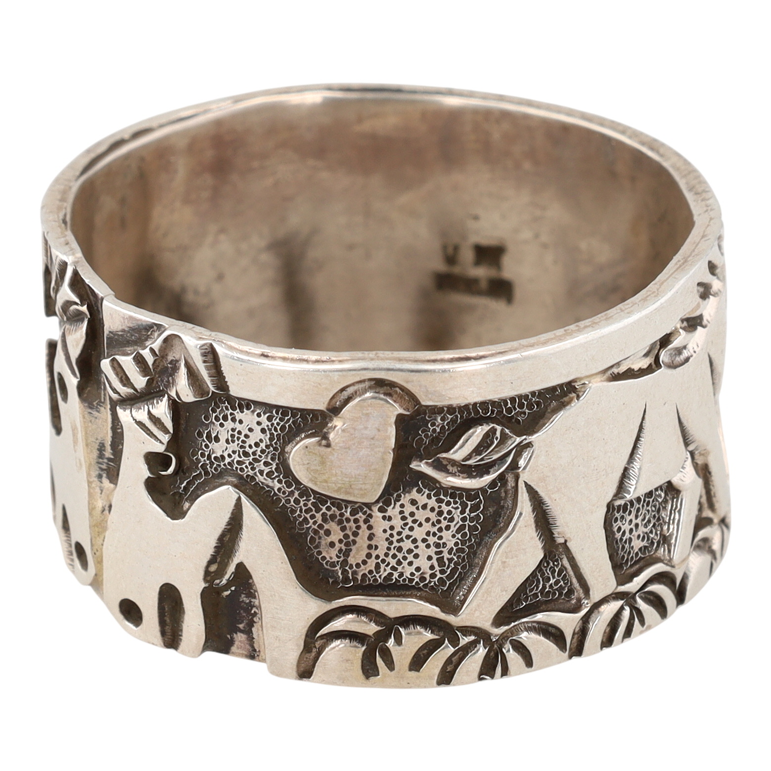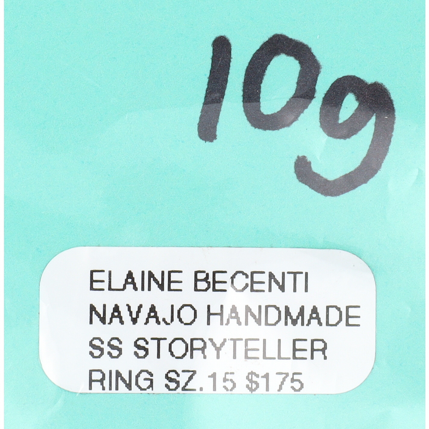 A Navajo handmade sterling silver storyteller ring by Elaine Becenti, size 15 and weighing 10g, featuring embossed animal figures around its band with a visible maker’s mark.