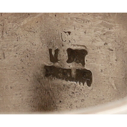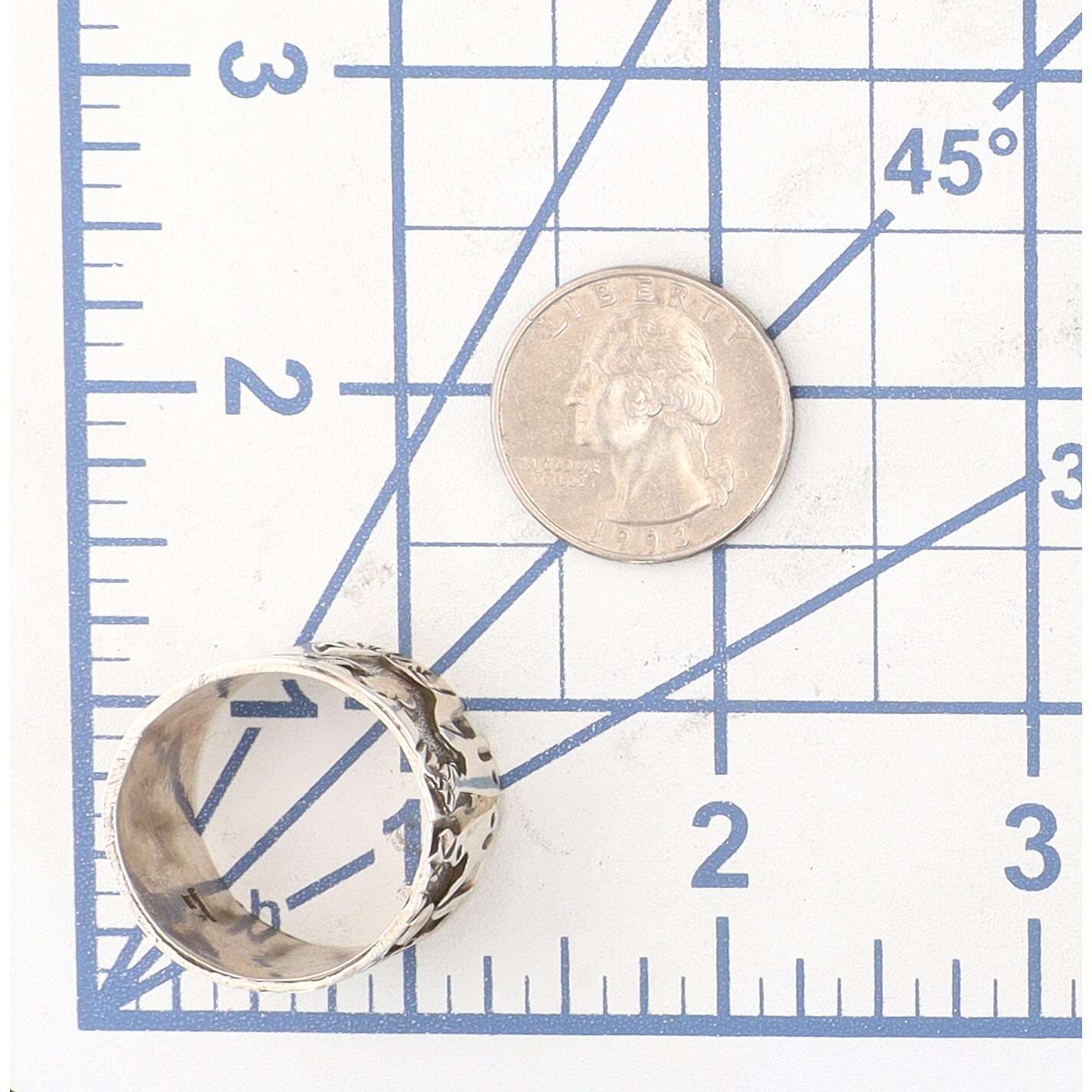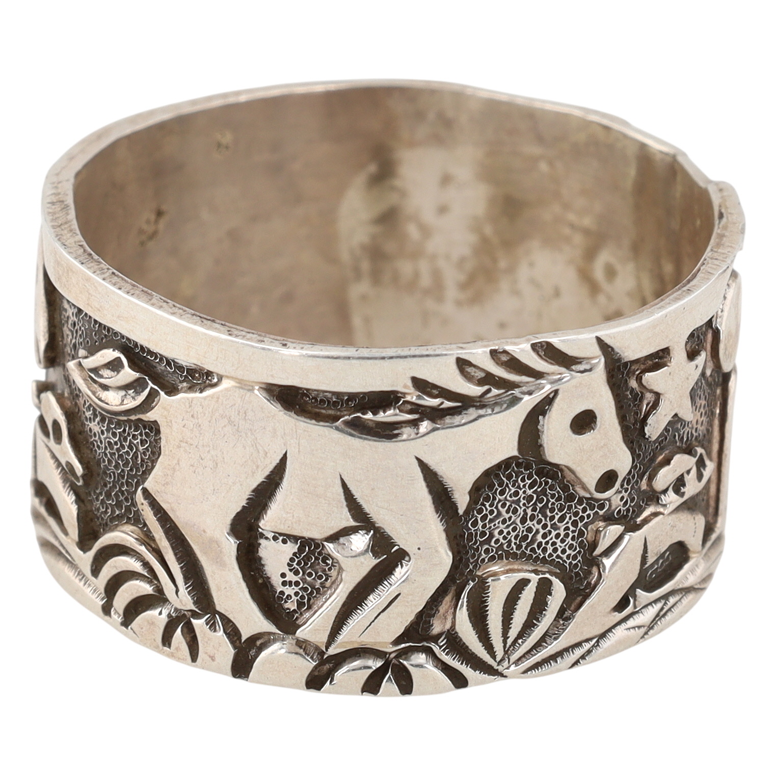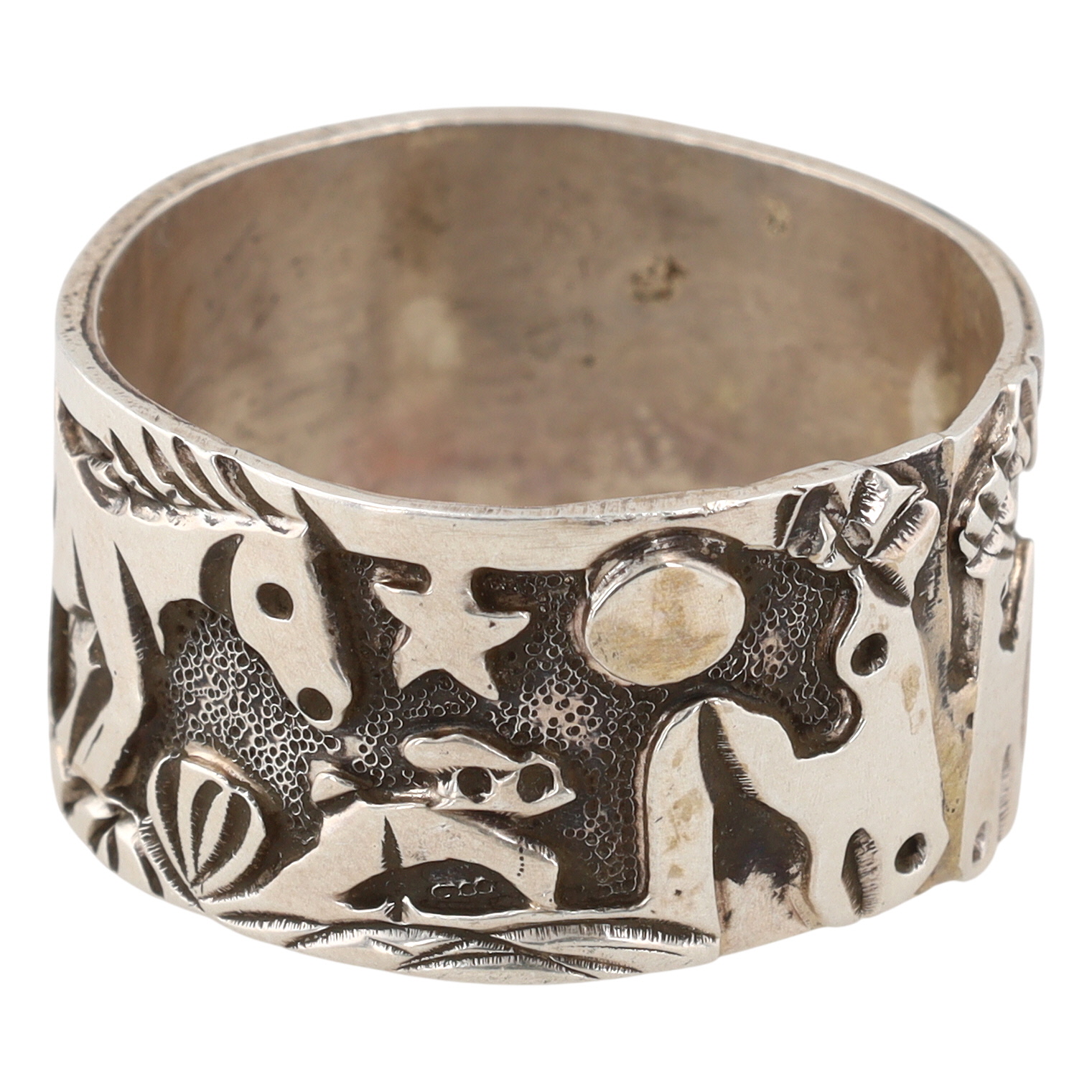 A Navajo handmade sterling silver storyteller ring by Elaine Becenti, size 15 and weighing 10g, featuring embossed animal figures around its band with a visible maker’s mark.