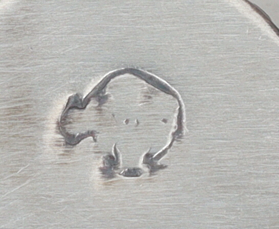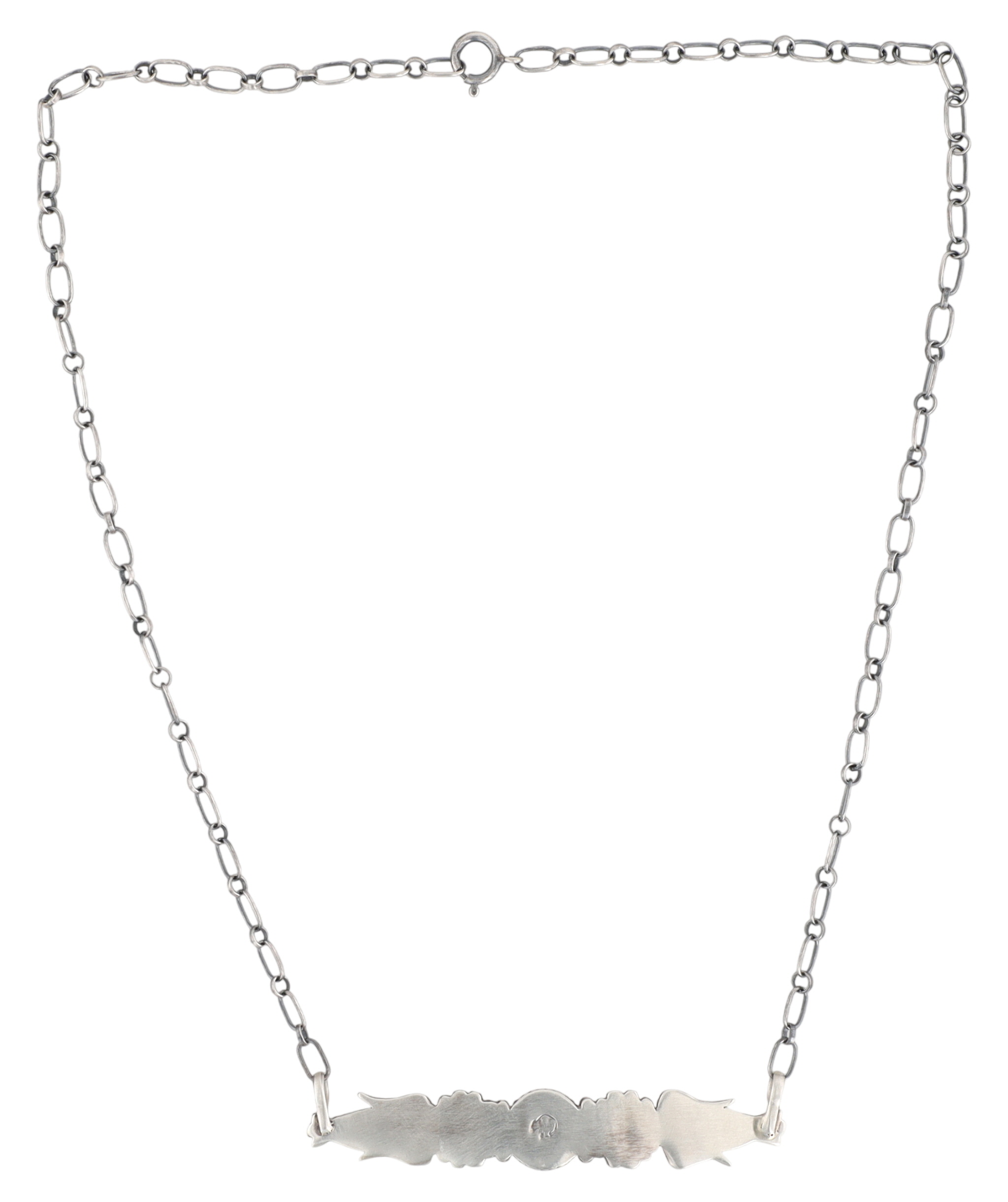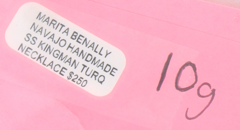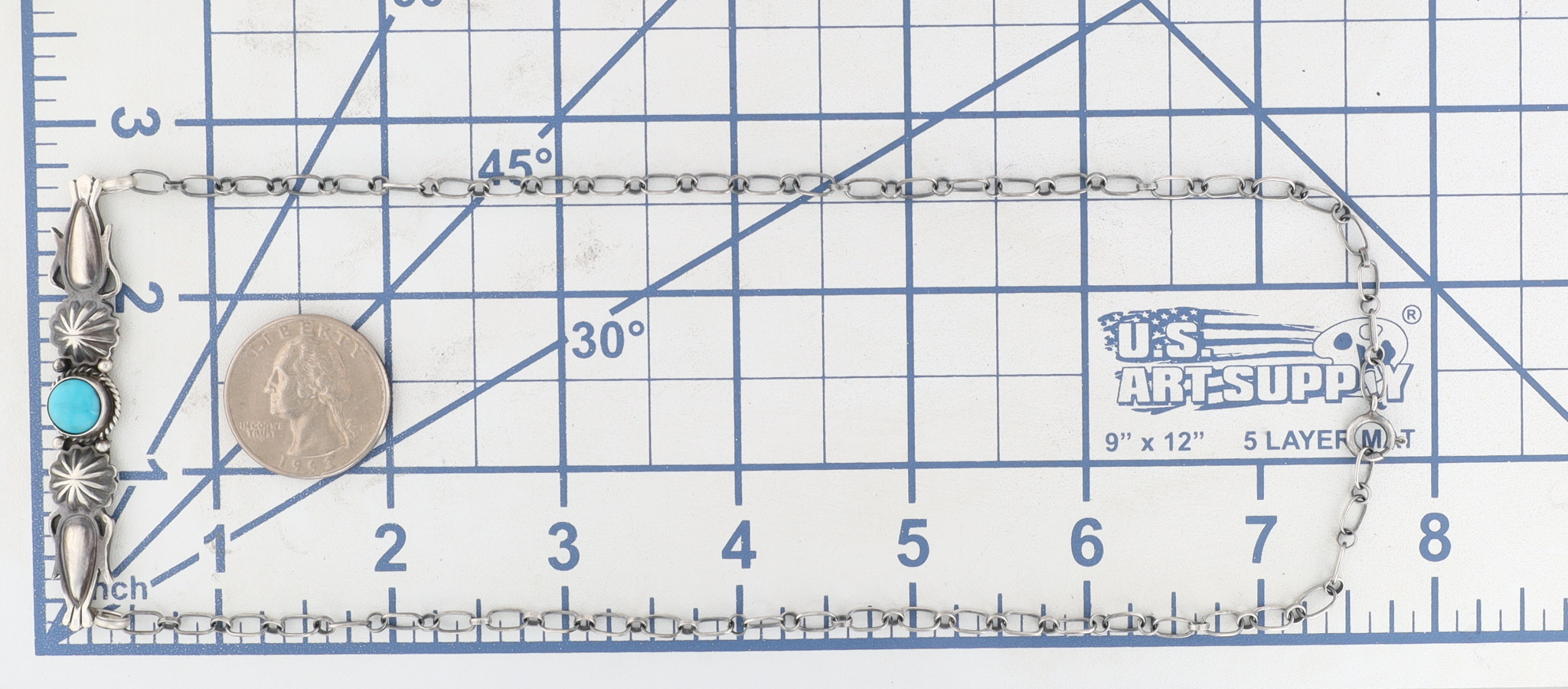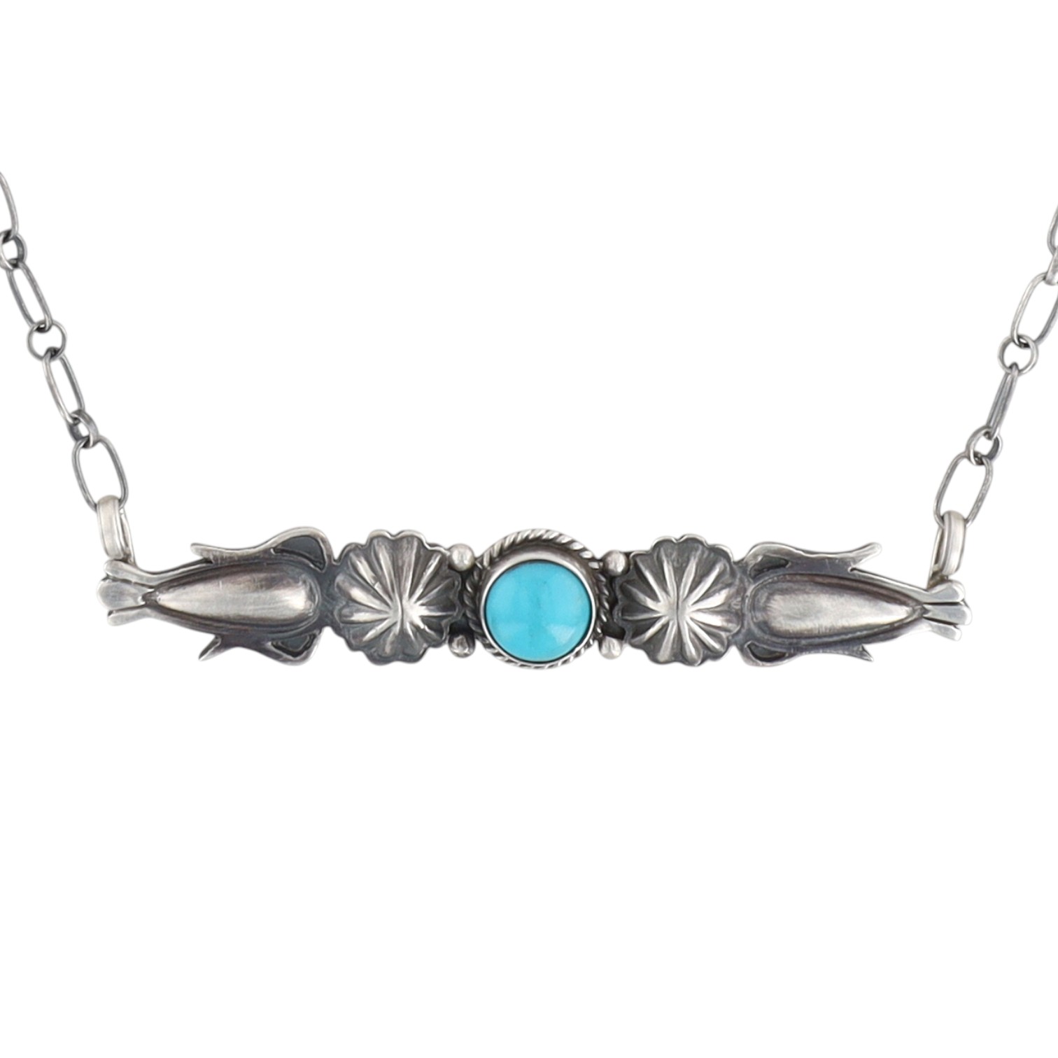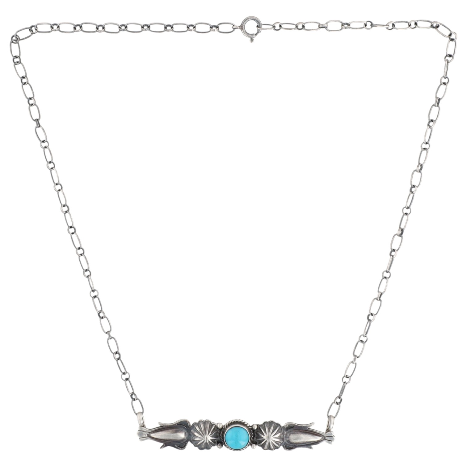 A sterling silver Navajo handmade necklace by Marita Benally, featuring a central Kingman turquoise stone, decorative silver elements, a maker’s mark for Running Bear Shop, and weighing 10g, measuring approximately 16 inches long.