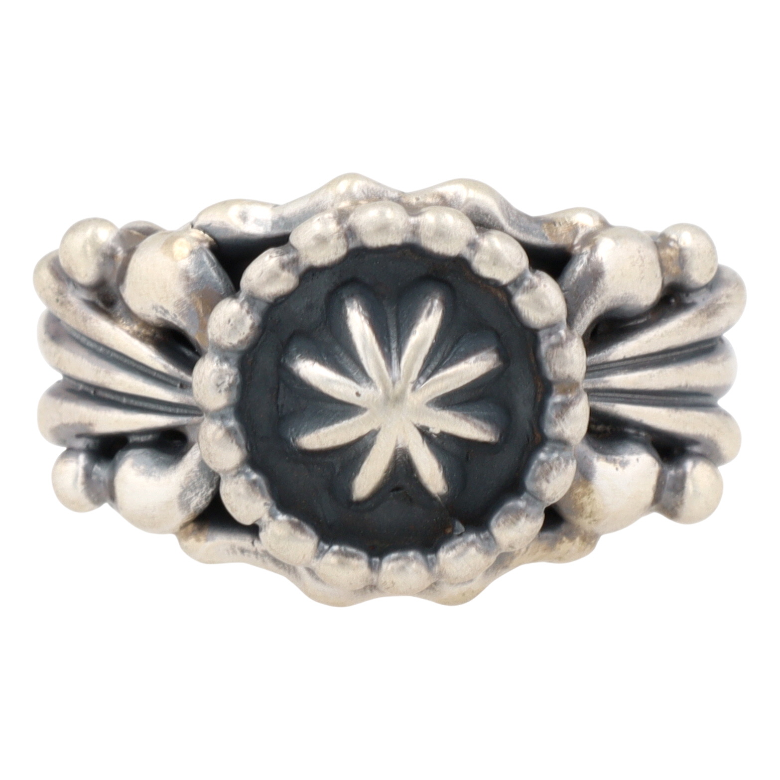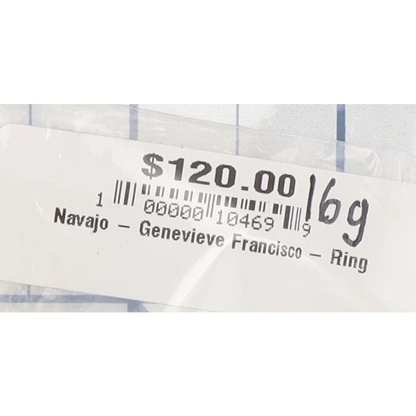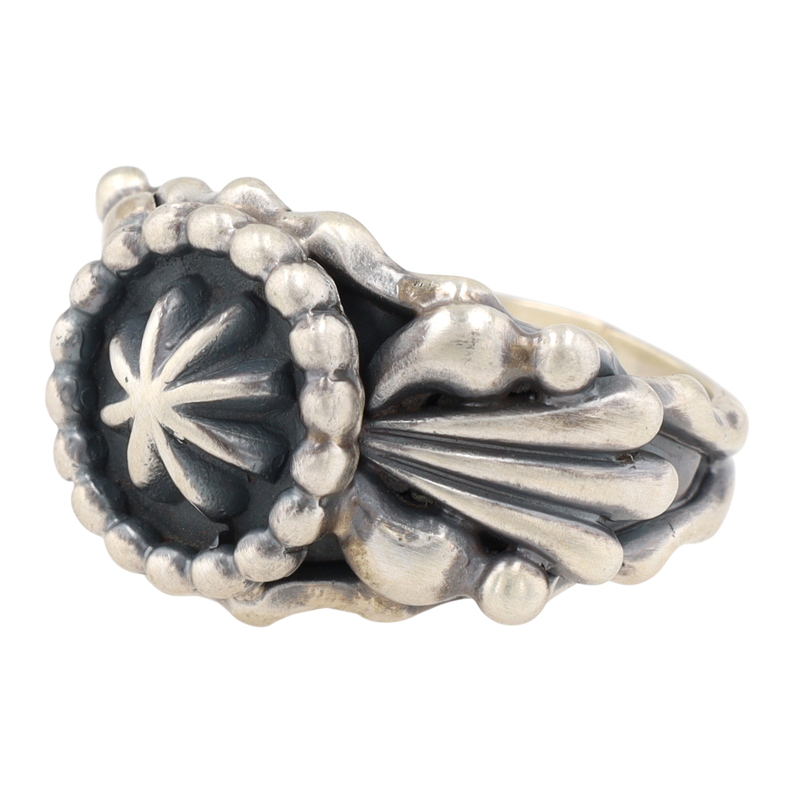 A Navajo ring with a dark central starburst design, marked ‘.925’ for Running Bear shop, identified on an attached label as by Genevieve Francisco. The ring weighs 16g, and is size US 14