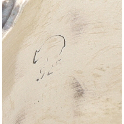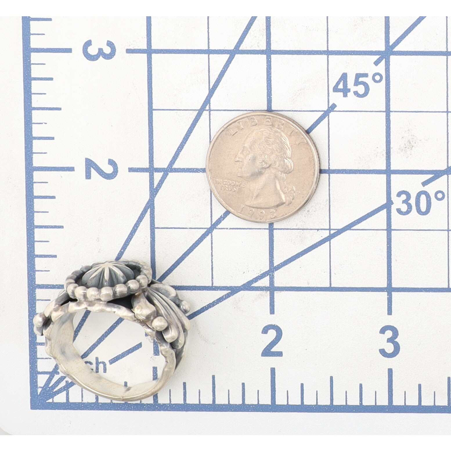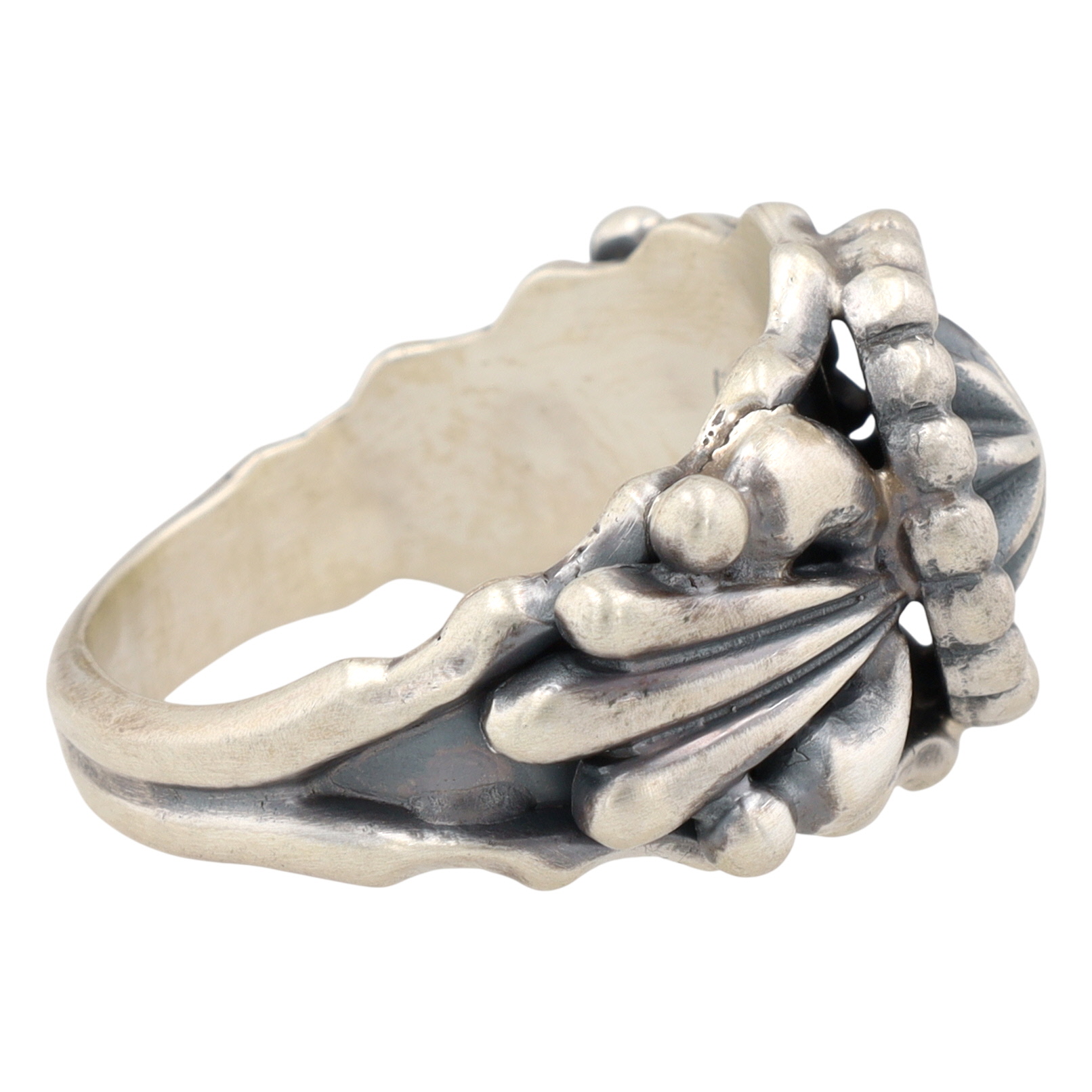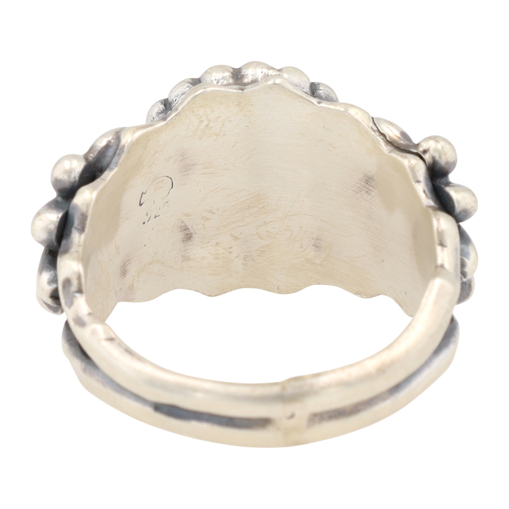 A Navajo ring with a dark central starburst design, marked ‘.925’ for Running Bear shop, identified on an attached label as by Genevieve Francisco. The ring weighs 16g, and is size US 14