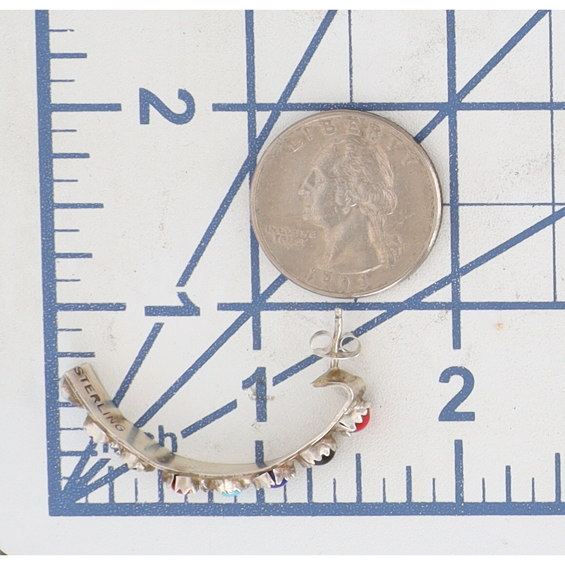 A pair of Navajo sterling silver hoop earrings, marked “STERLING”, featuring multiple coral, onyx, lapis, and turquoise cabochon stones, measuring approximately 1.25 inches tall, identified by a label as “RICK ENRIQUEZ NAVAJO HANDMADE SS MULTI COLOR EARERING”, and weighing 6g.