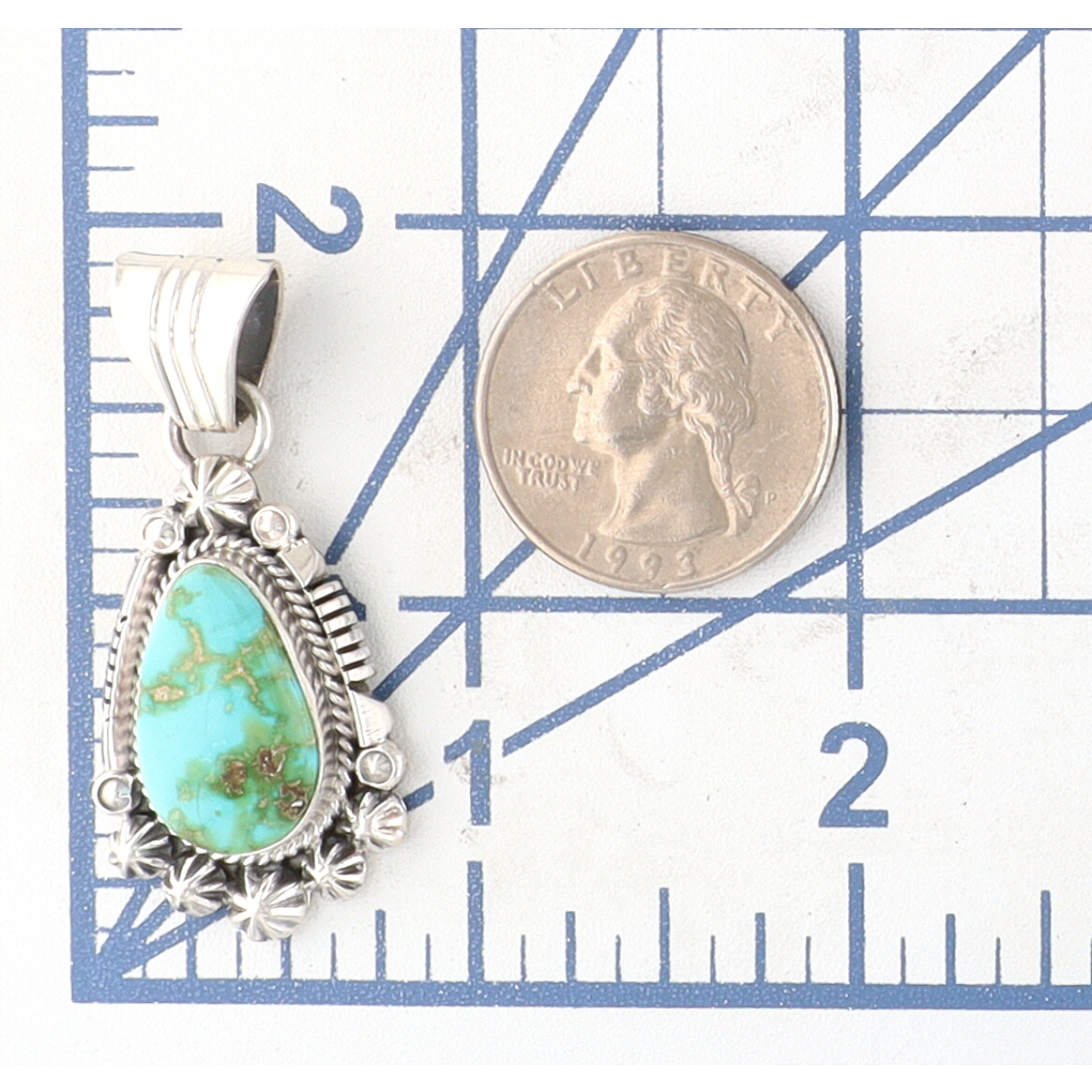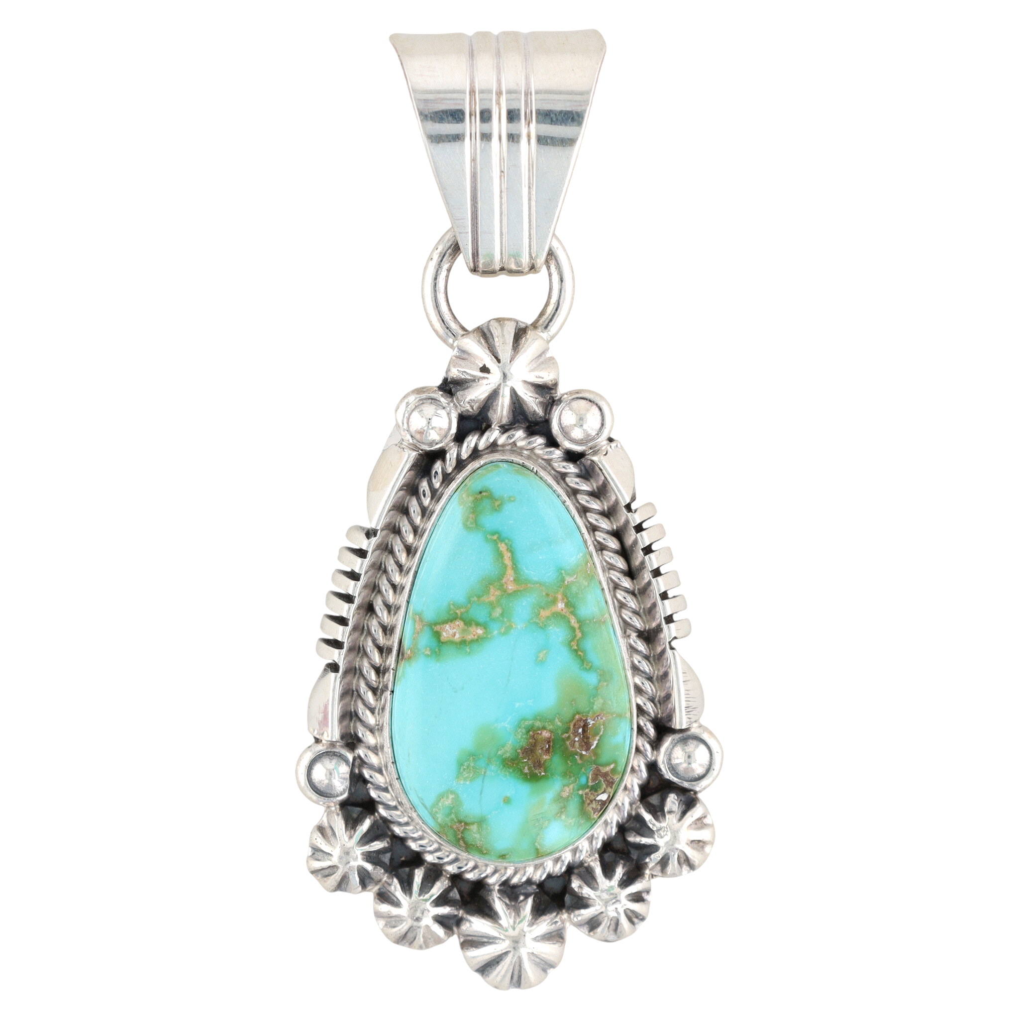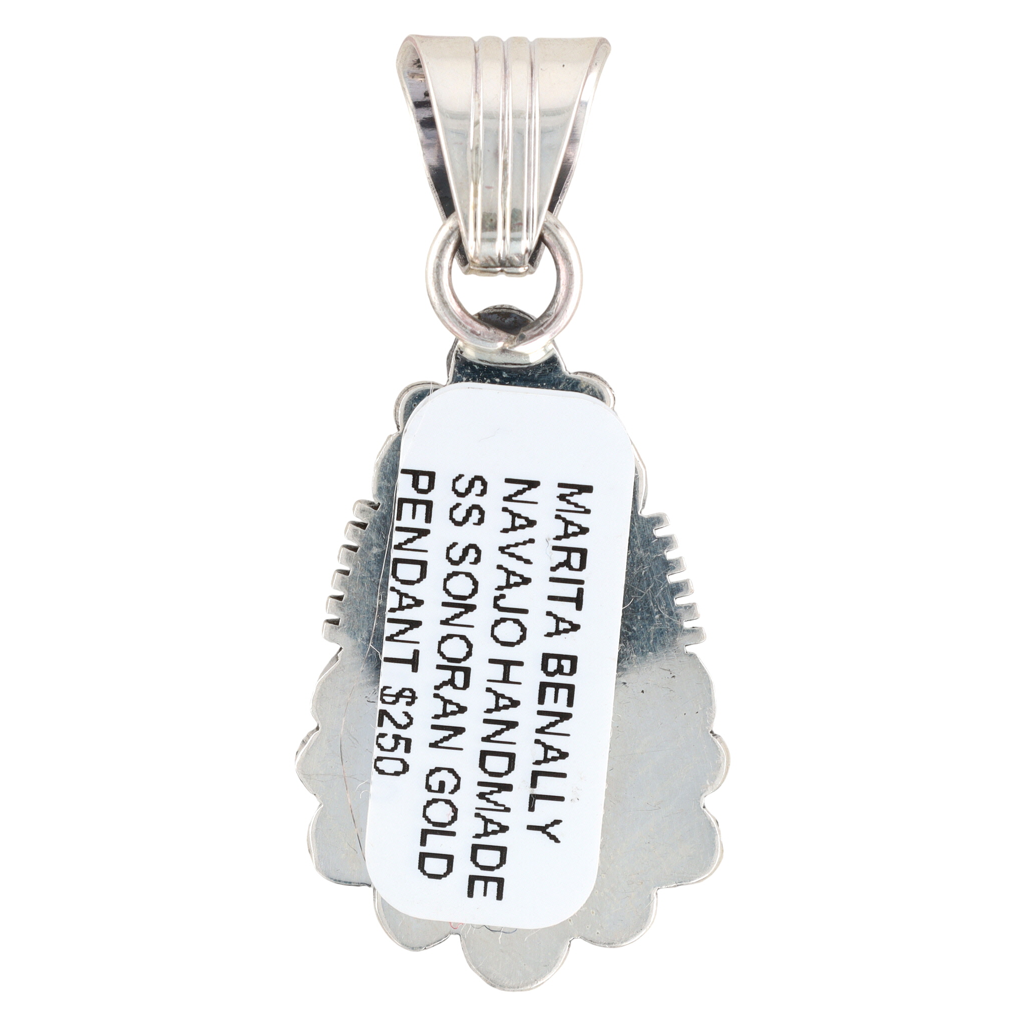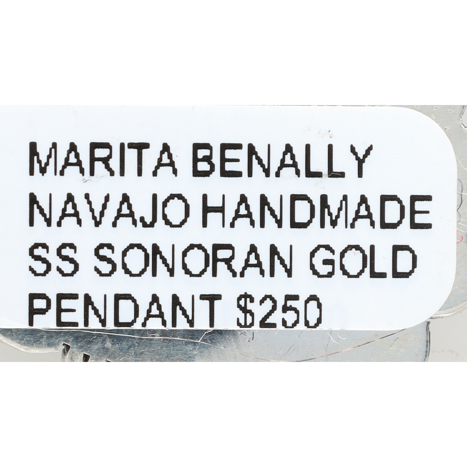 A silver and turquoise blue pendant made for Running Bear Shop, with a brown/green matrix, labeled ‘MARITA BENALLY NAVAJO HANDMADE SS SONORAN GOLD PENDANT’, weighing 9g and measuring approximately 1.5 inches long.