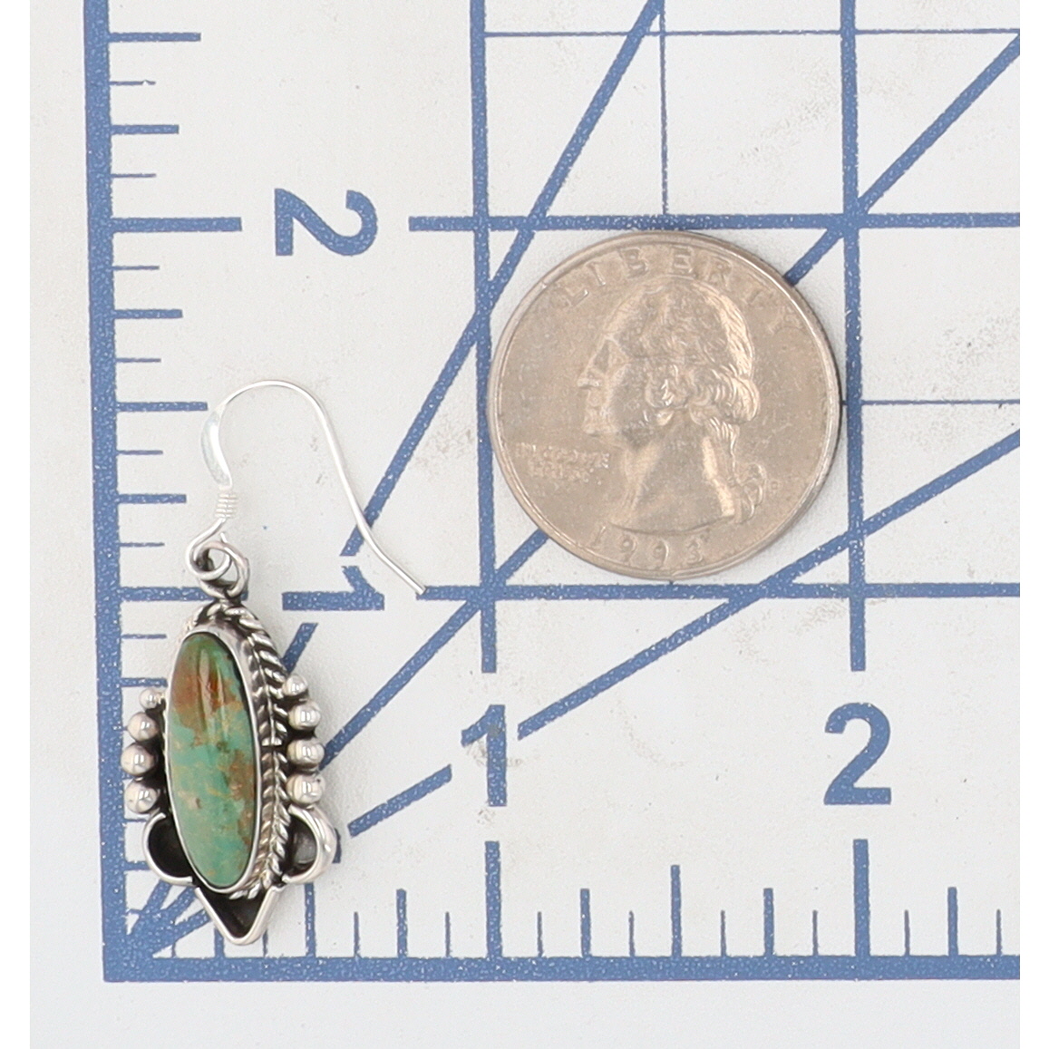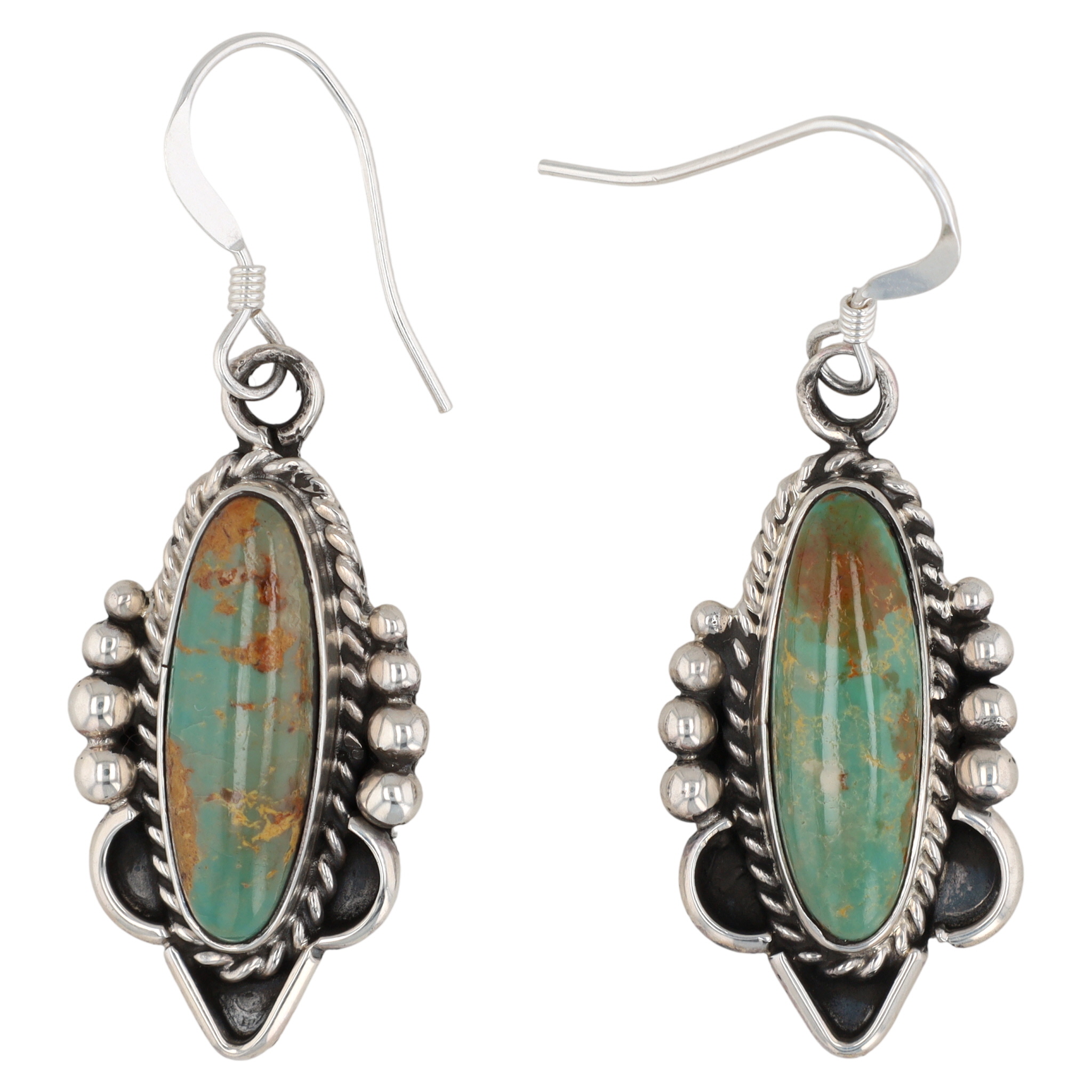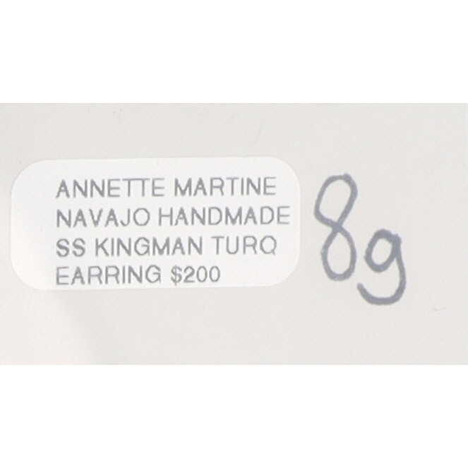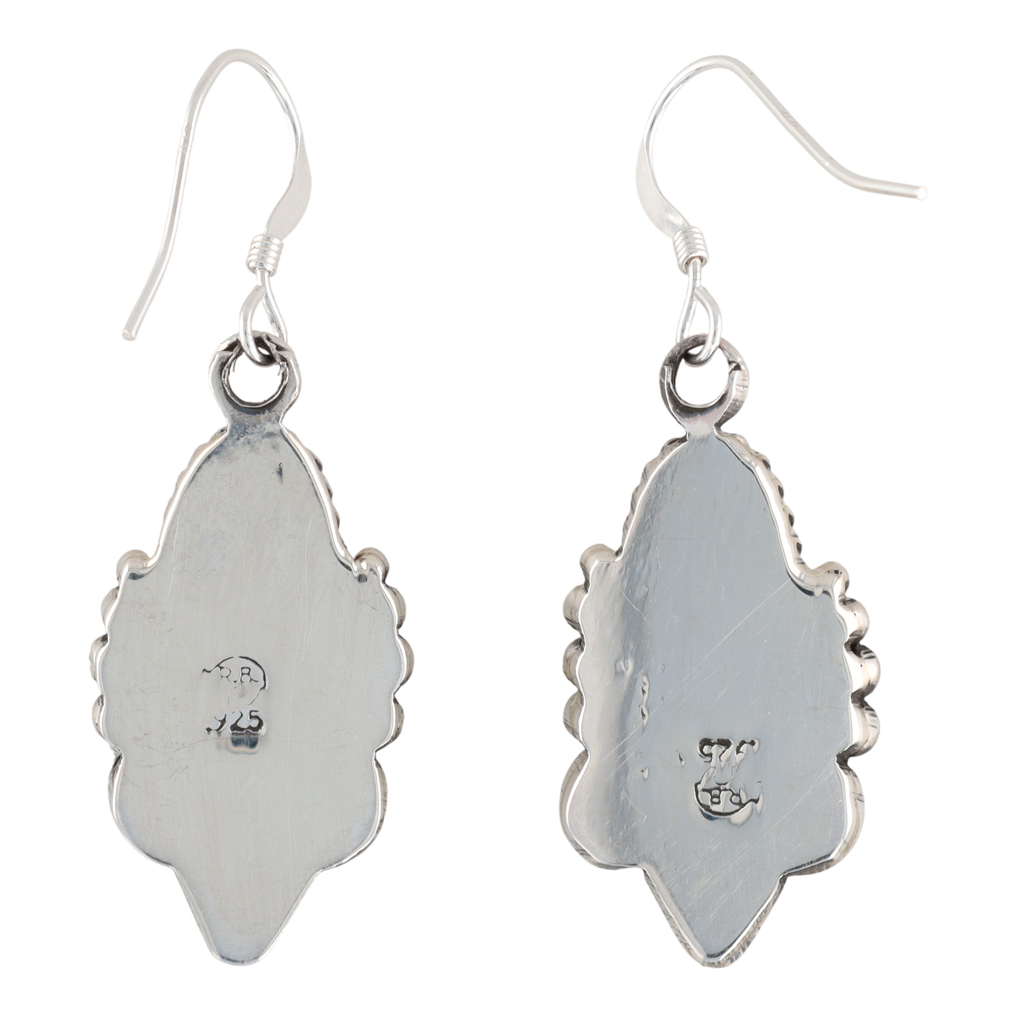 A pair of Navajo handmade sterling silver Kingman turquoise drop earrings by Annette Martine, marked ‘R.B.’ and ‘.925’ for Running Bear Shop, weighing 8g and measuring approximately 1.5 inches long.