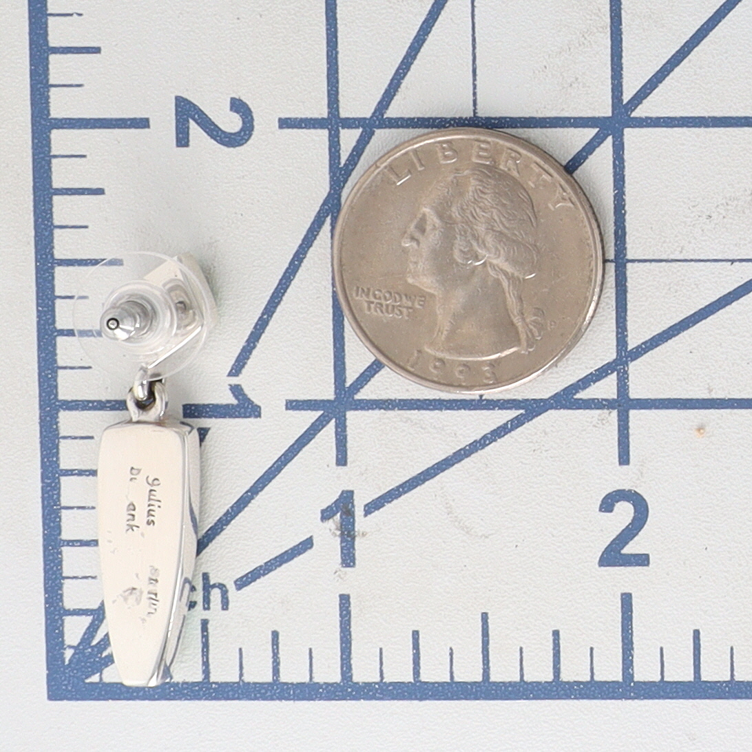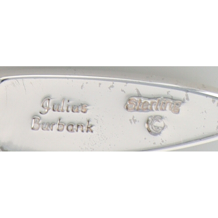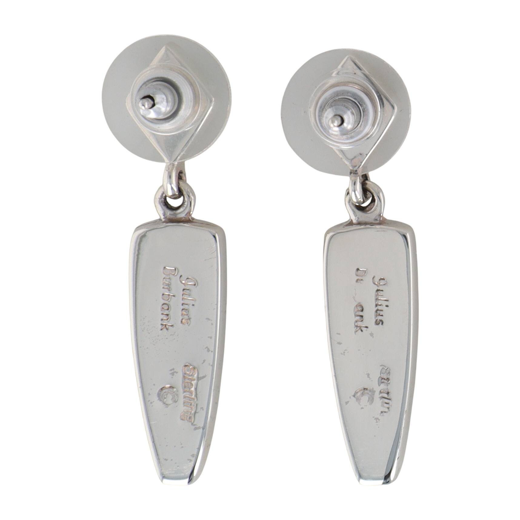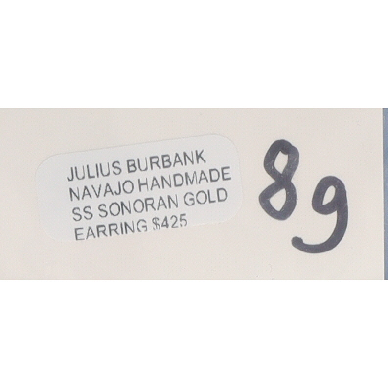 A pair of Navajo handmade sterling silver dangle earrings, approximately 1.5 inches long, featuring cobblestone inlaid green and blue-green Sonoran Gold turquoise stones with brown matrix, marked ‘Julius Burbank’ and ‘Sterling’.