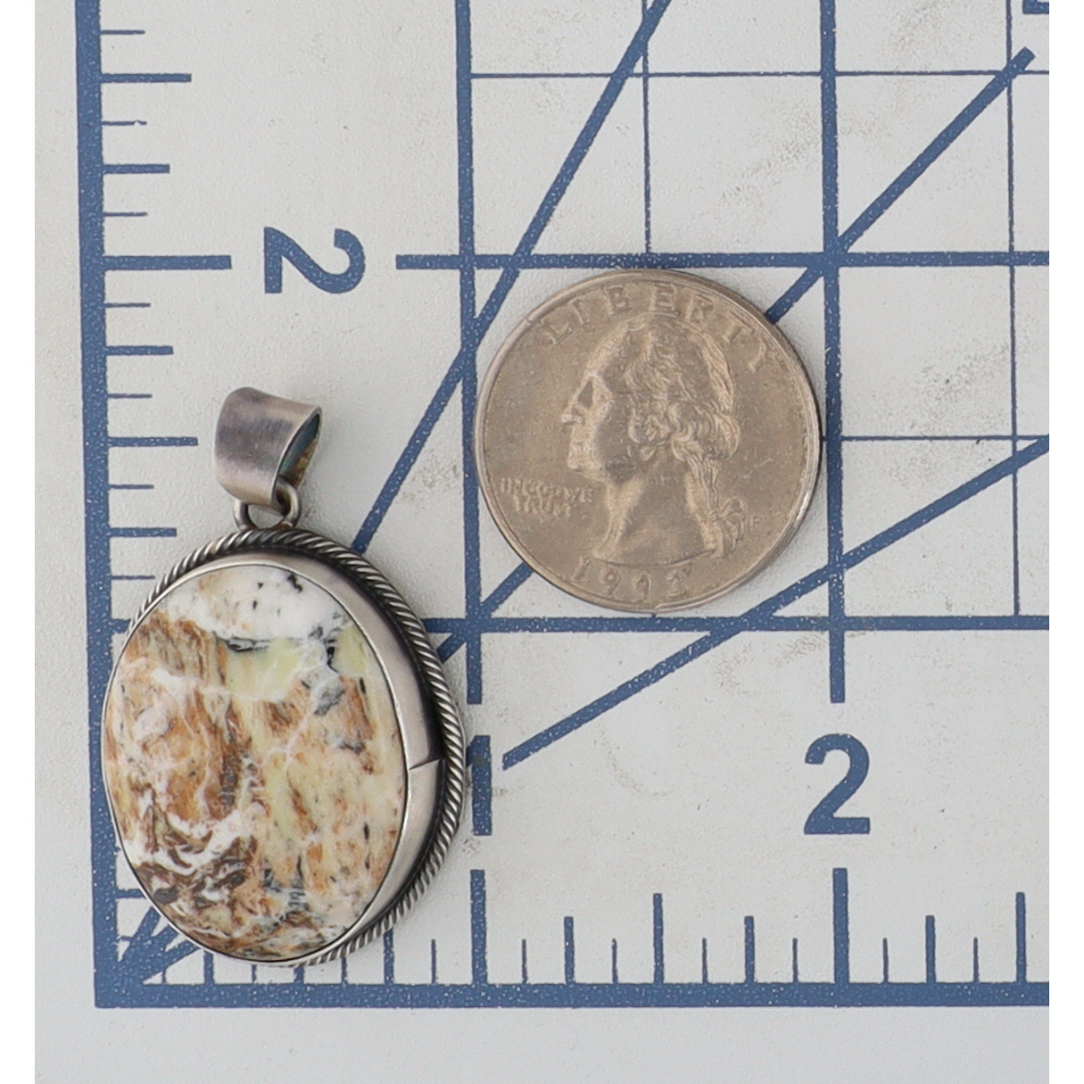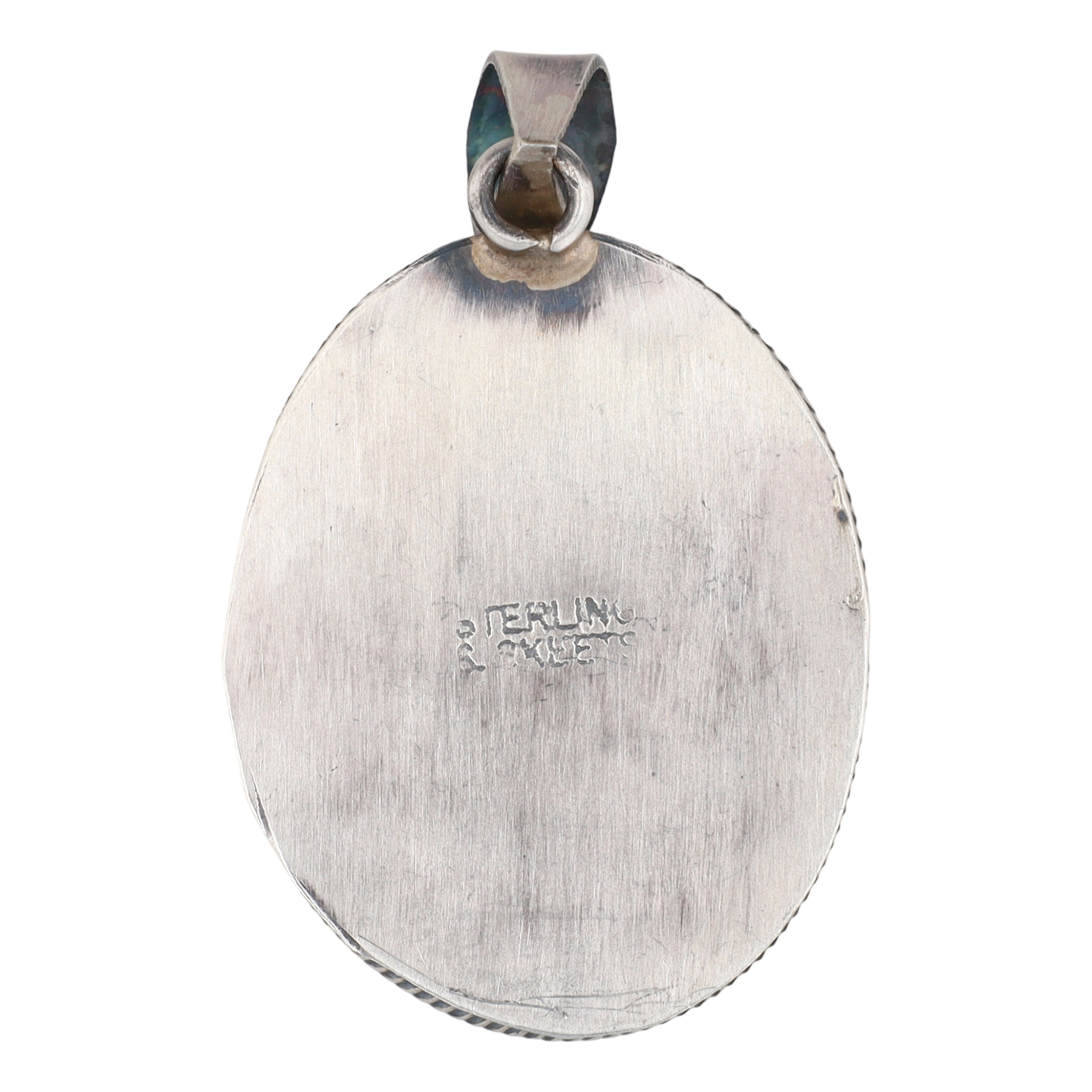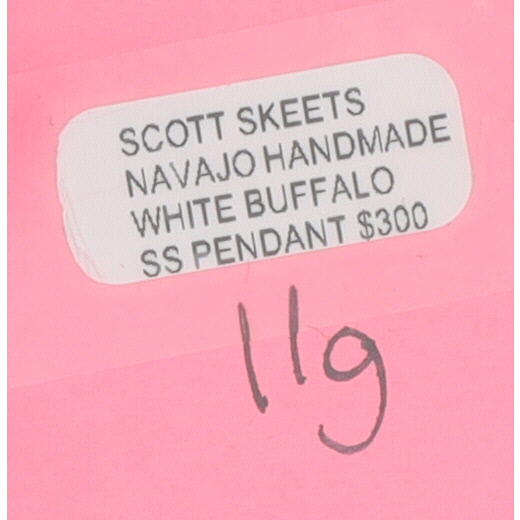 An oval silver pendant featuring a white, brown, and pale yellow/greenish White Buffalo stone, marked “STERLING” and “S. SKEETS” on the back, identified on an accompanying label as a “SCOTT SKEETS NAVAJO HANDMADE WHITE BUFFALO SS PENDANT”, measuring approximately 2 inches long, and weighing 11g