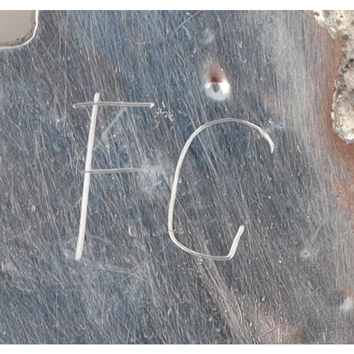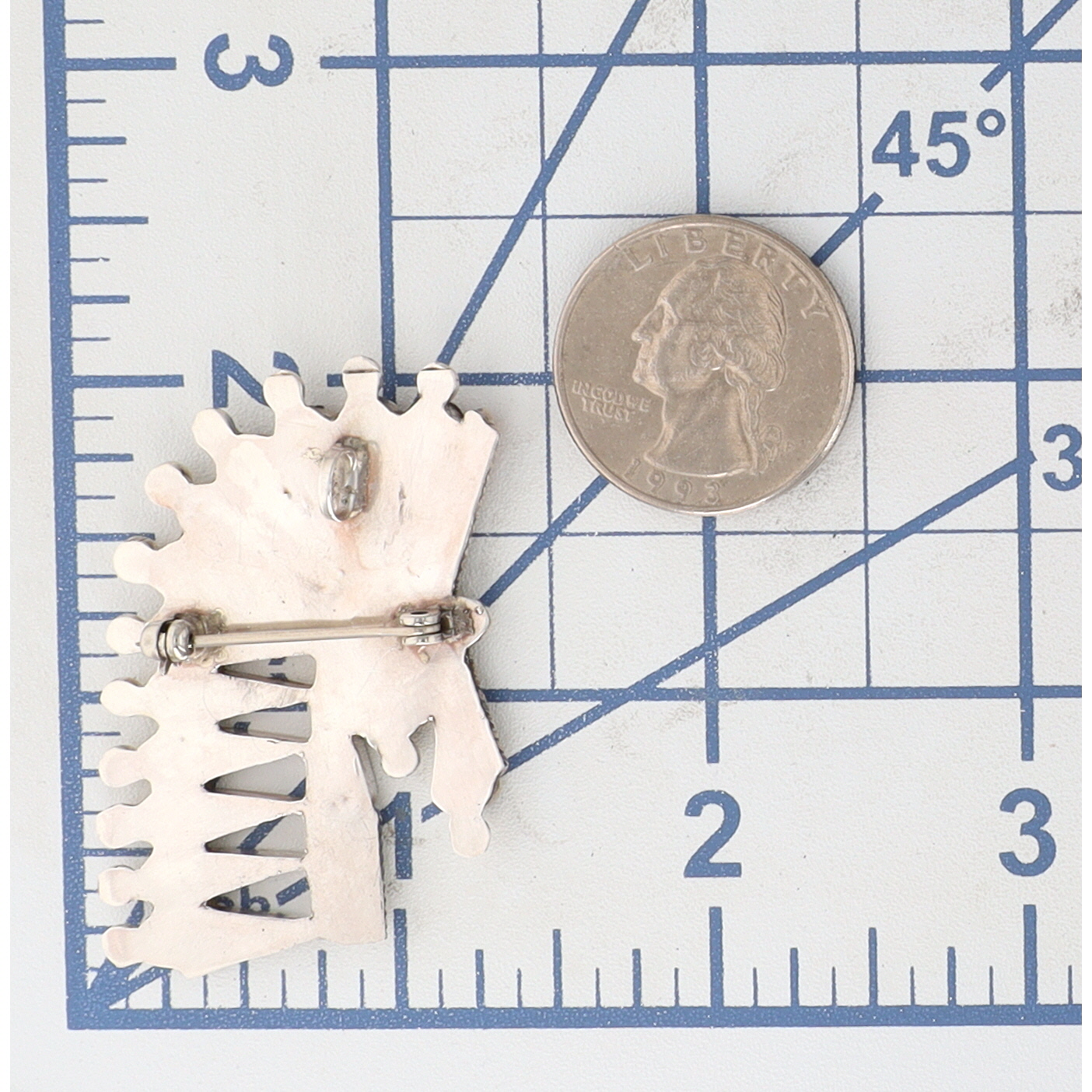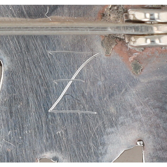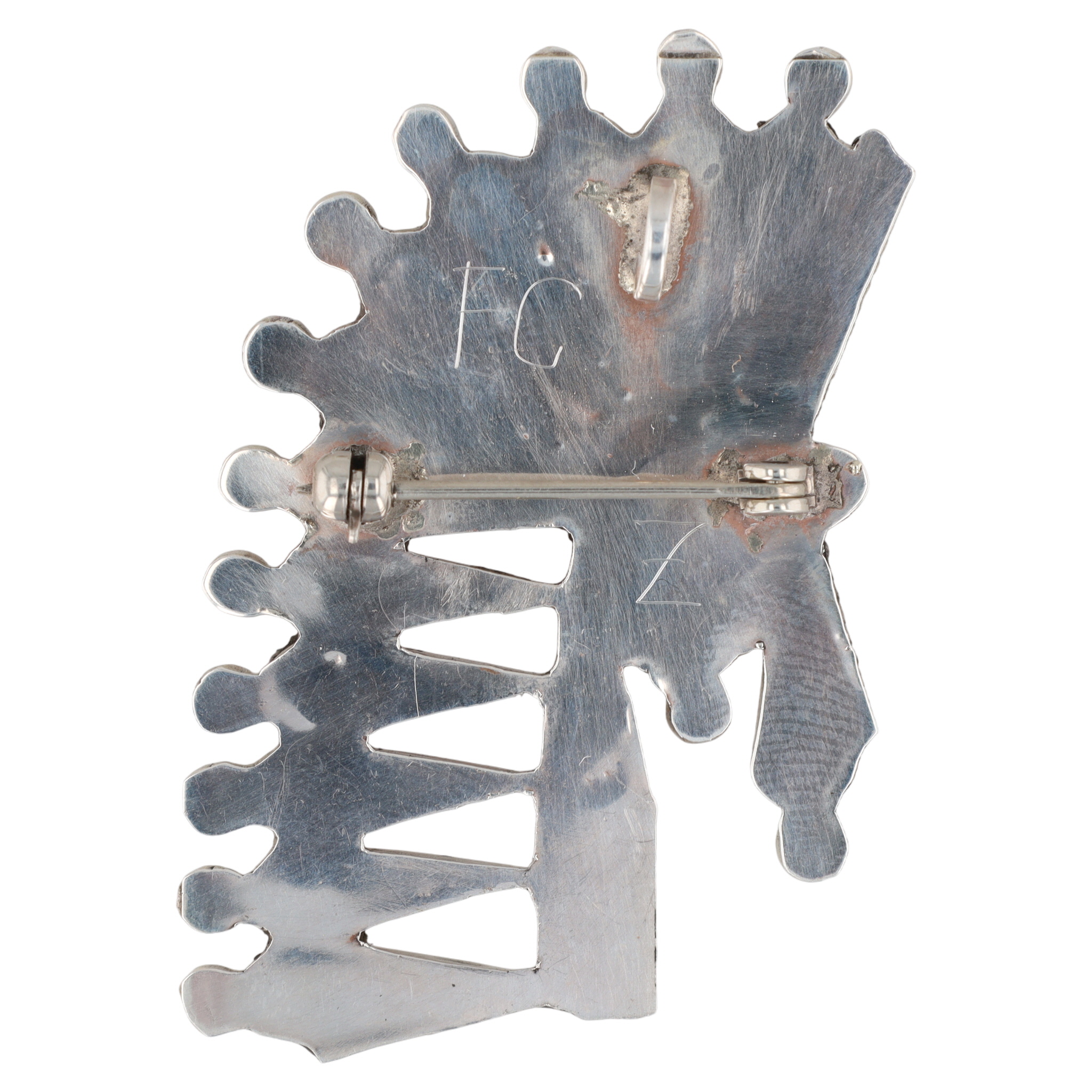A Zuni Fabian Cellicion silver pin/pendant, approximately 2.5 x 2 inches and weighing 11g, featuring light pink, red, and turquoise stone inlays, inscribed “FC” and “Z”.