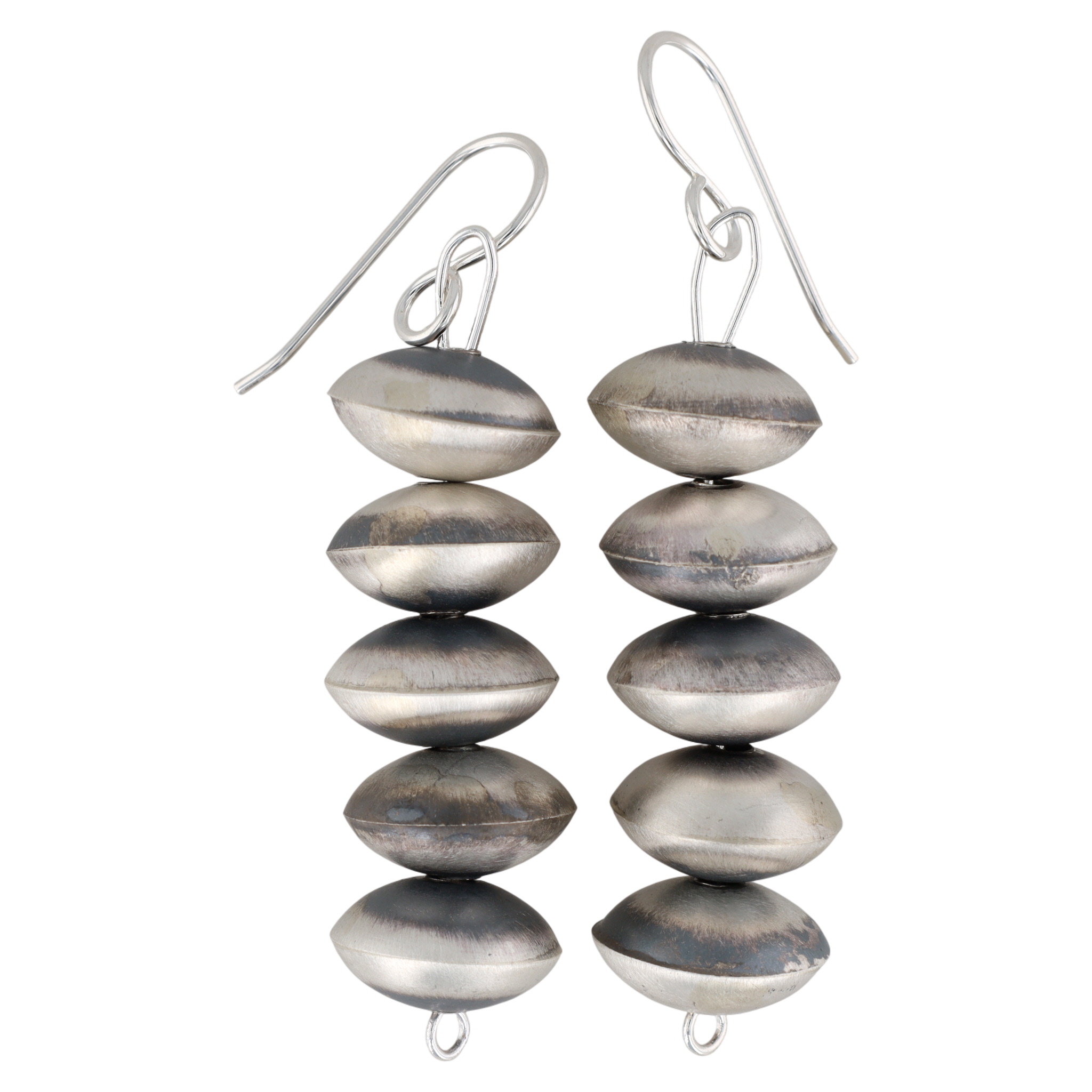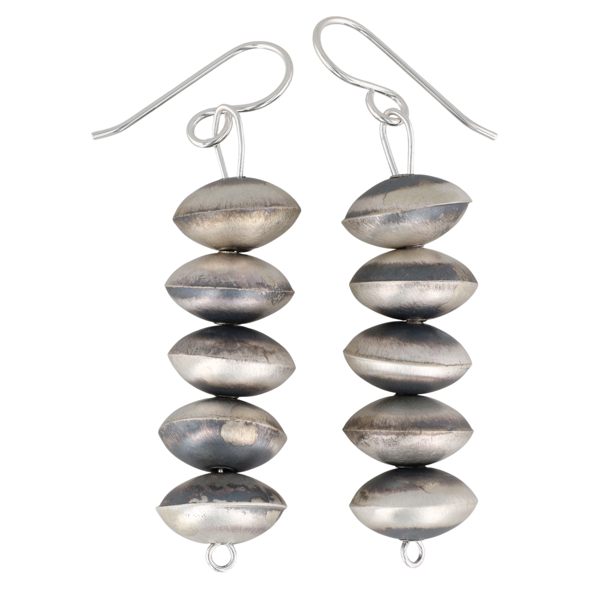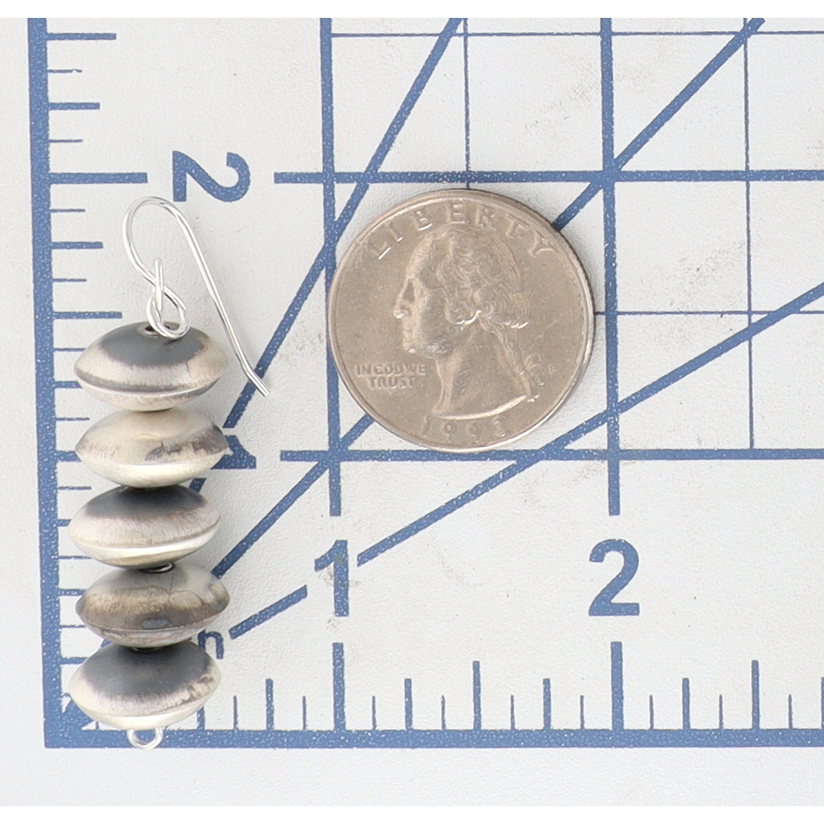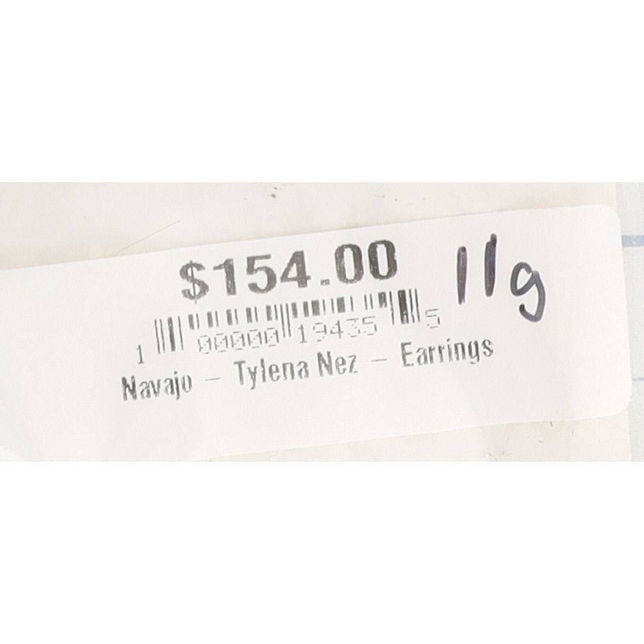 A pair of sterling silver Navajo beaded dangle earrings, labeled ‘Navajo – Tylena Nez’, measuring approximately 2.25 inches long.