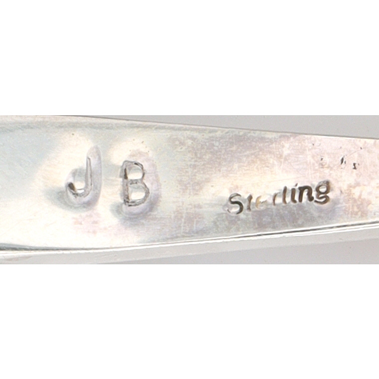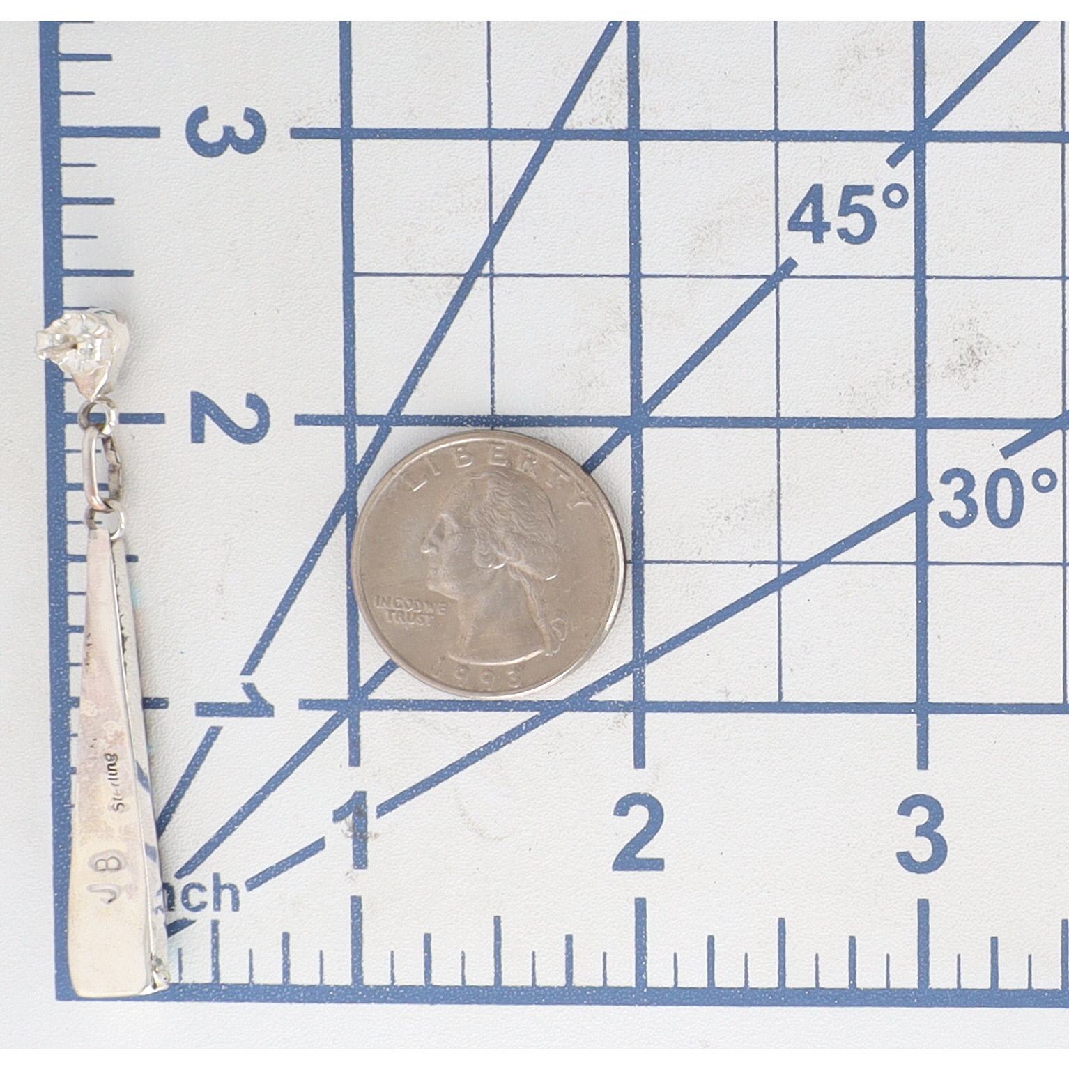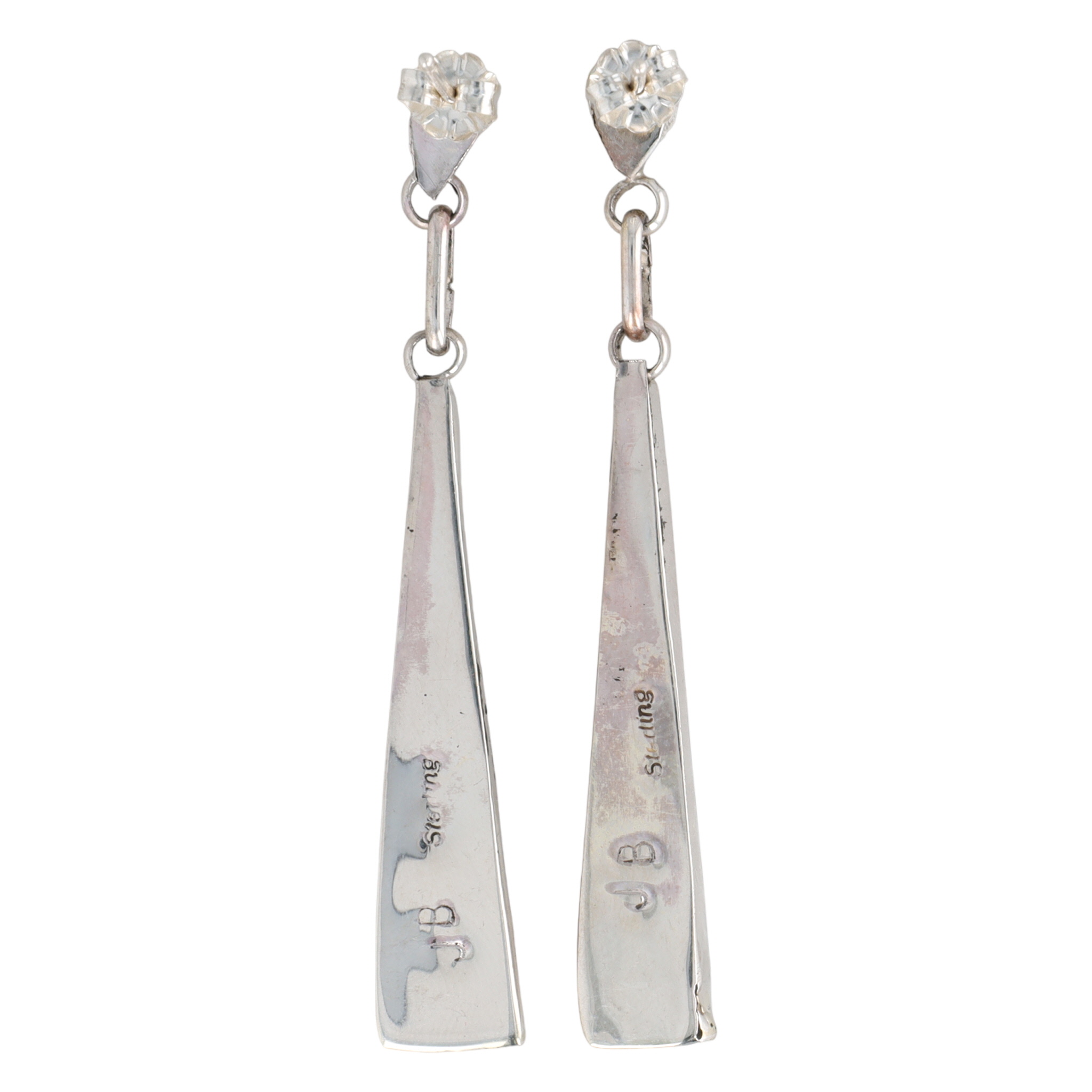 A pair of silver drop earrings features multi-stone inlay in spiny oyster, mother-of-pearl, turquoise, onyx, marked “JB” and “Sterling”, measuring approximately 2.5 inches long, weighing 6g.