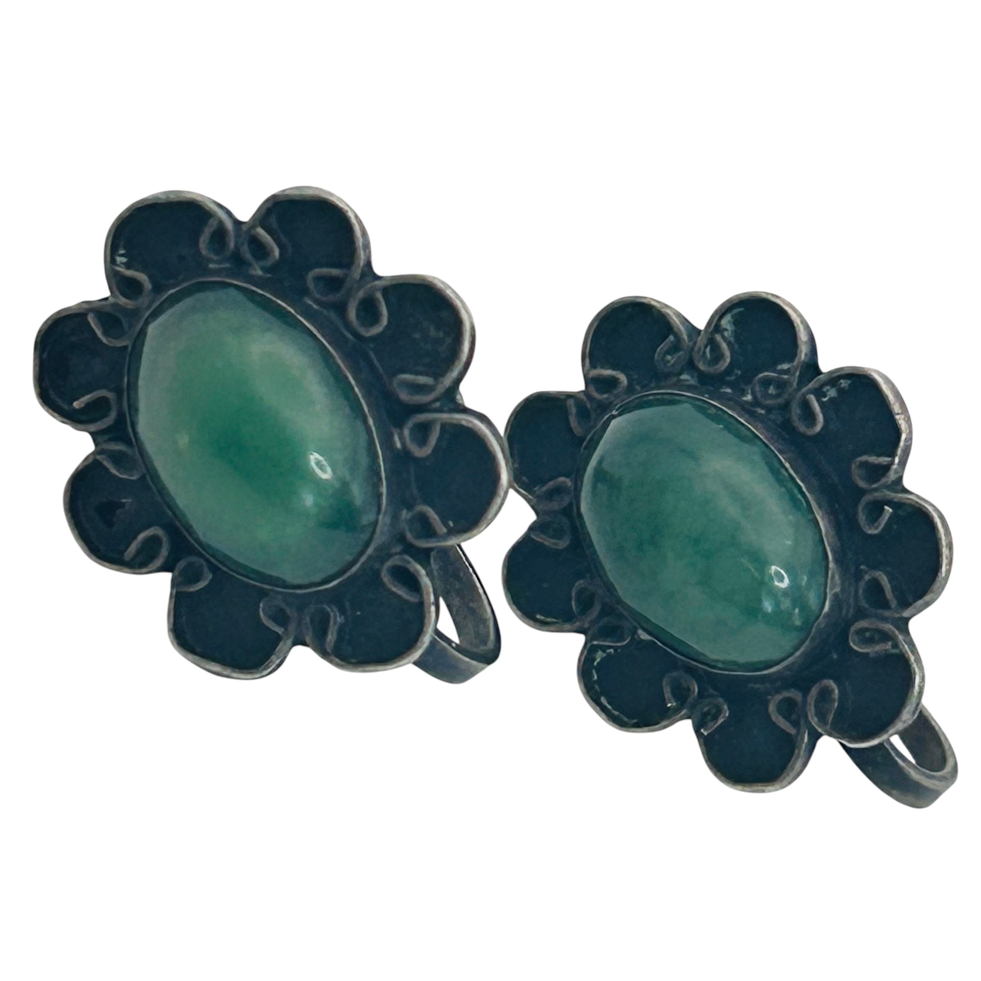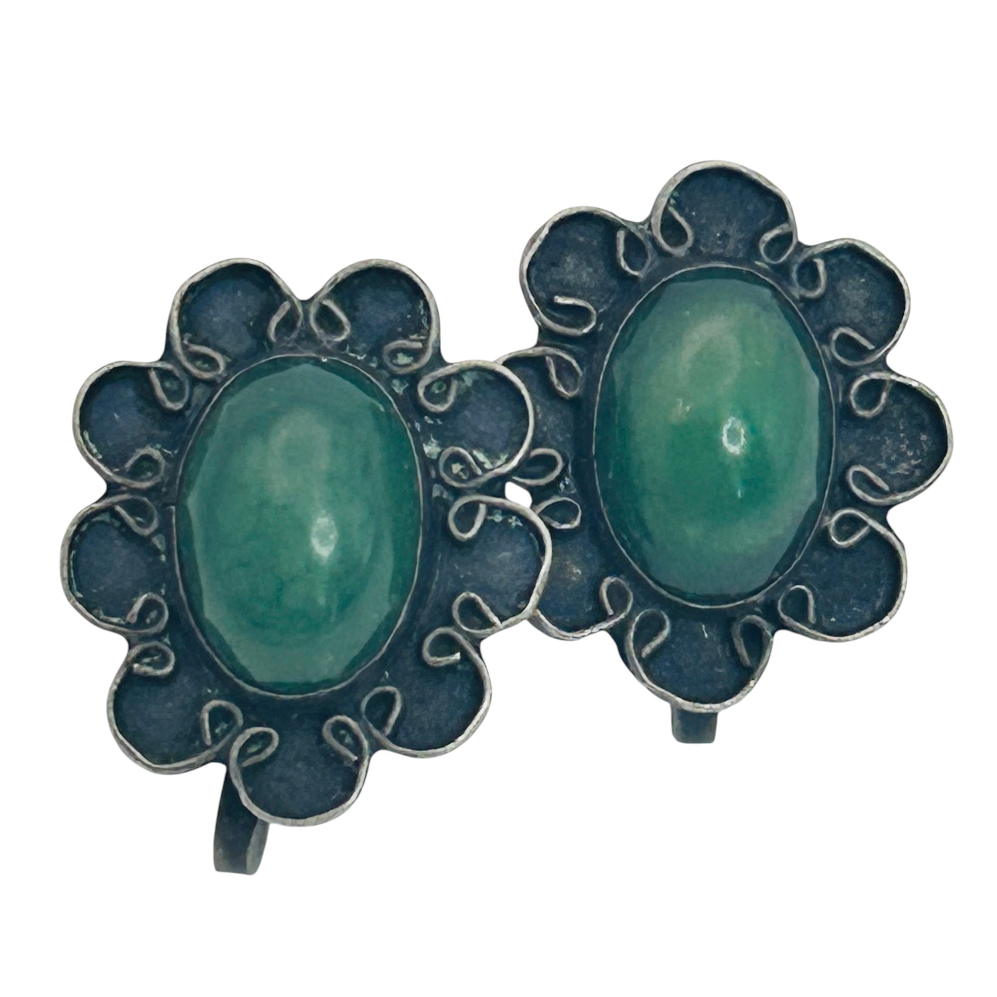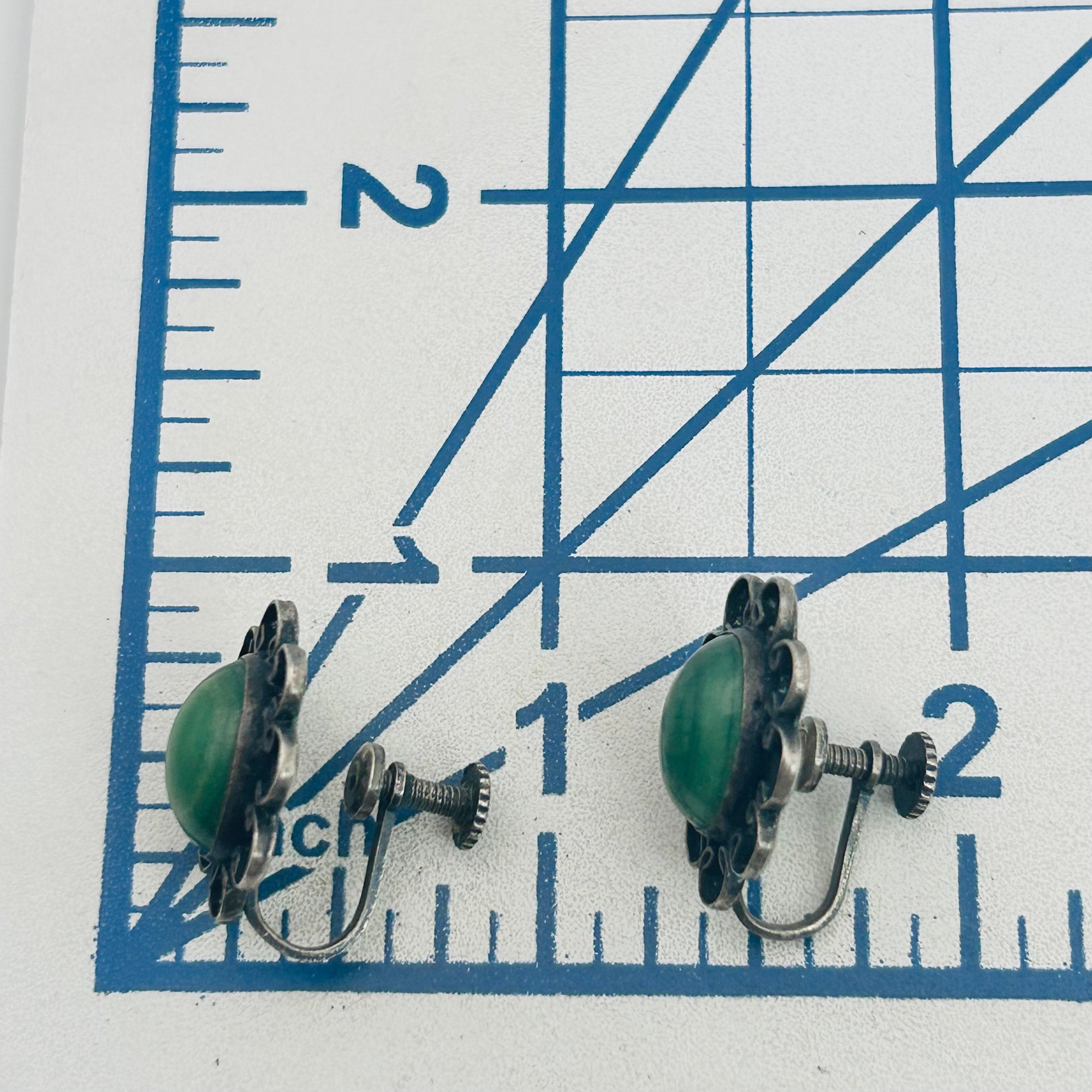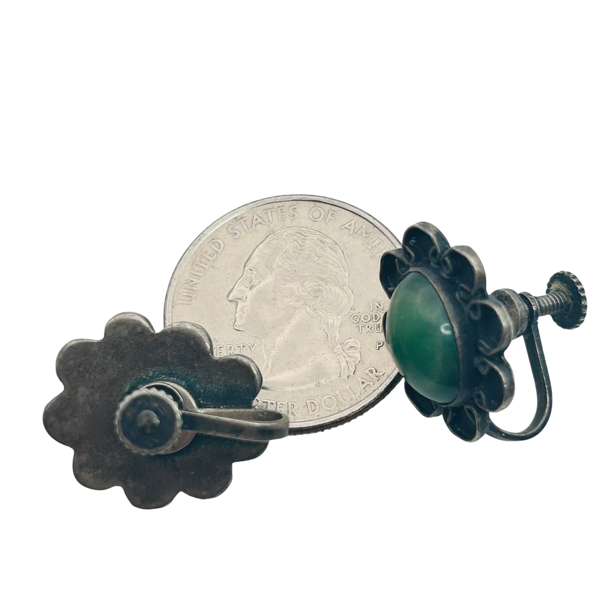 Vintage Mexico, Green Stone Flower Sterling Earrings Screwback 6.71 G