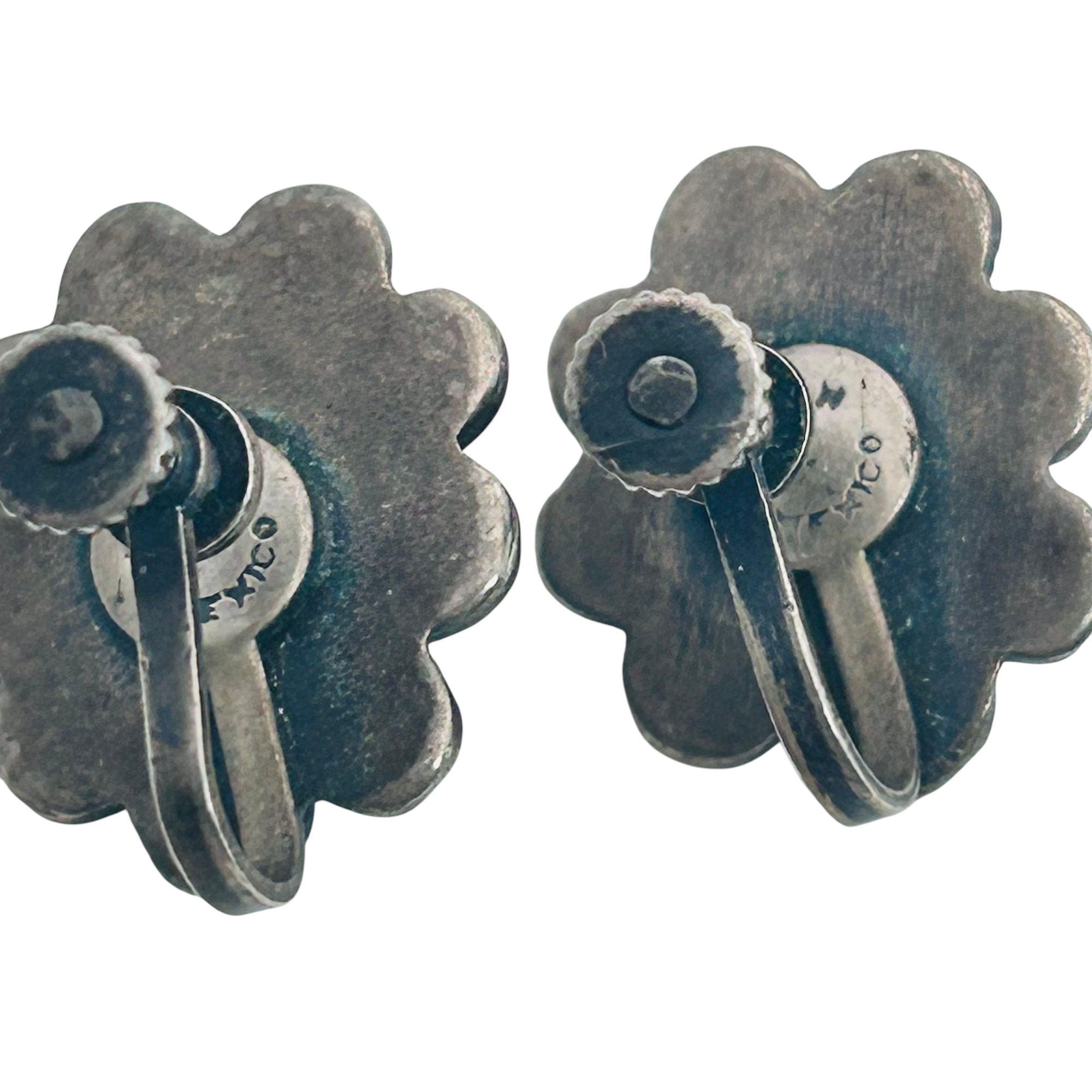 Vintage Mexico green stone flower Sterling earrings screwback 6.71 g