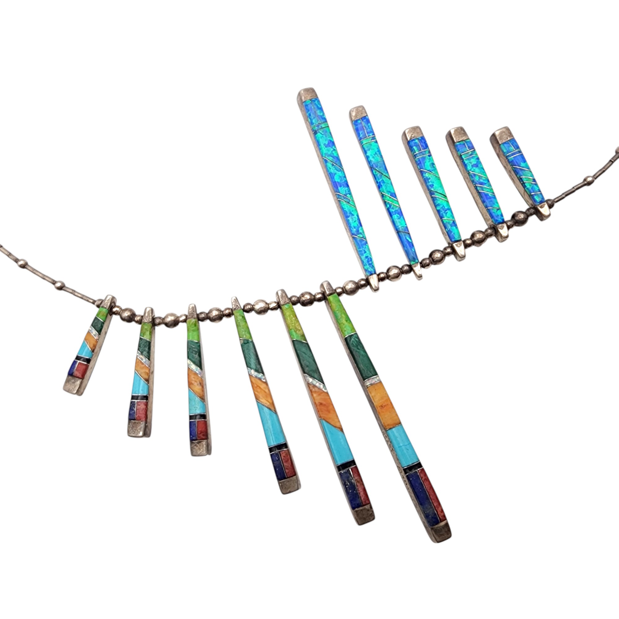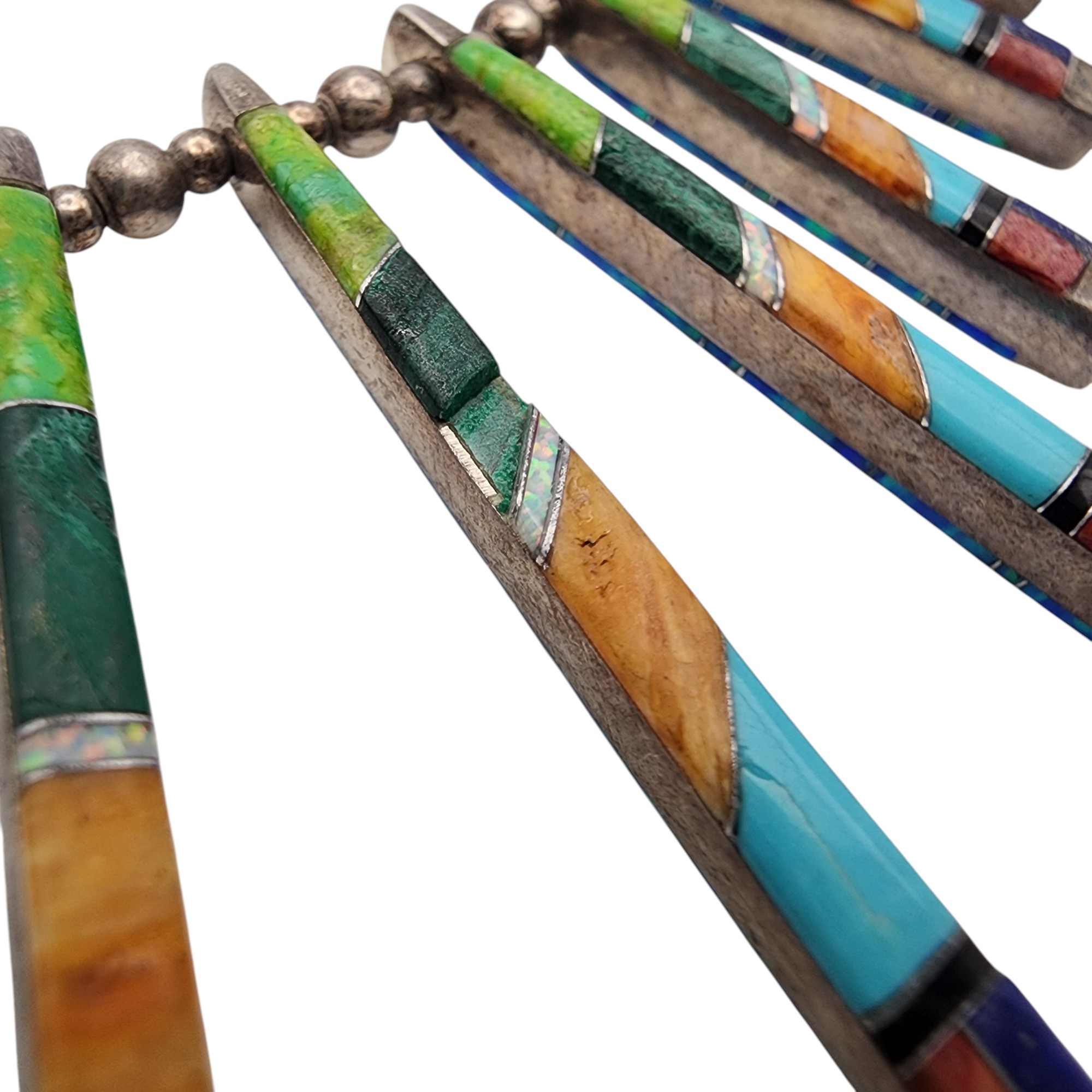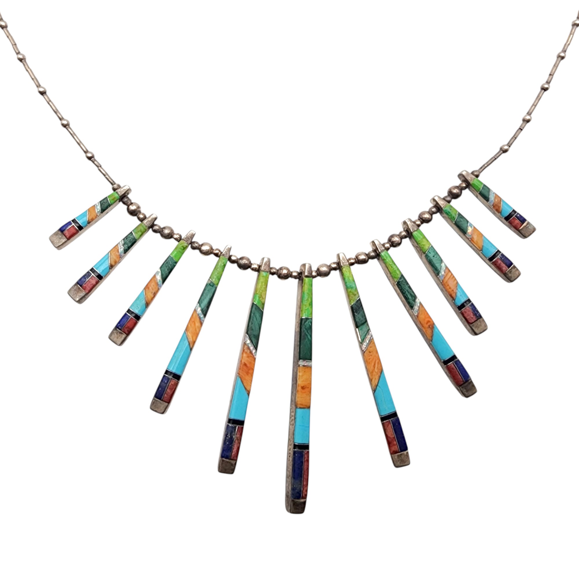 Sheryl Martinez Navajo Sterling Reversible Multistone Inlay Fringe Necklace, 18g, one partial piece of inlay missing, see photos