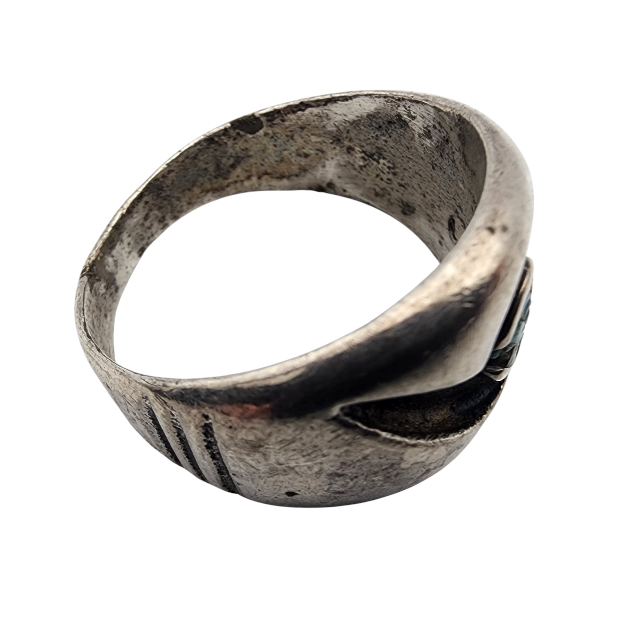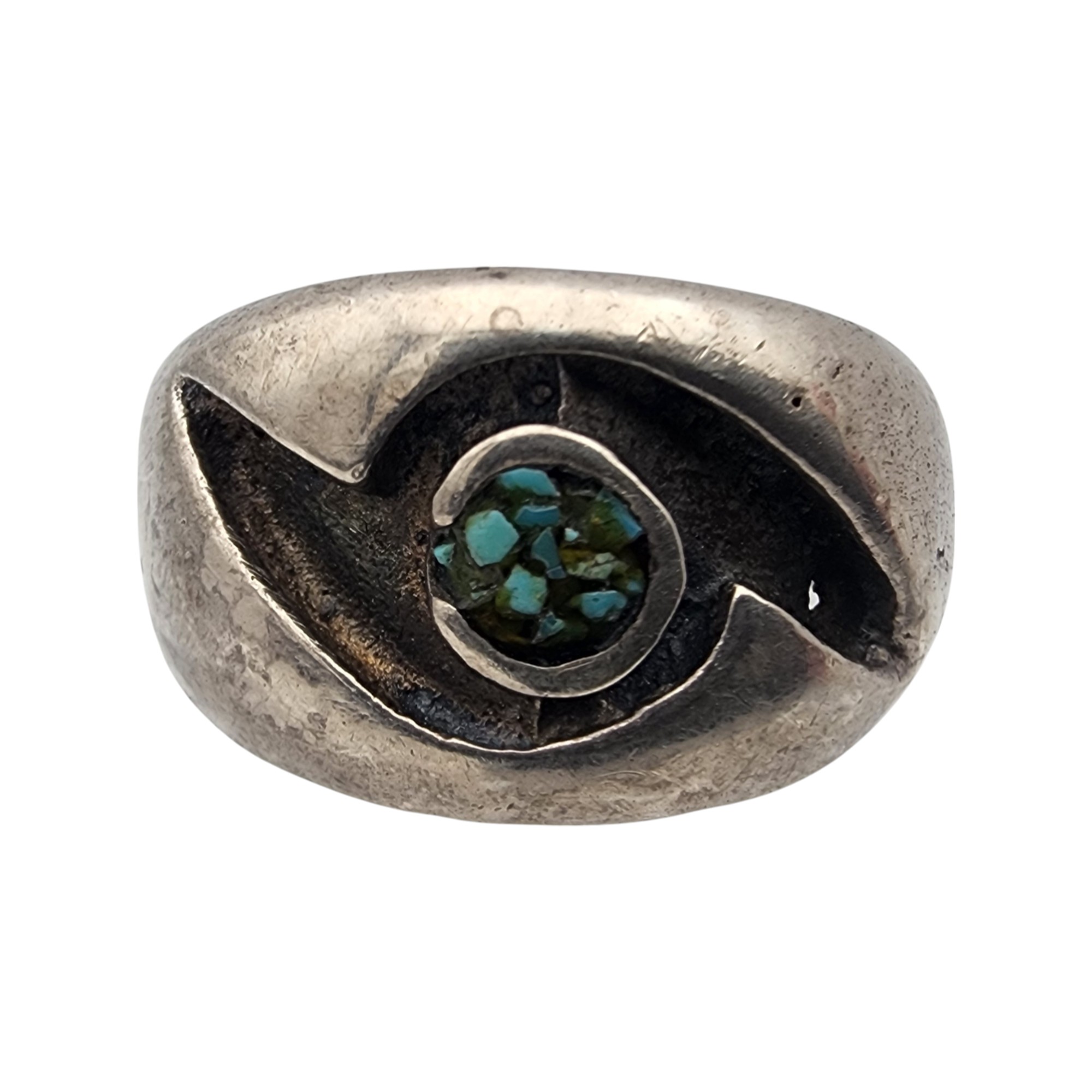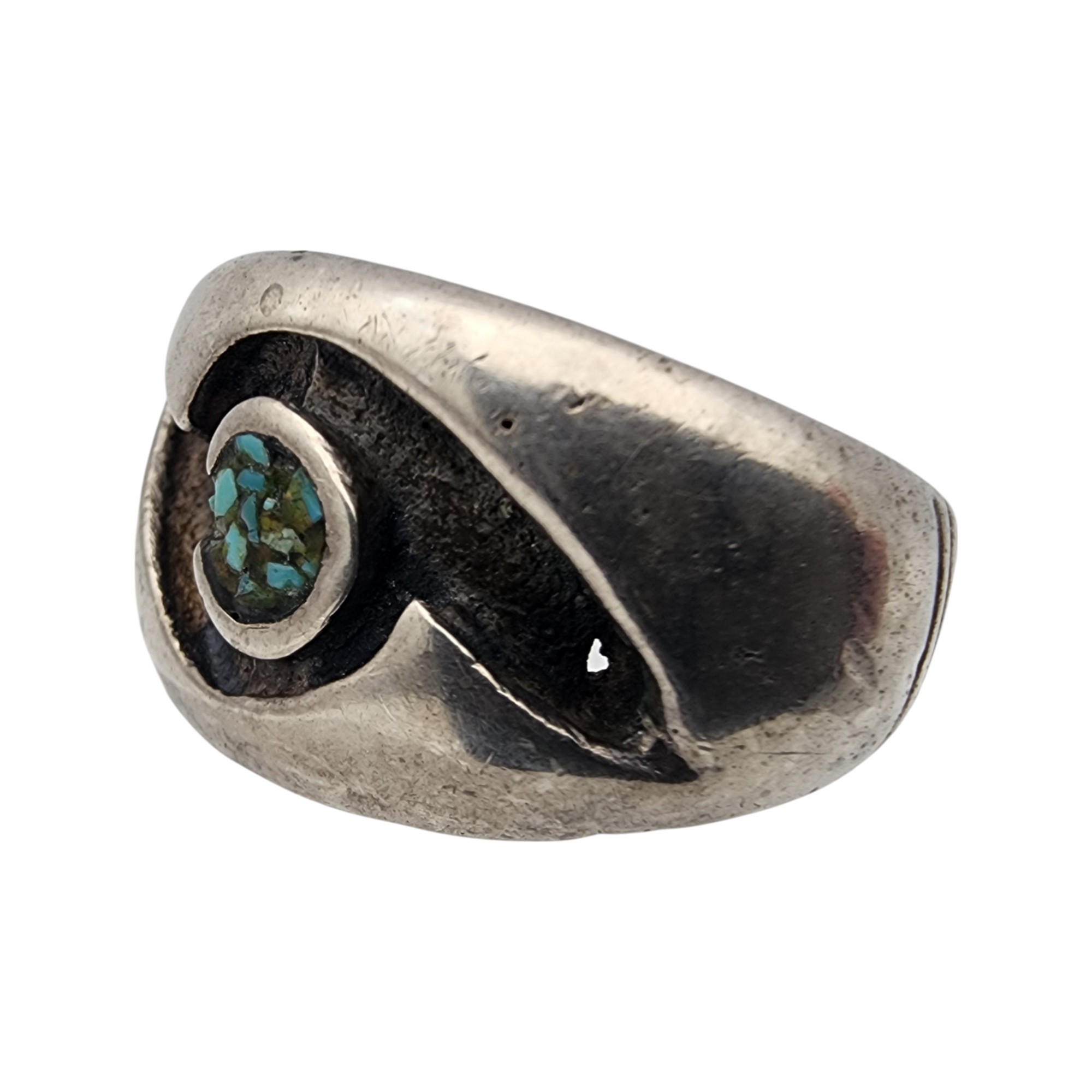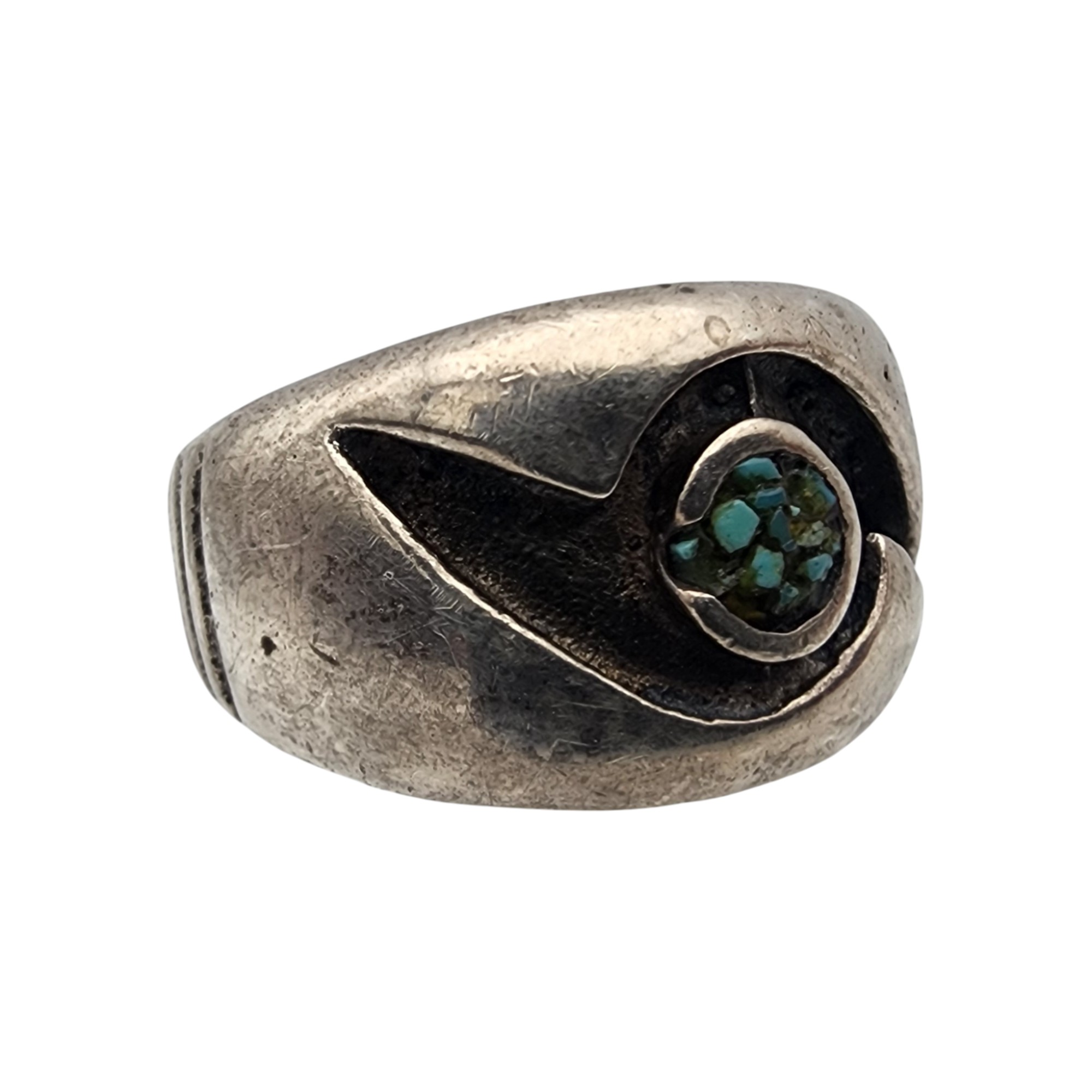 Vintage Navajo Sterling Turquoise Chip Inlay Ring Sz 10.5, 8.4g. ring band with slight warping, piece of bezel missing
