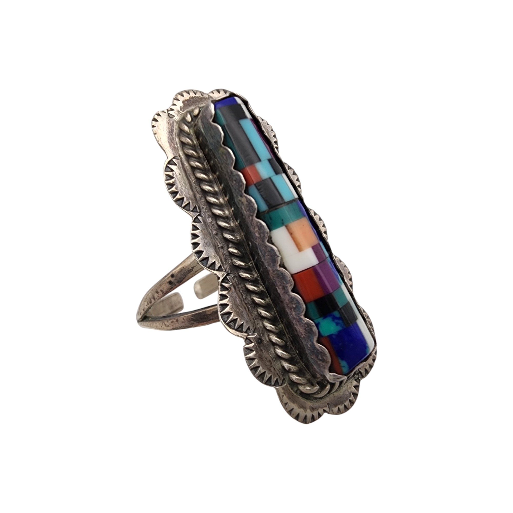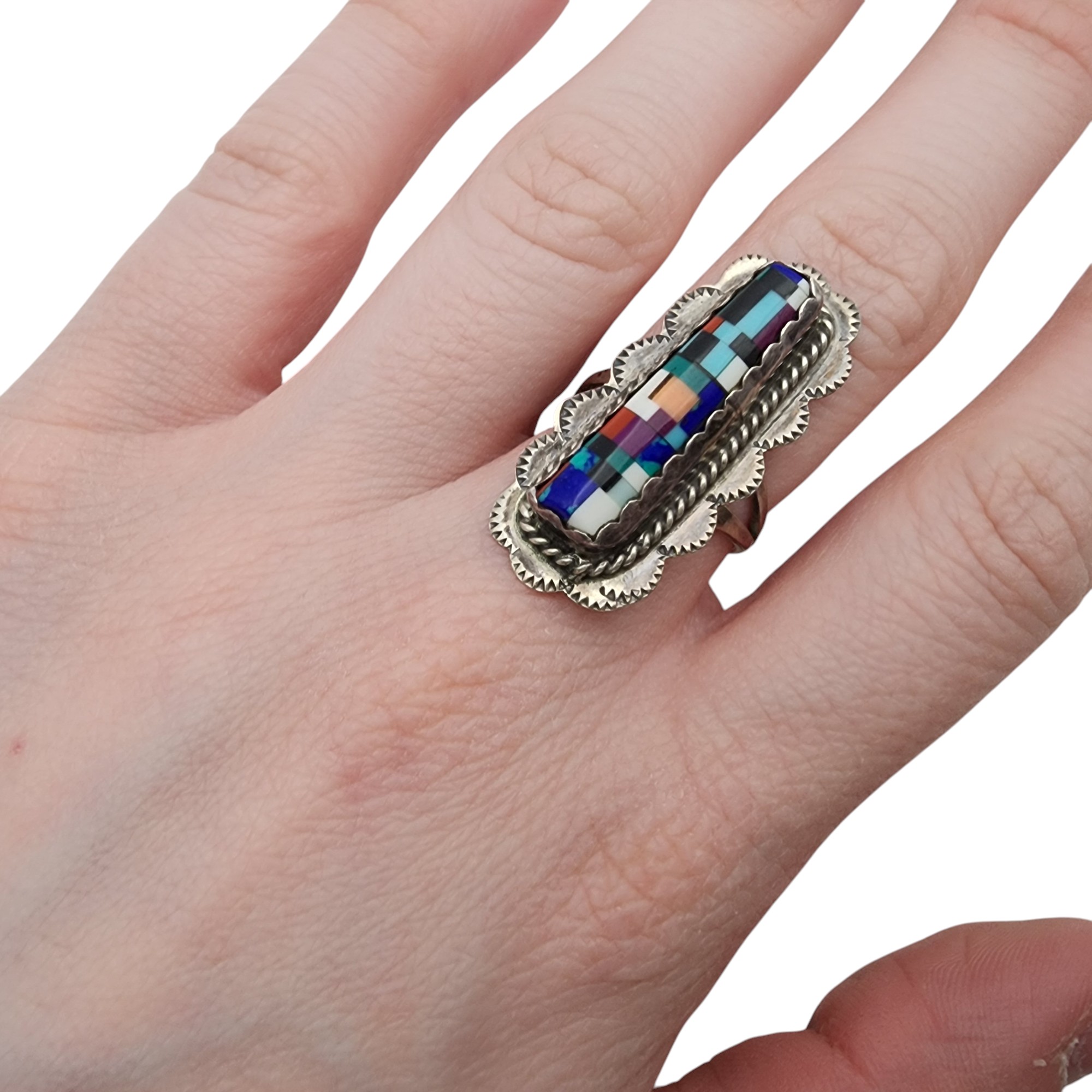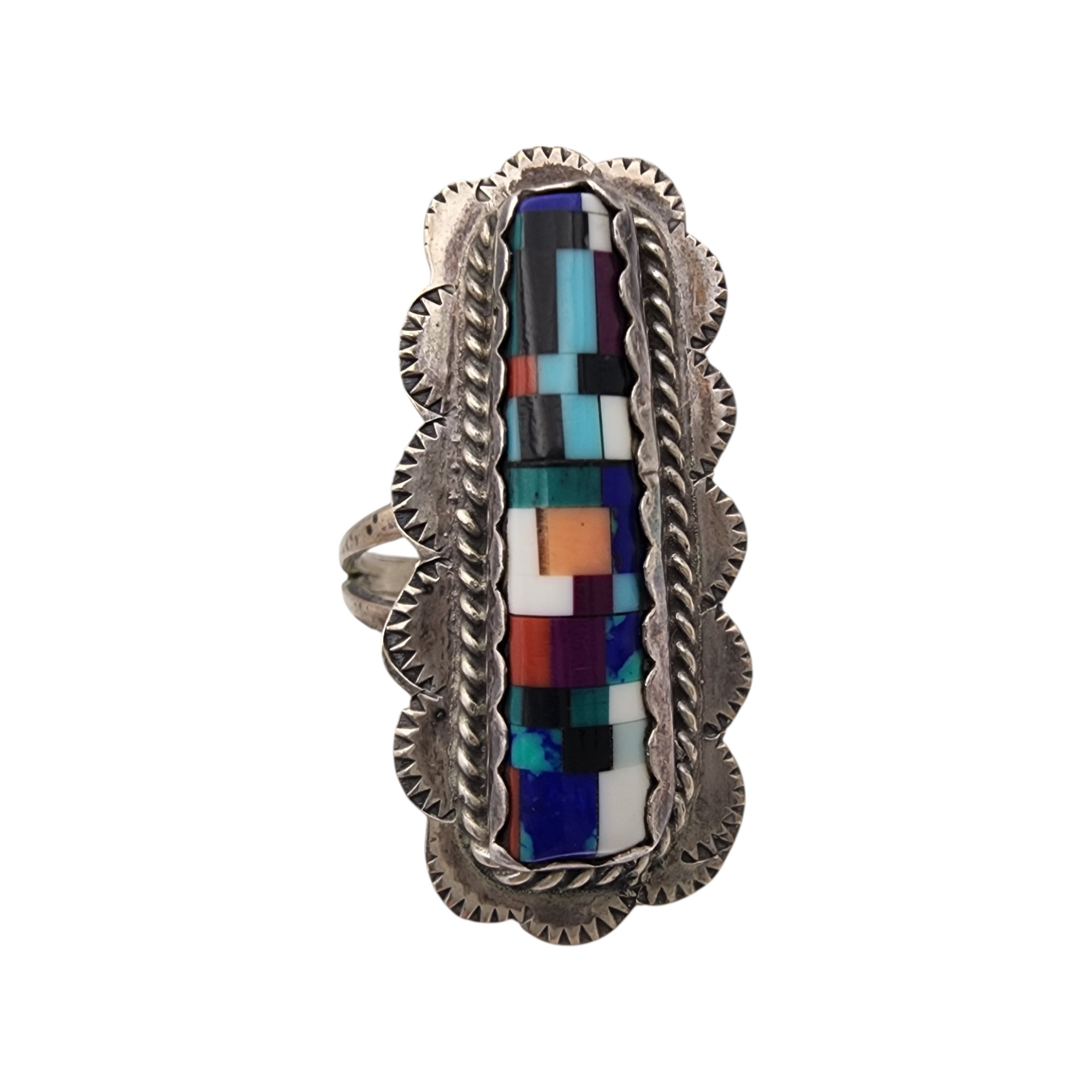 Southwestern Sterling Multistone Micro Inlay Ring, open/split ring, adjustable, currently around size 6.5-7, 5.8g