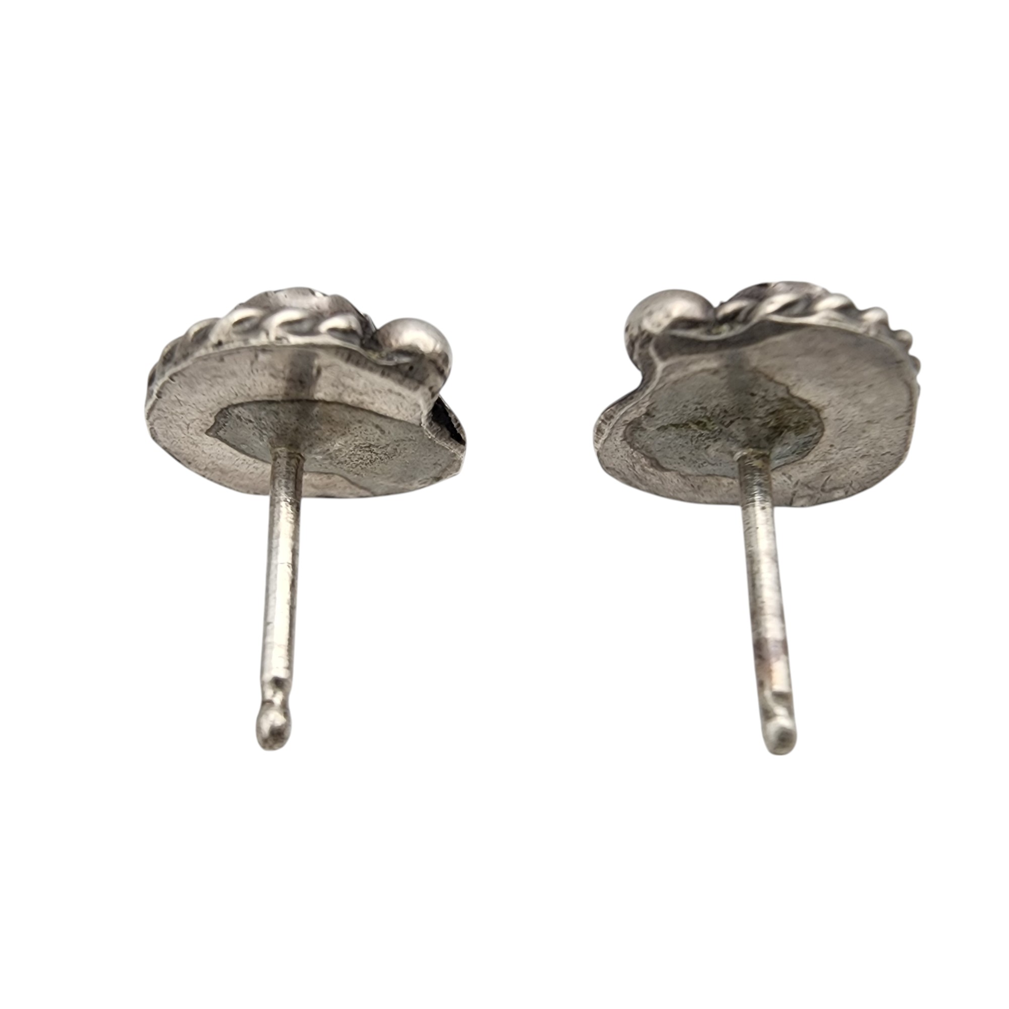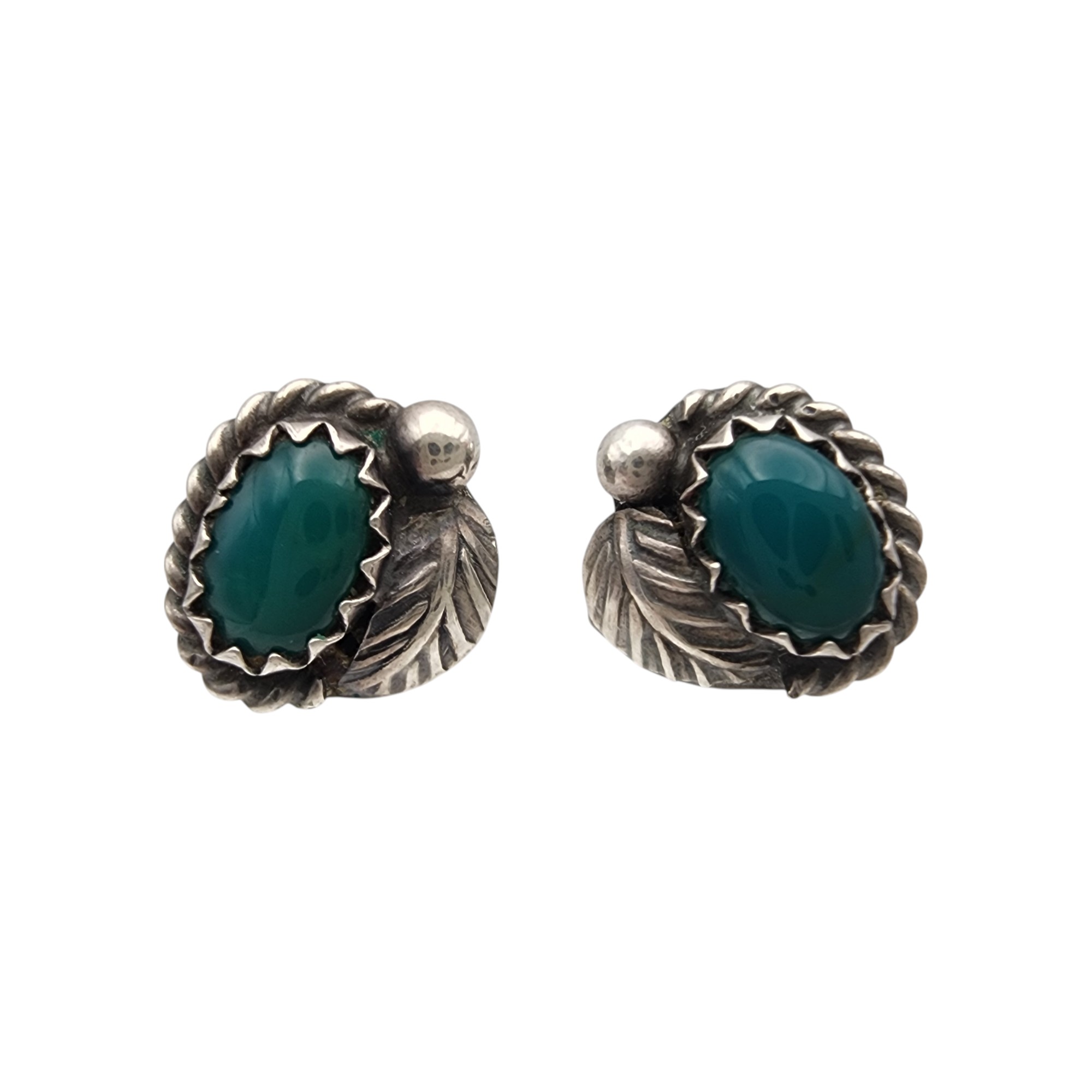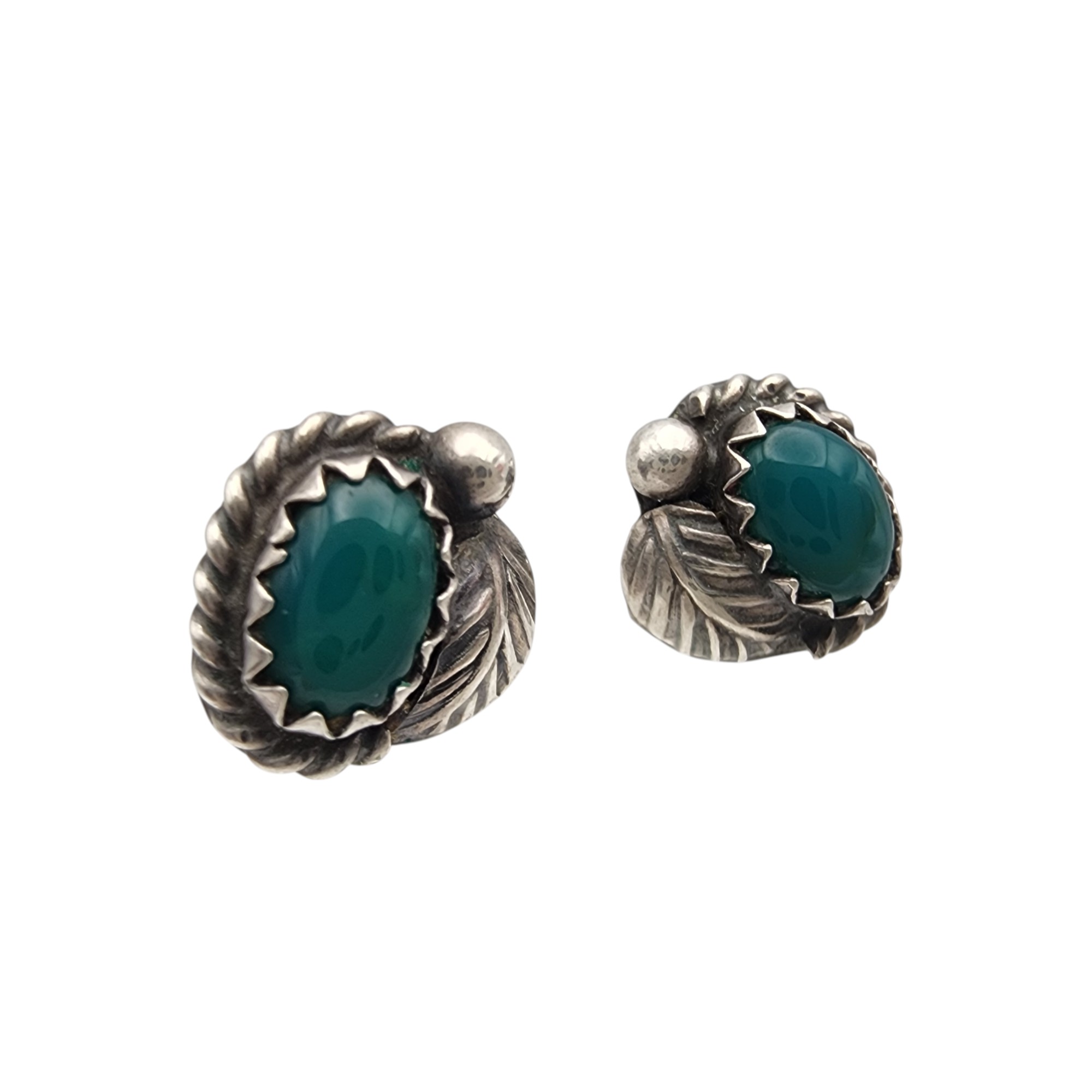 Vintage Navajo Sterling Turquoise? Earrings, 1.6g. May potentially be malachite – stone color is a blueish-green. No banding noted in stone, so likely turquoise, but unable to confirm.