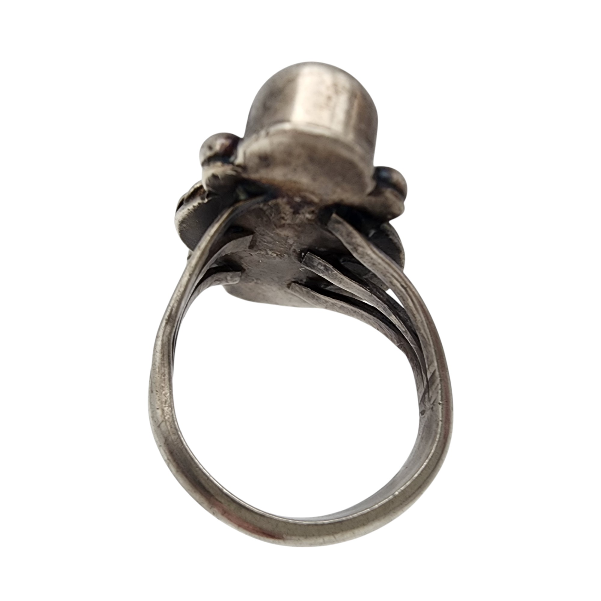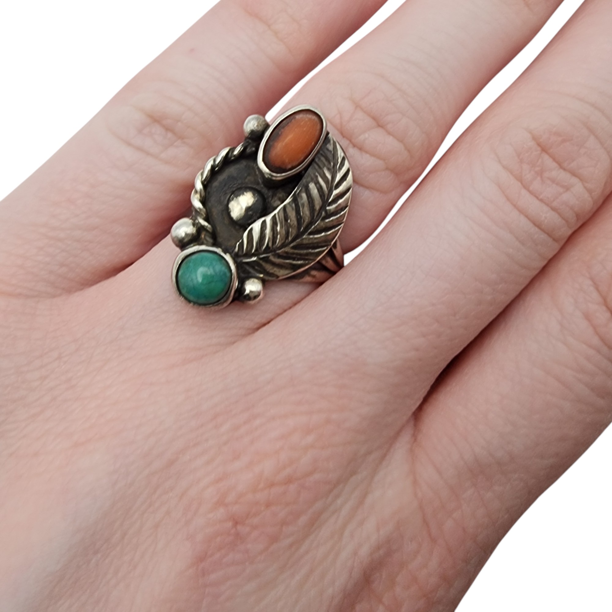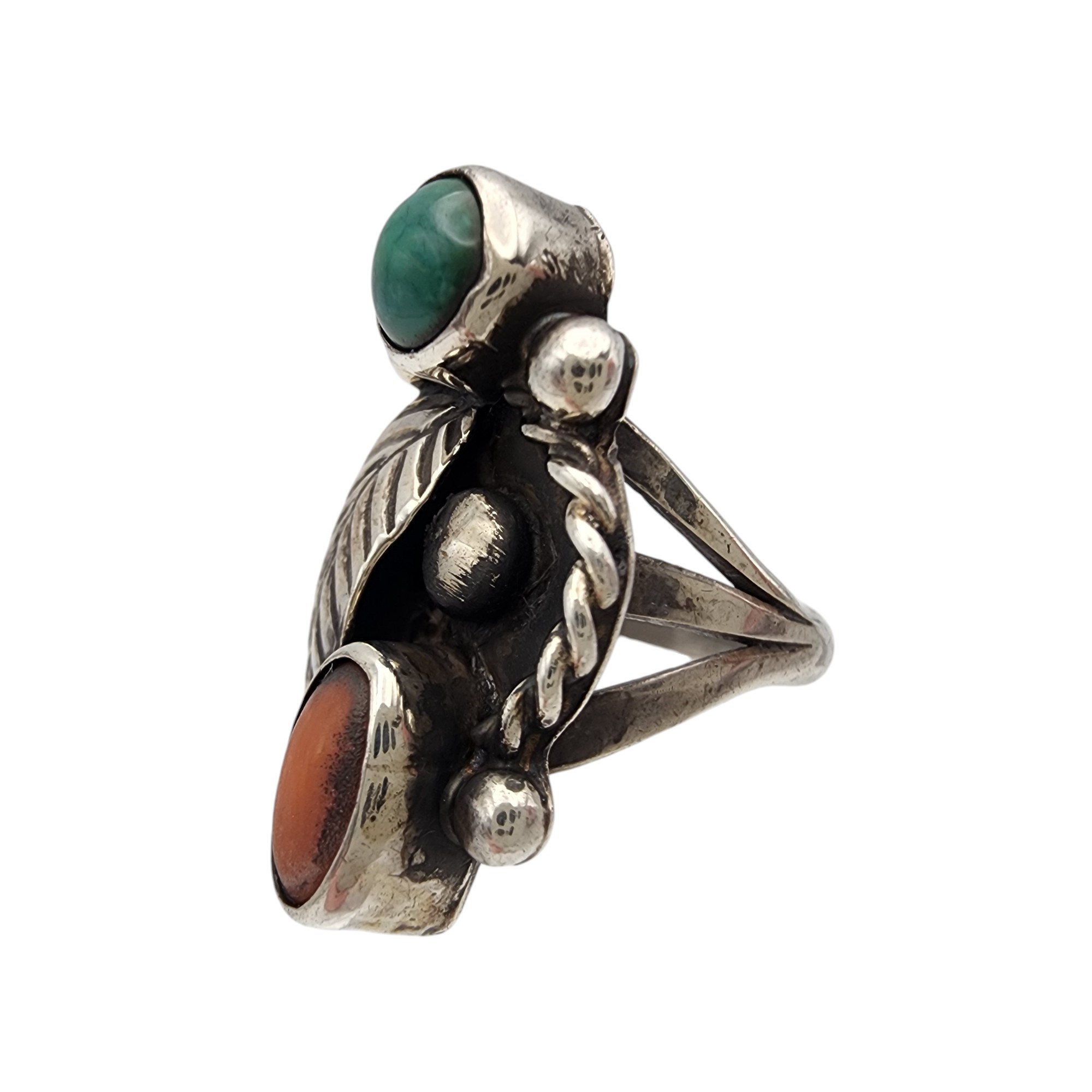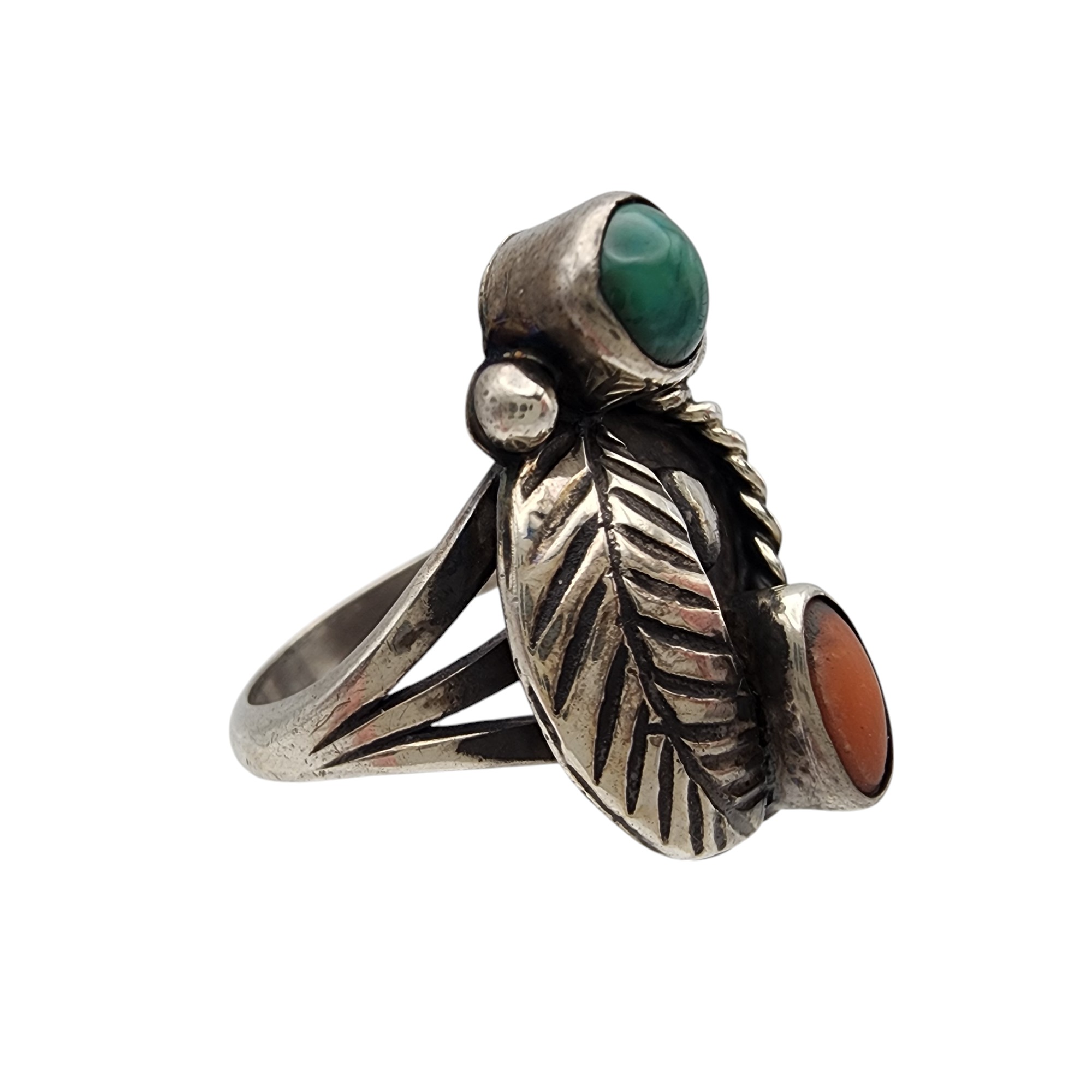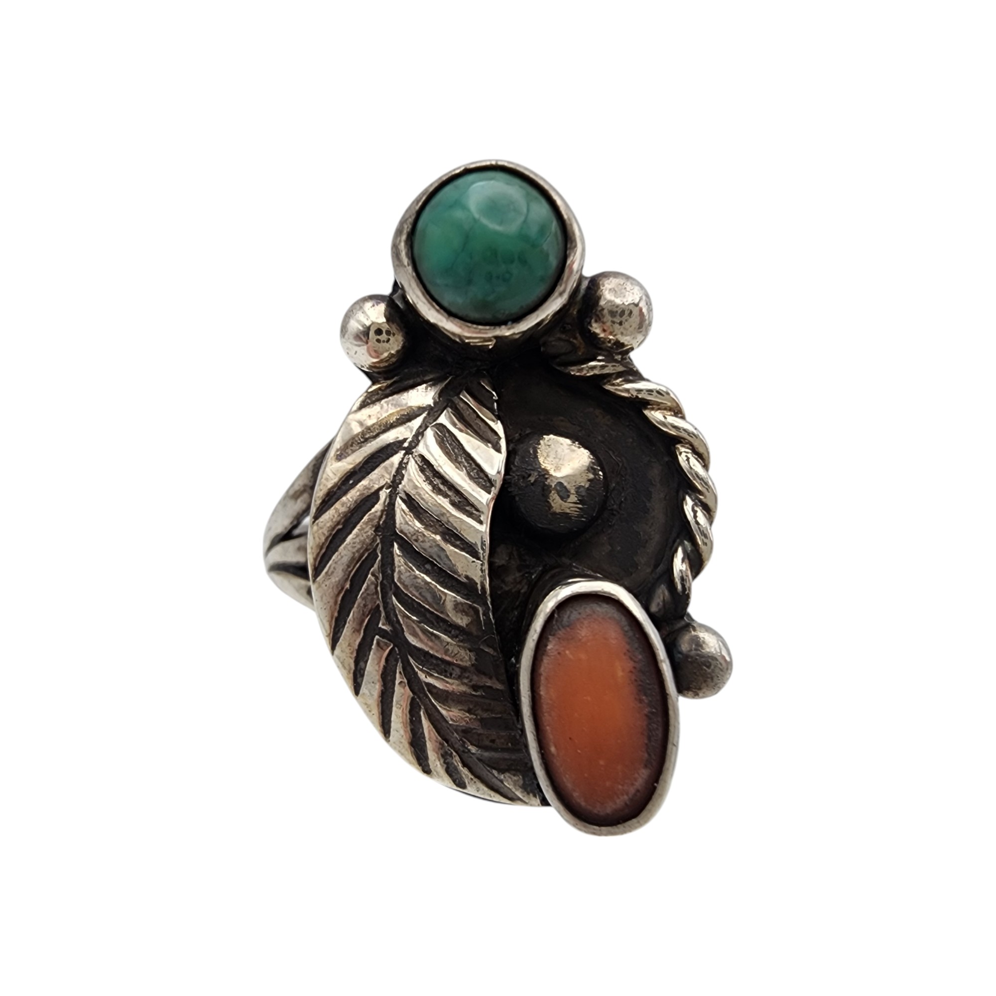 Vintage Navajo Sterling Turquoise Coral Ring Sz 5, ring band out of shape, 5.6g