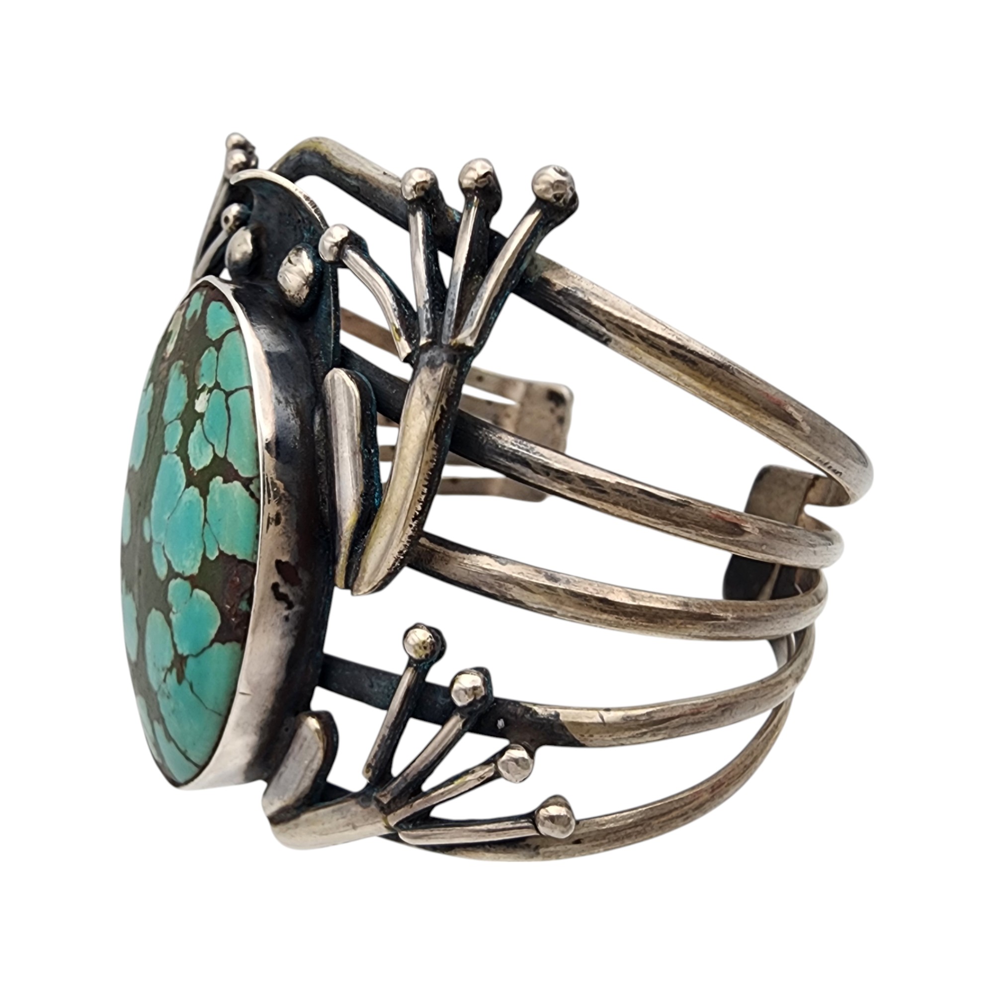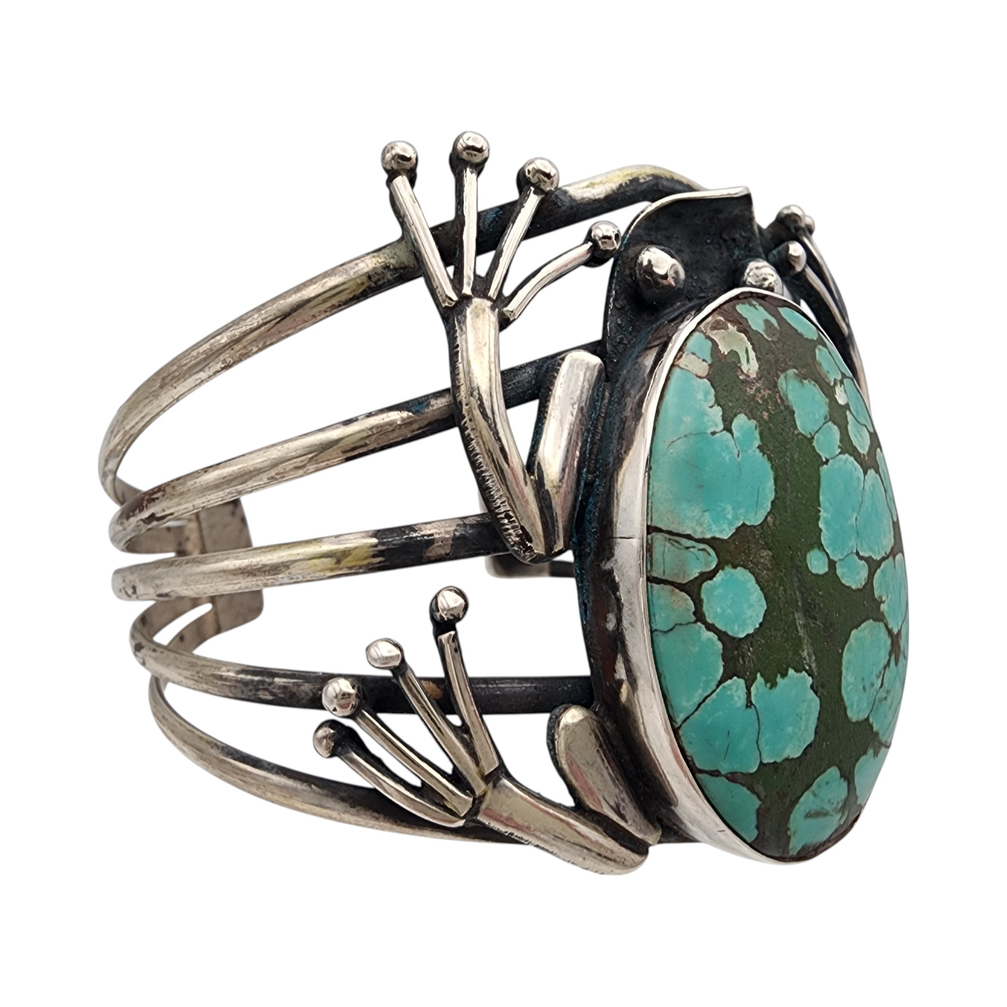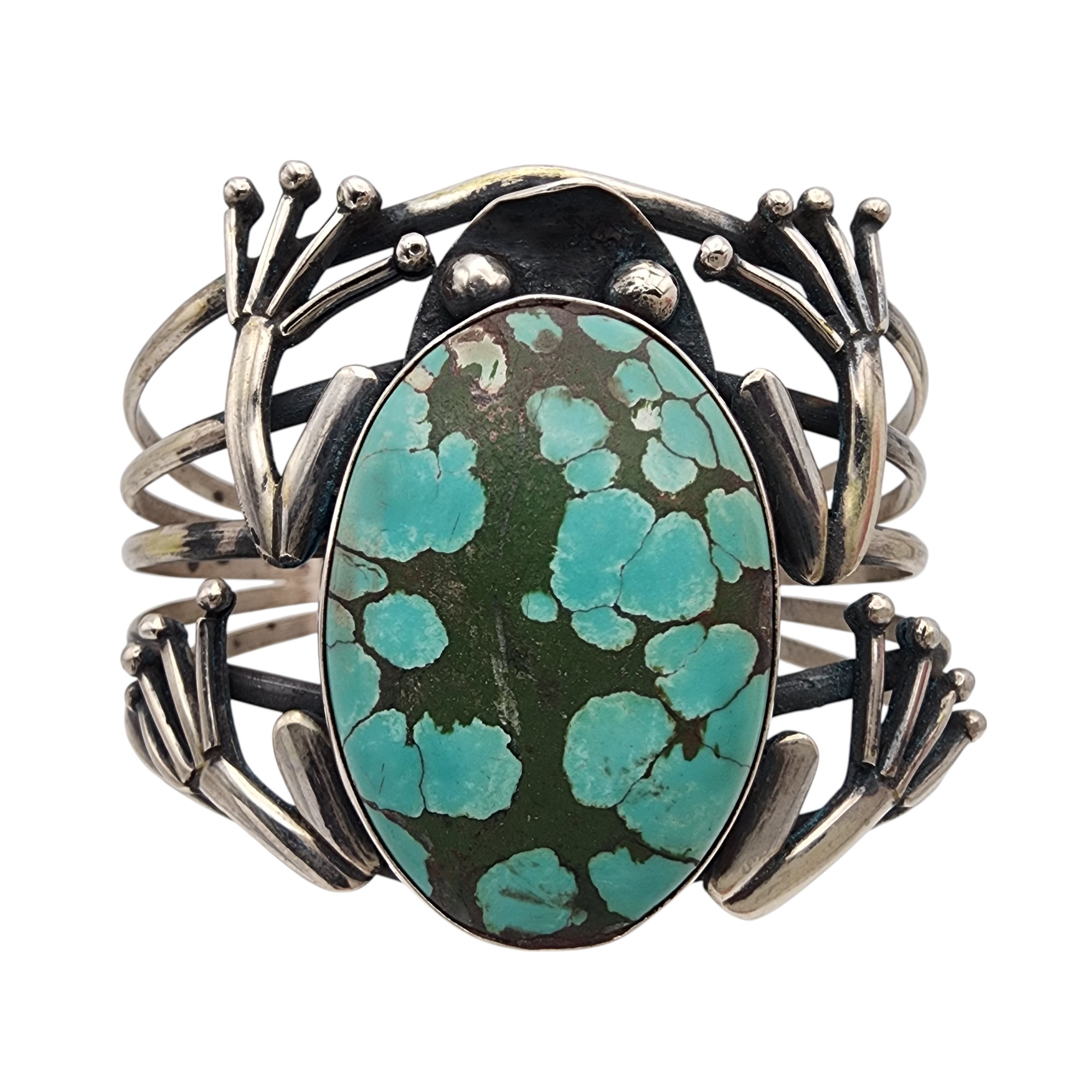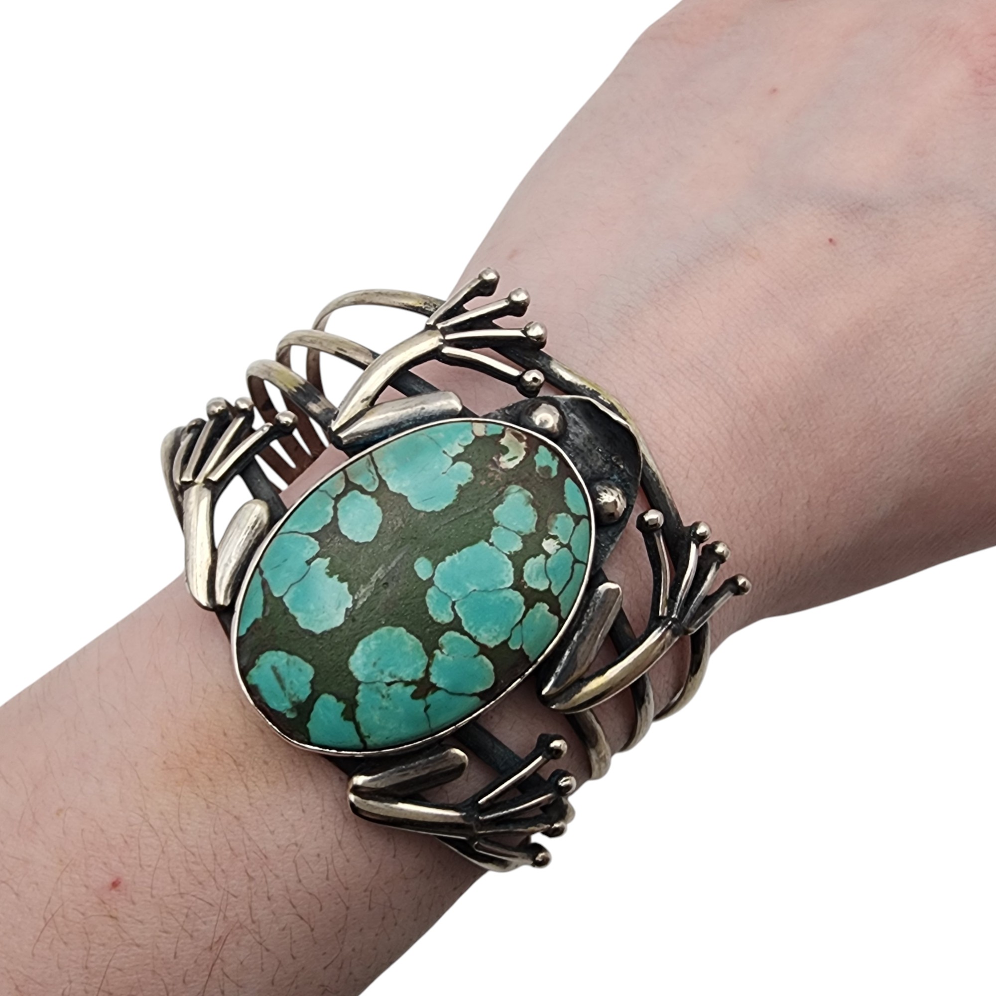 Southwestern Sterling Frog Cuff Bracelet, 51.8g, as is, unable to confirm type of stone – likely a faux turquoise or dyed howlite.