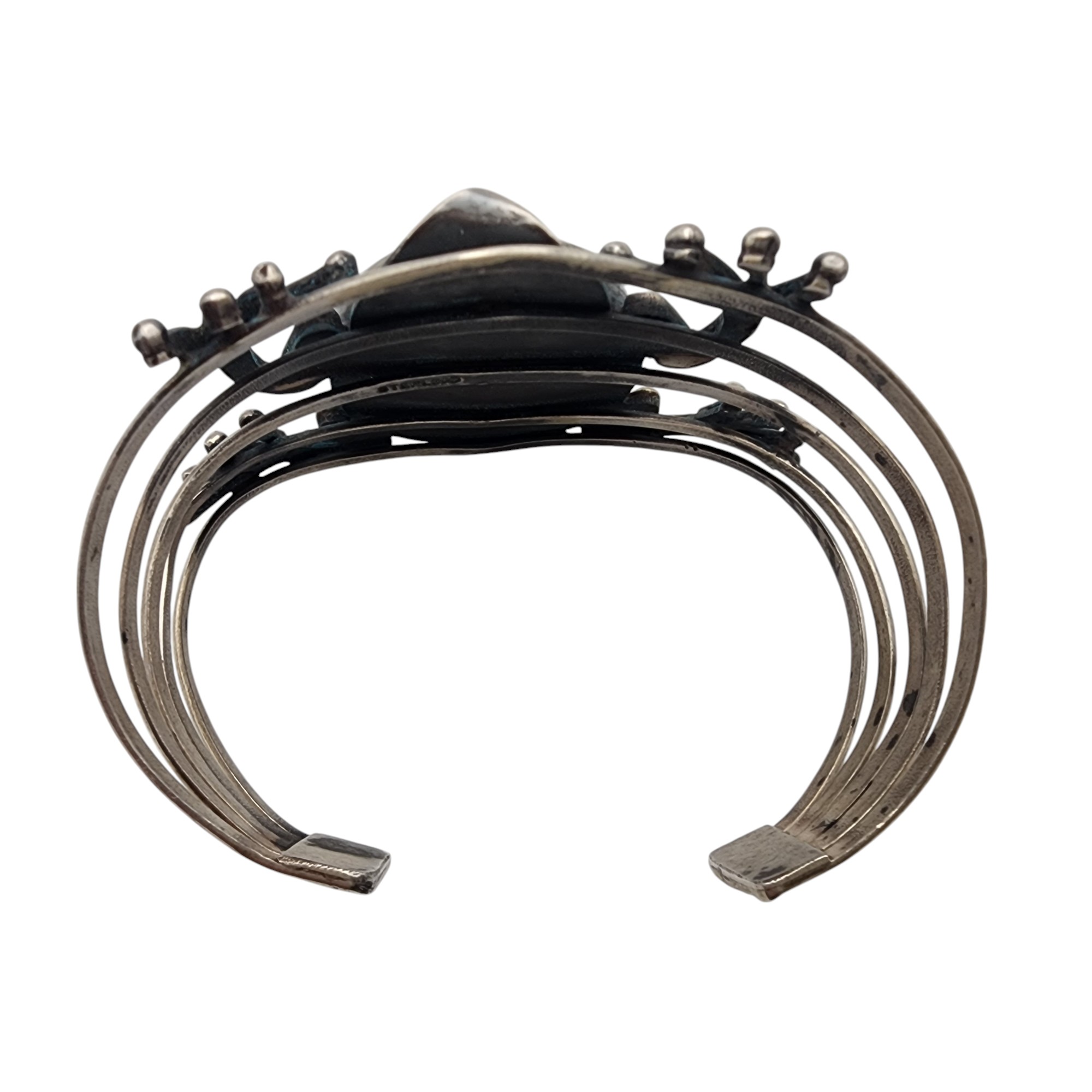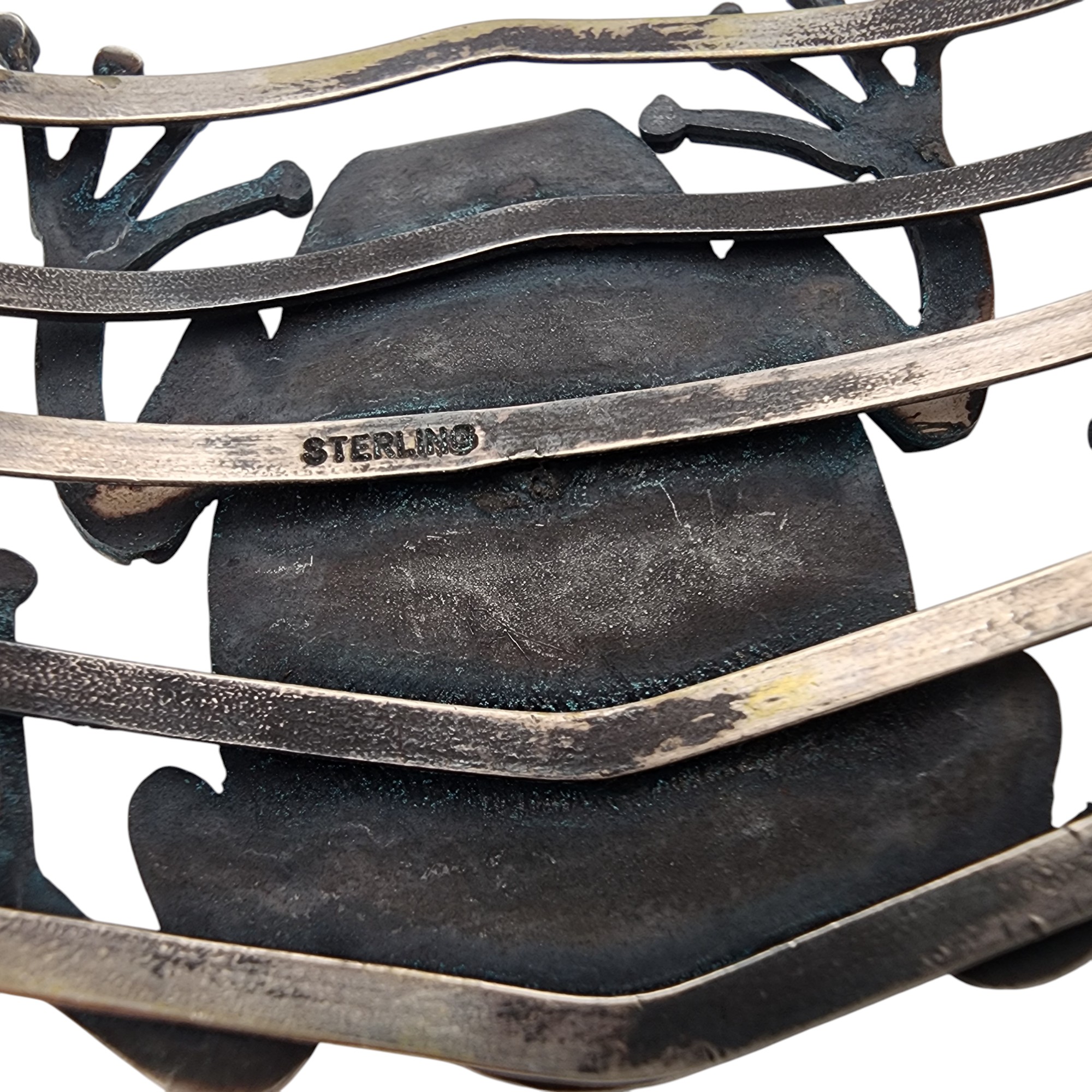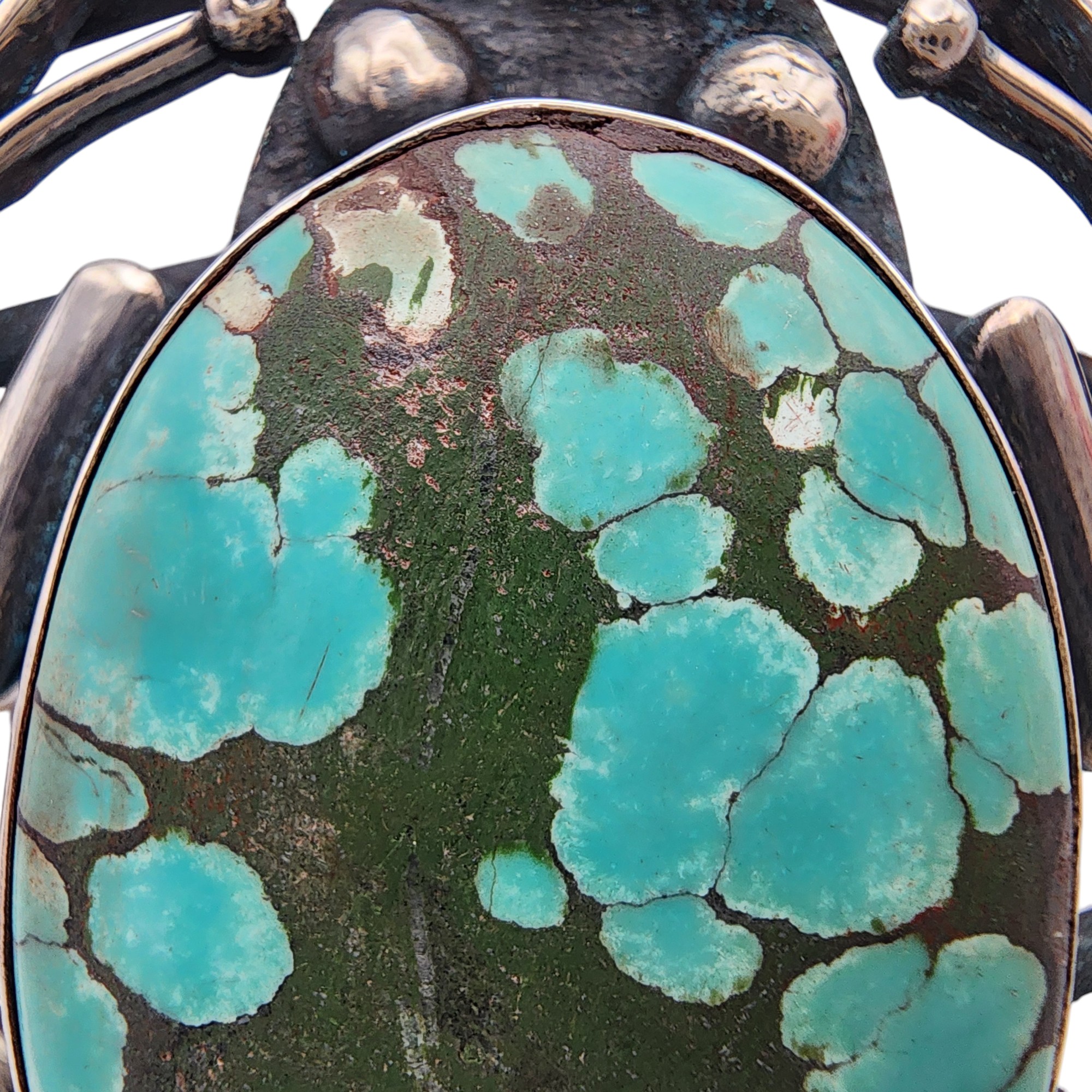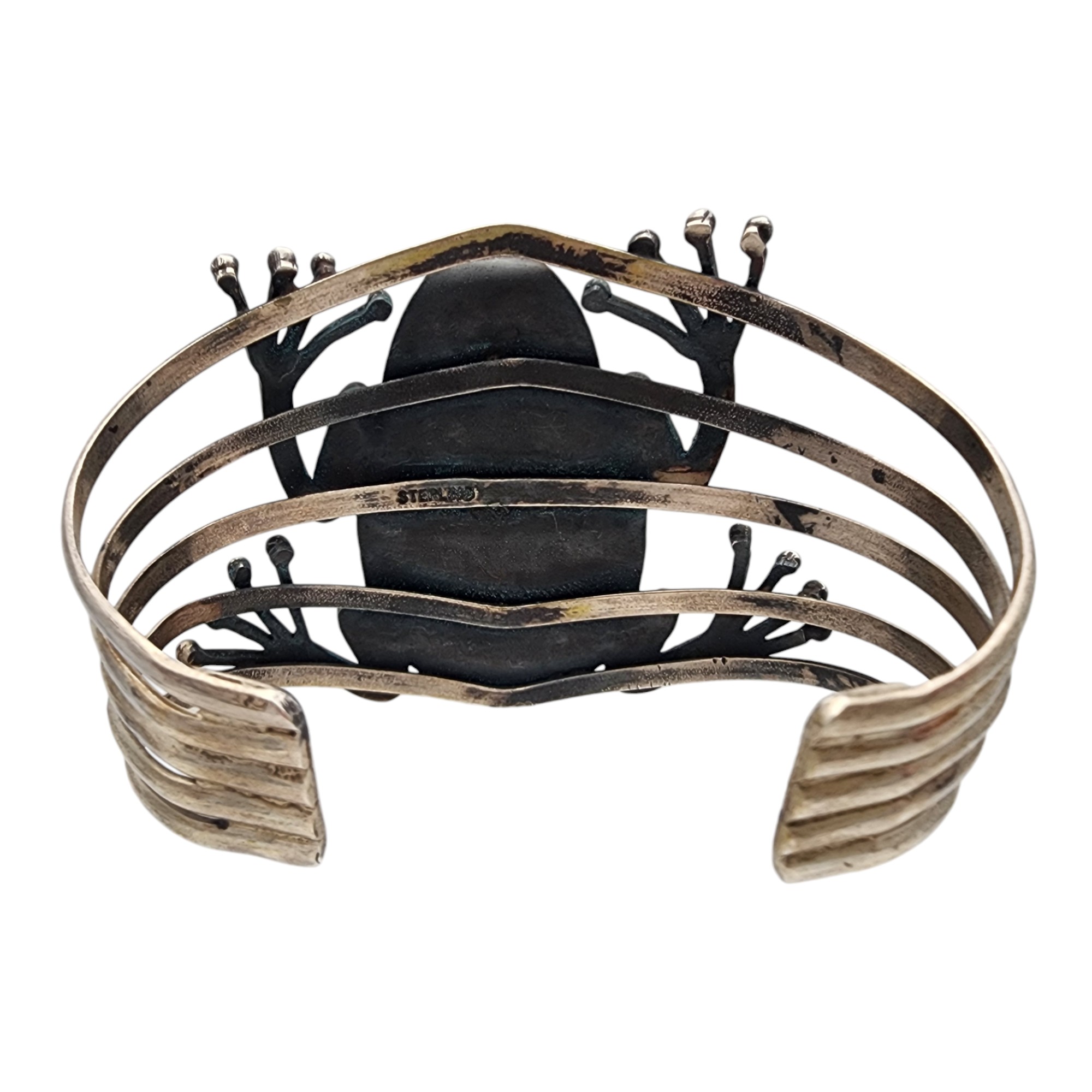 Southwestern Sterling Frog Cuff Bracelet, 51.8g, as is, unable to confirm type of stone – likely a faux turquoise or dyed howlite.
