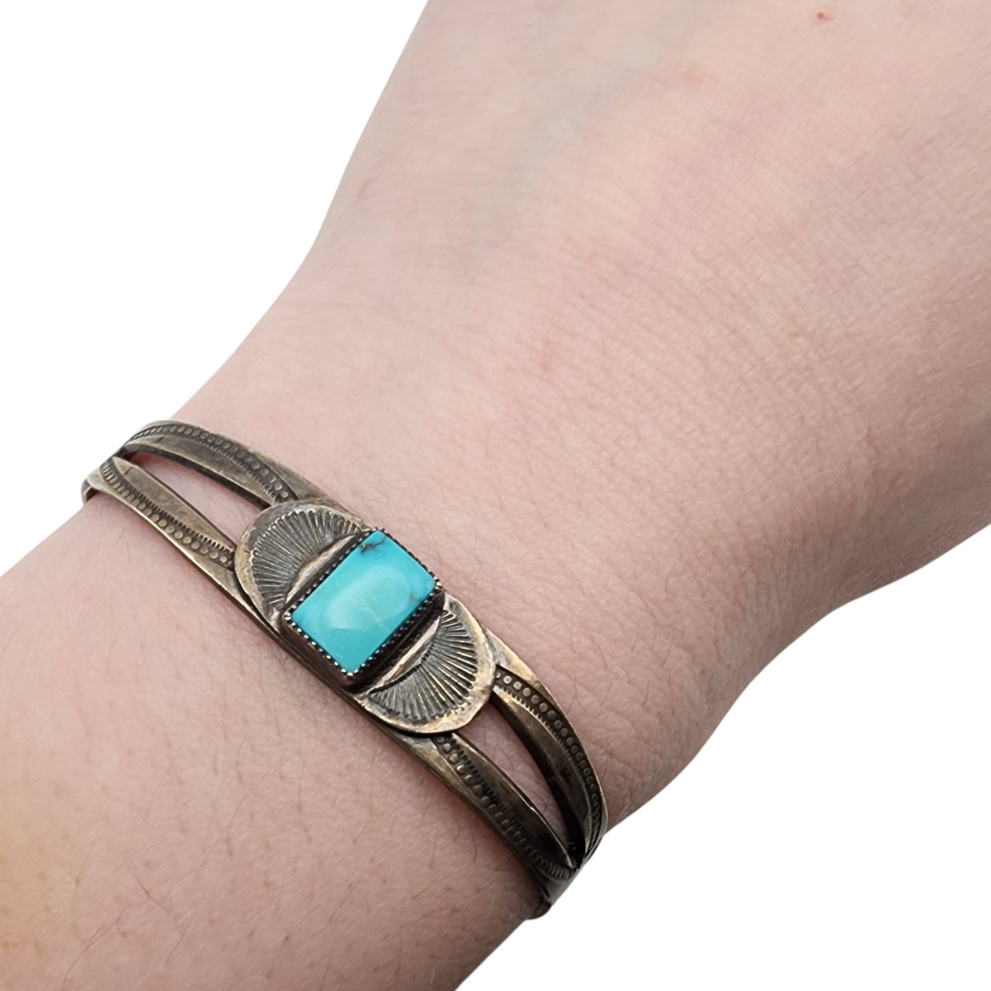 Fred Harvey Era Sterling Turquoise Stamped Cuff Bracelet, 7.5g, small size