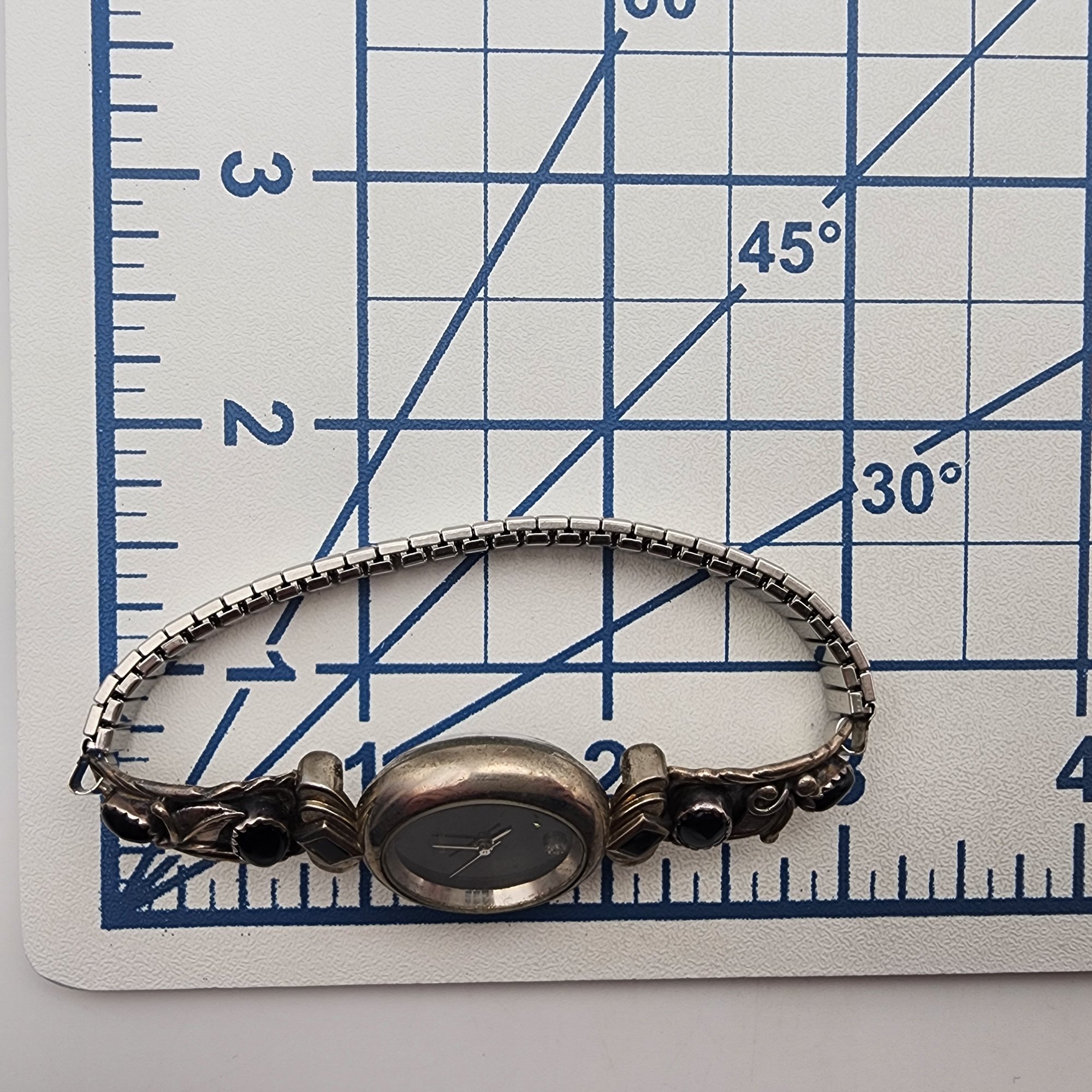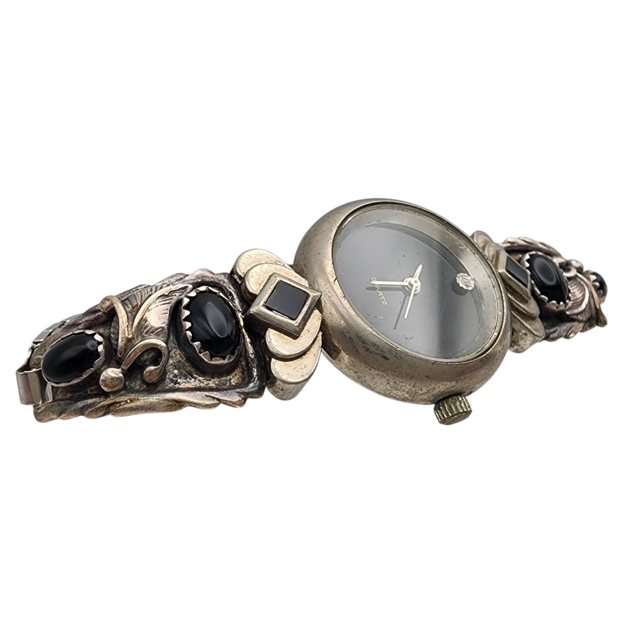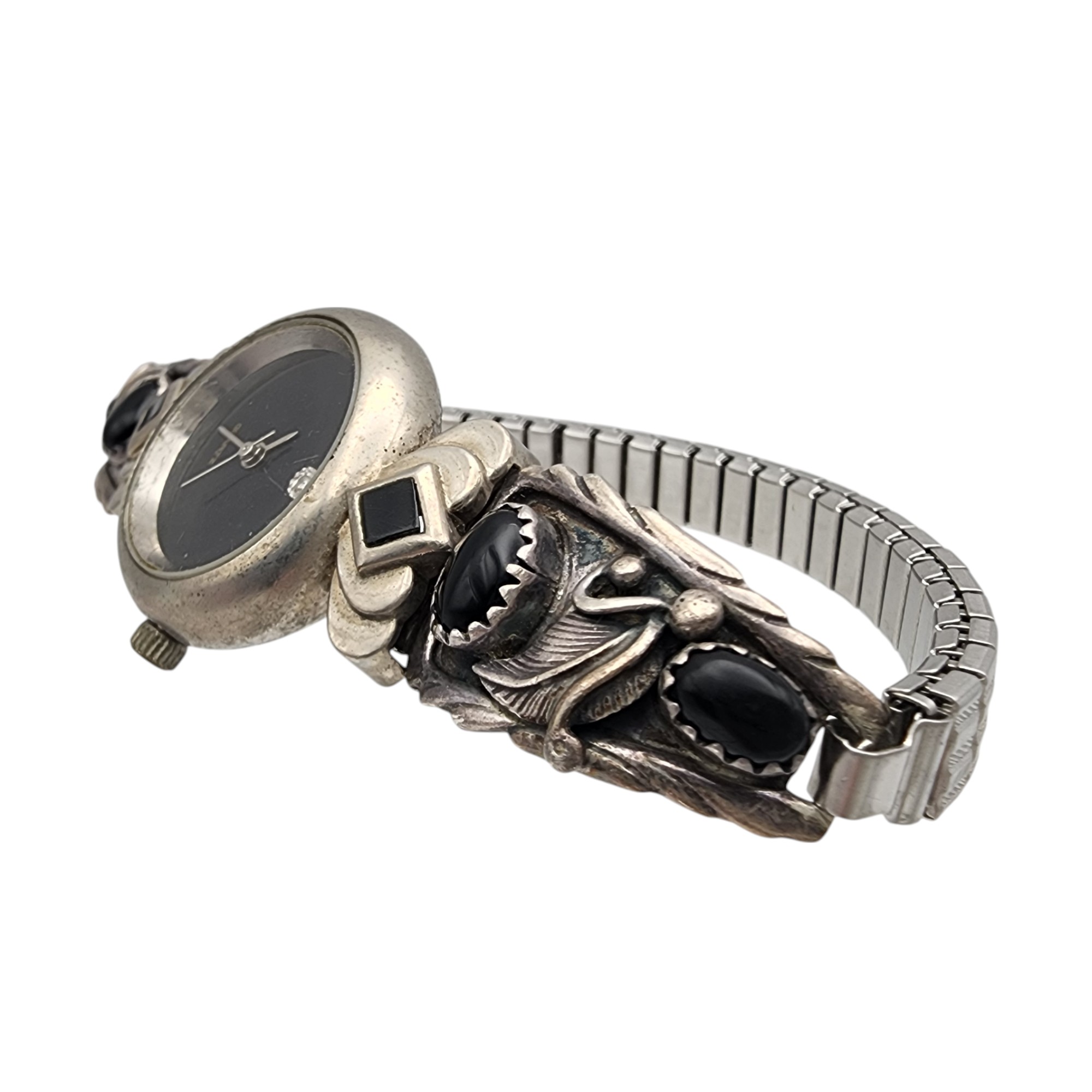 Navajo Sterling Onyx Watch Tips on a stainless steel band, 25.6g, watch needs battery