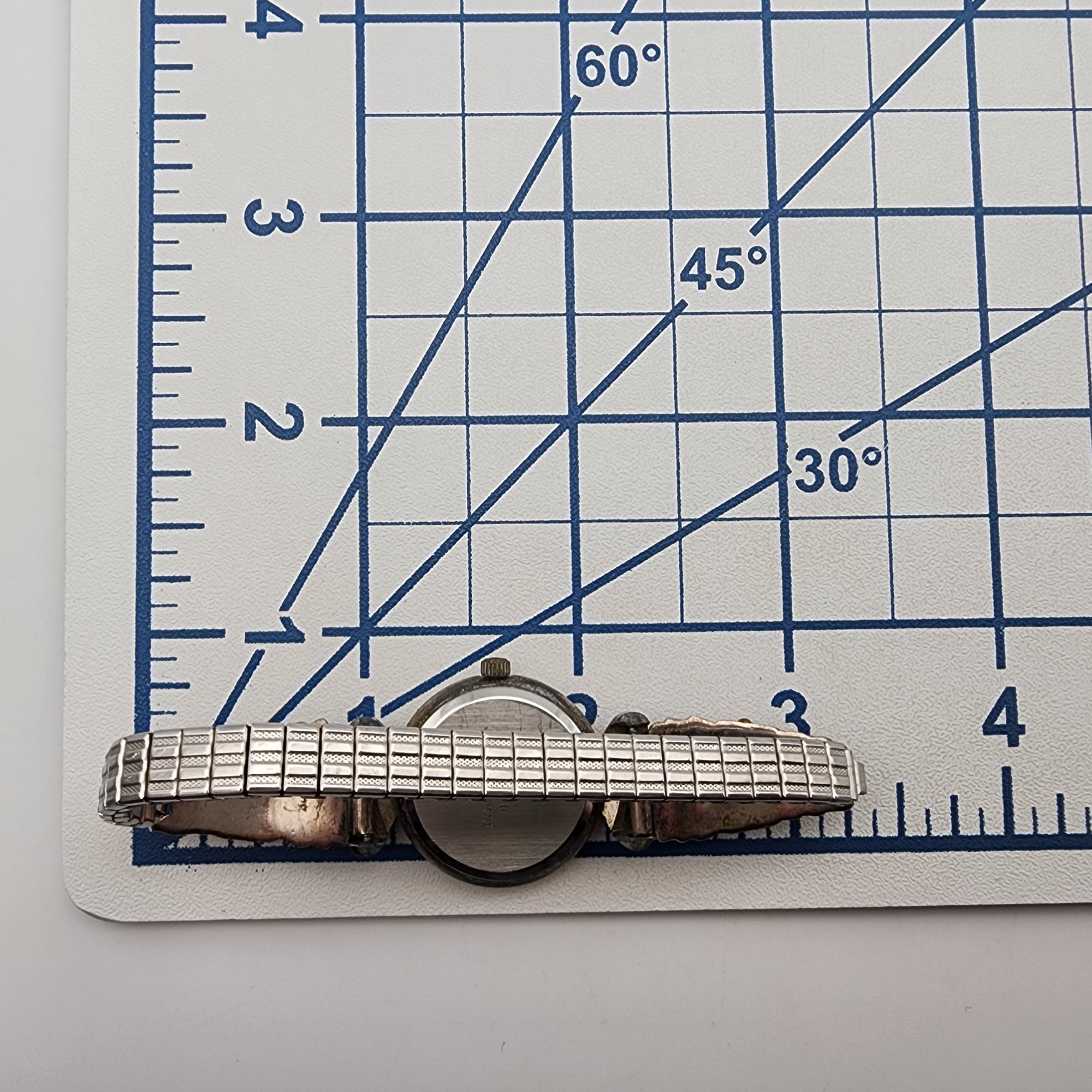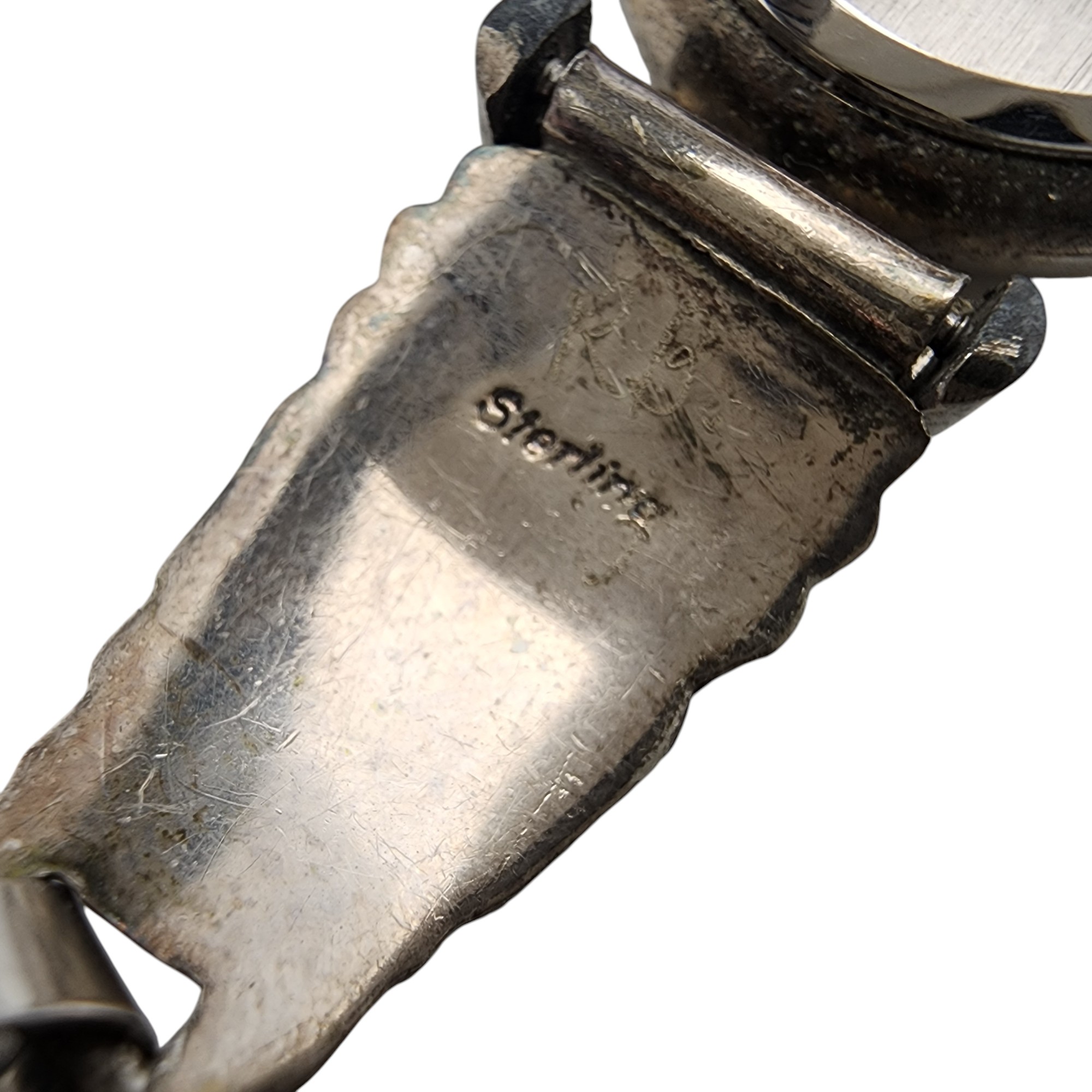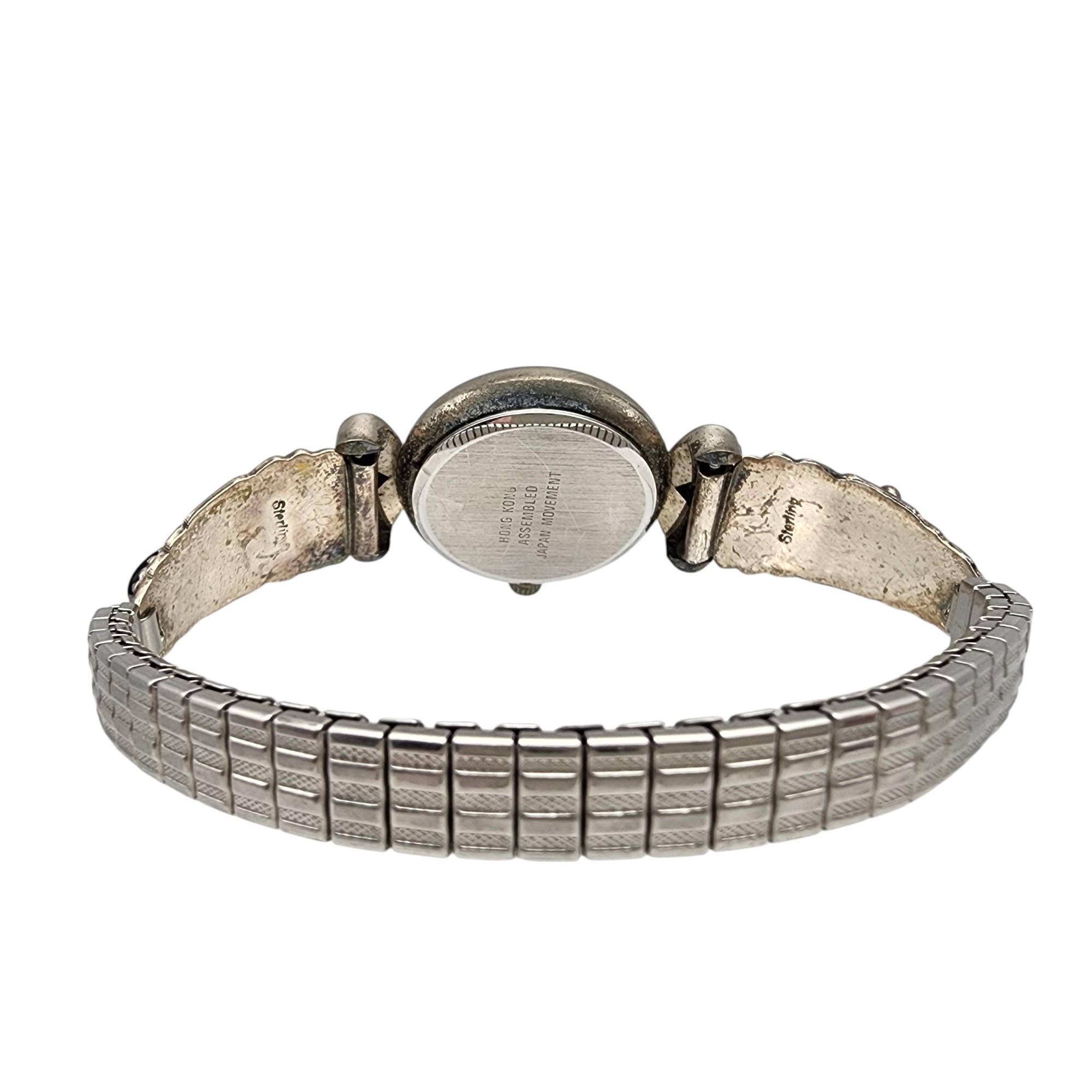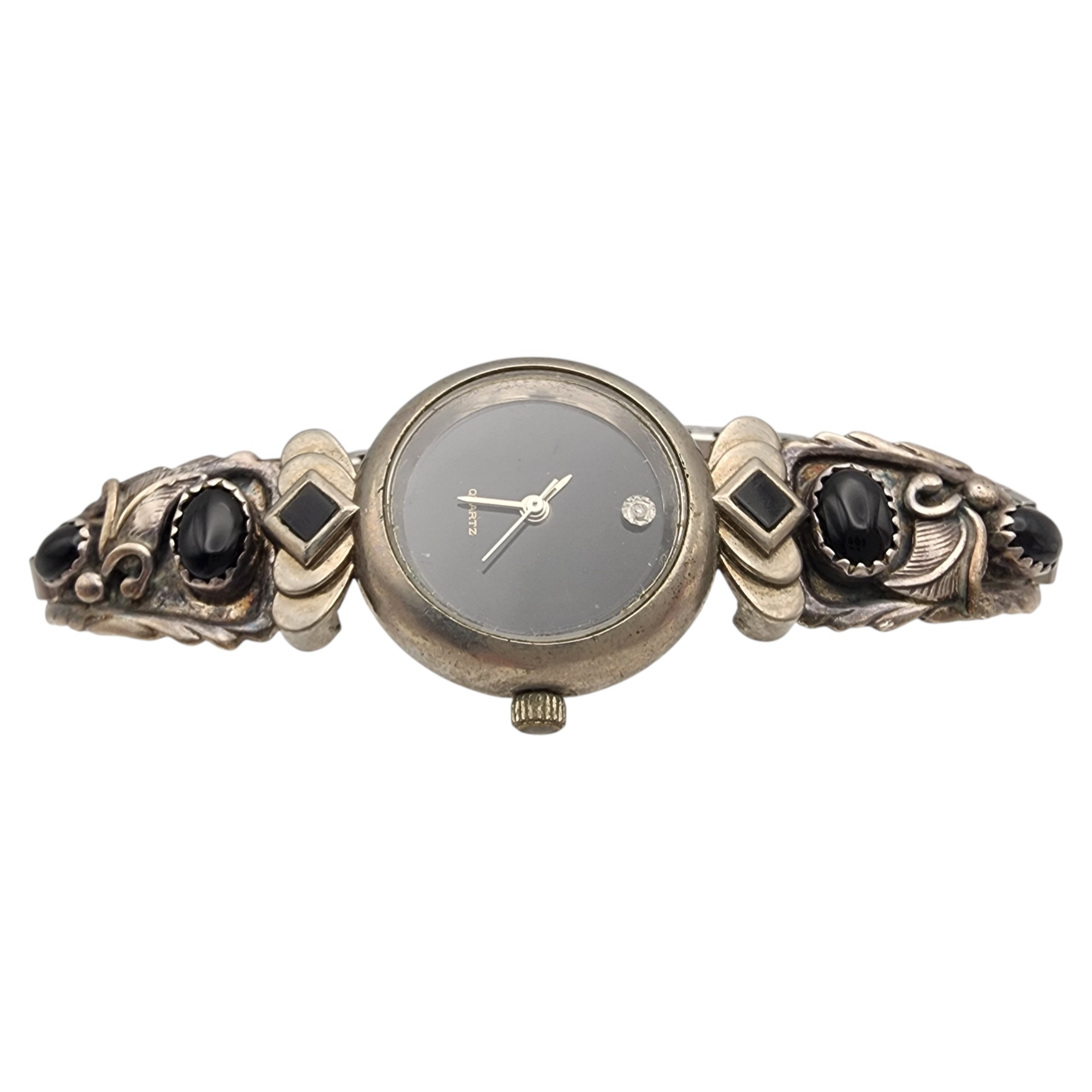 Navajo Sterling Onyx Watch Tips on a stainless steel band, 25.6g, watch needs battery