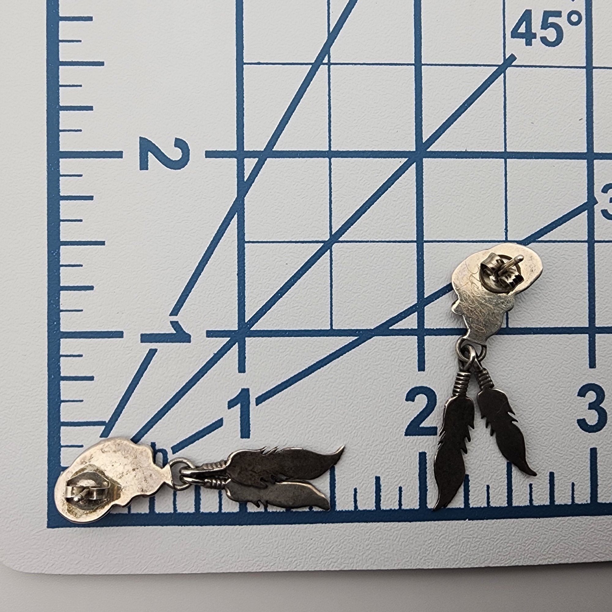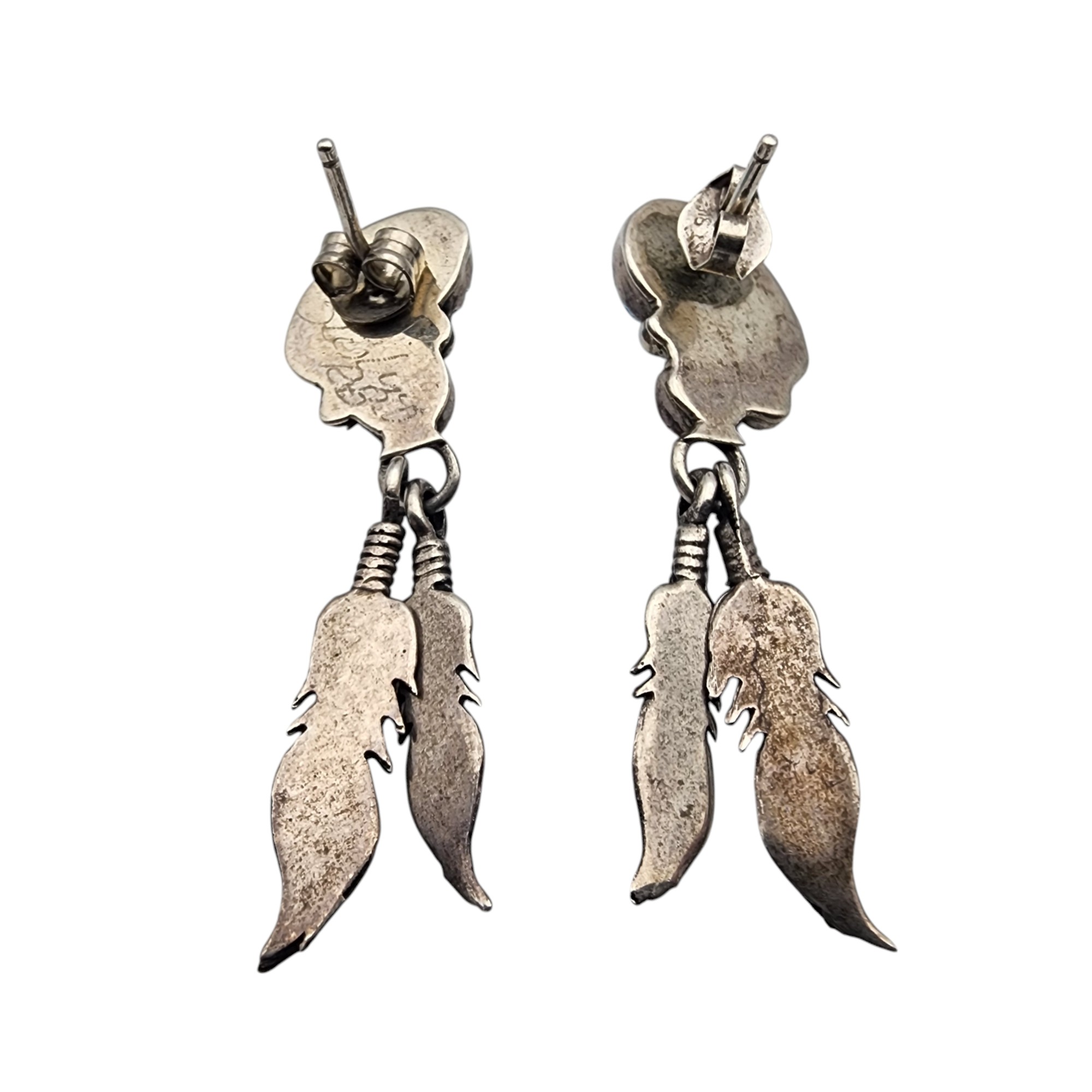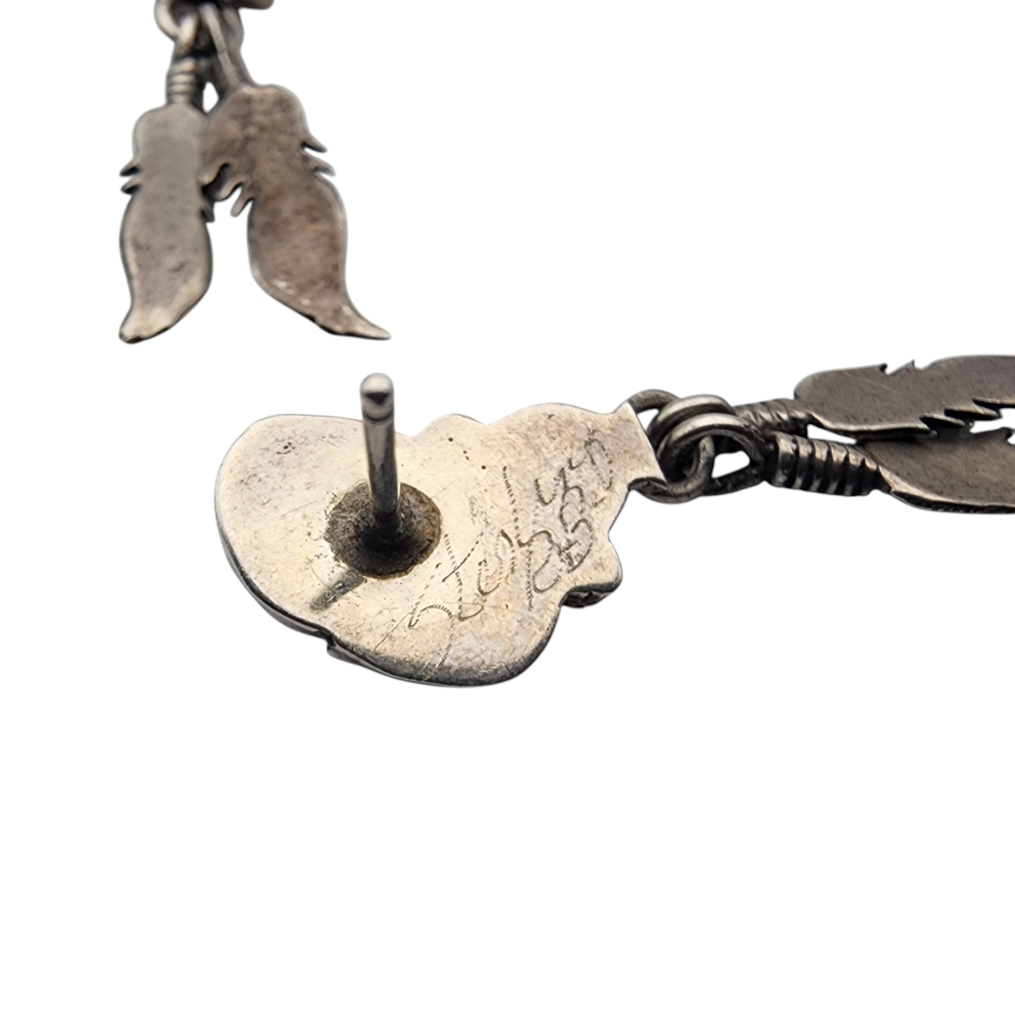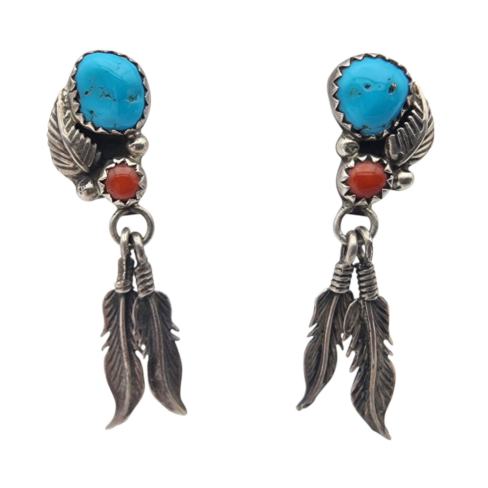 Richard Begay Navajo Sterling Turquoise Coral Feather Dangle Earrings, 5.9g