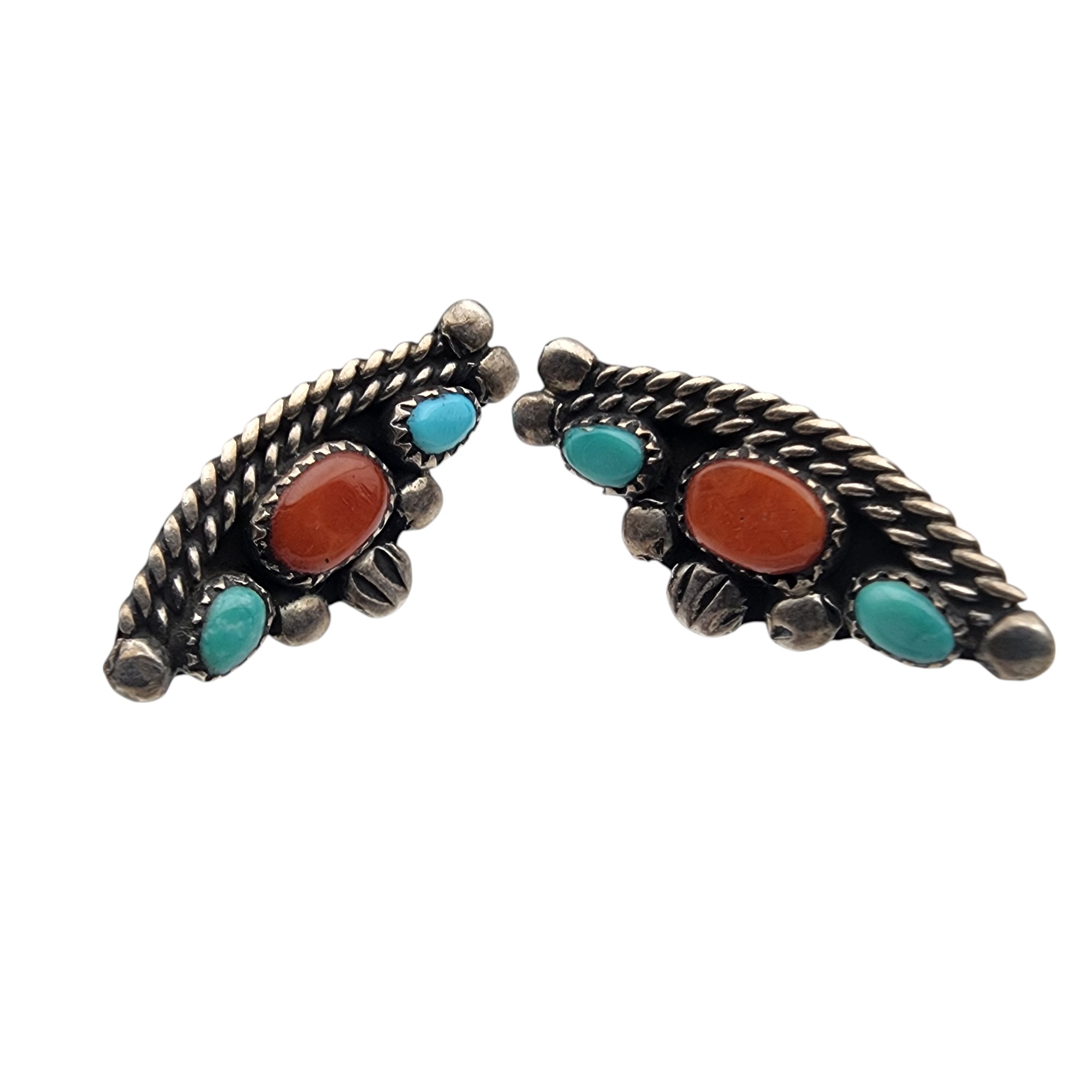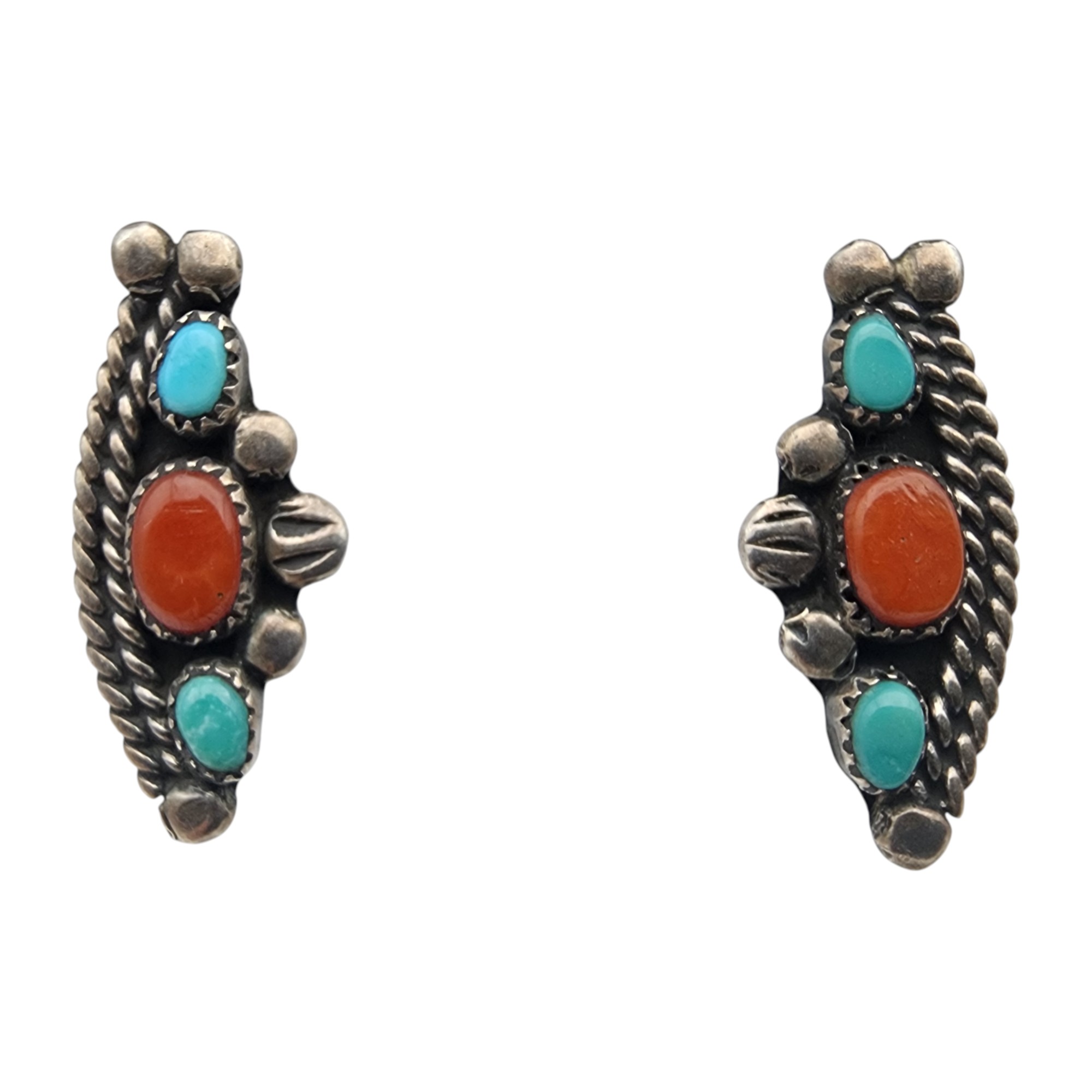 Vintage Navajo Sterling Turquoise Coral Earrings, 3.7g