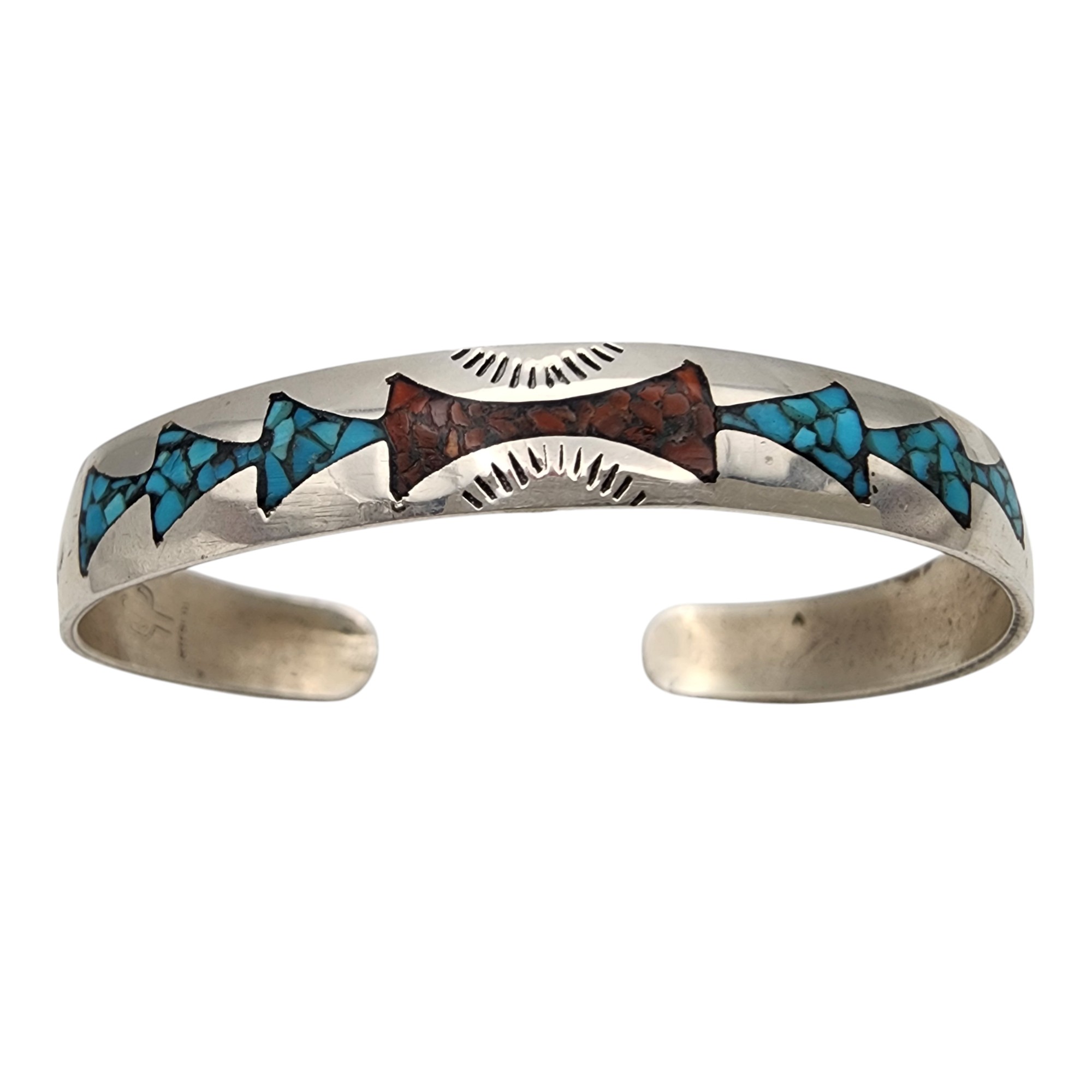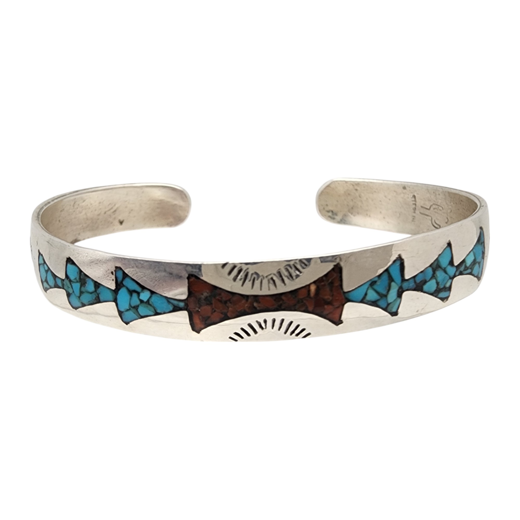 Jolene Yazzie Navajo Sterling Crushed Turquoise Coral Inlay Cuff Bracelet, 10.5g