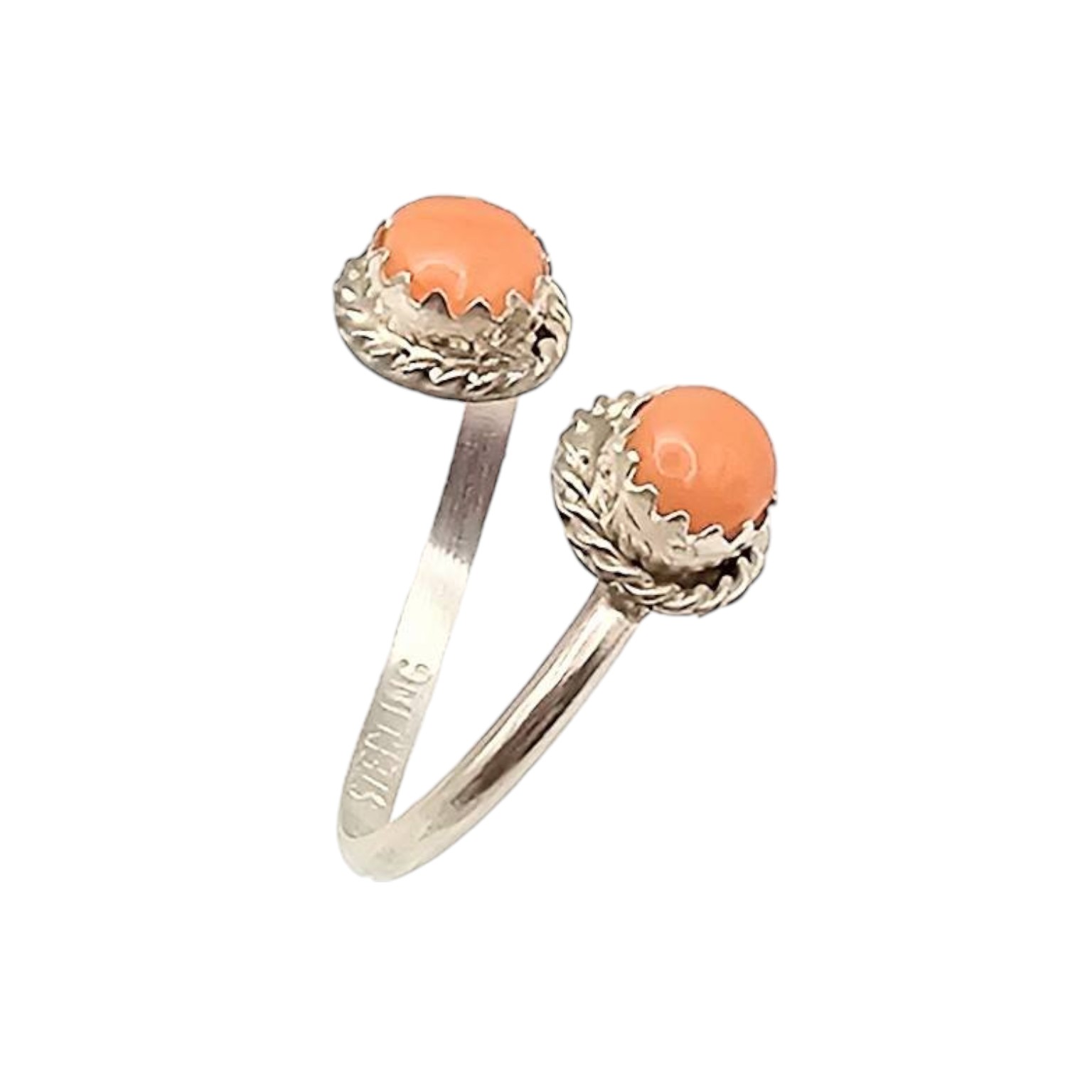 Navajo handmade adjustable sterling silver ring crafted by Esther White featuring two pink conch shell cabochons. The silver band is adjustable to fit various finger sizes. The combined weight of the ring is approximately 1.5 grams. A beautiful piece reflecting the craftsmanship of Navajo artisans.