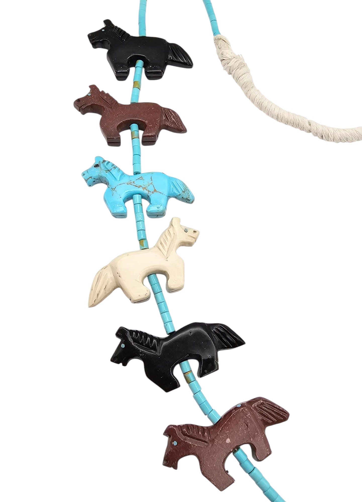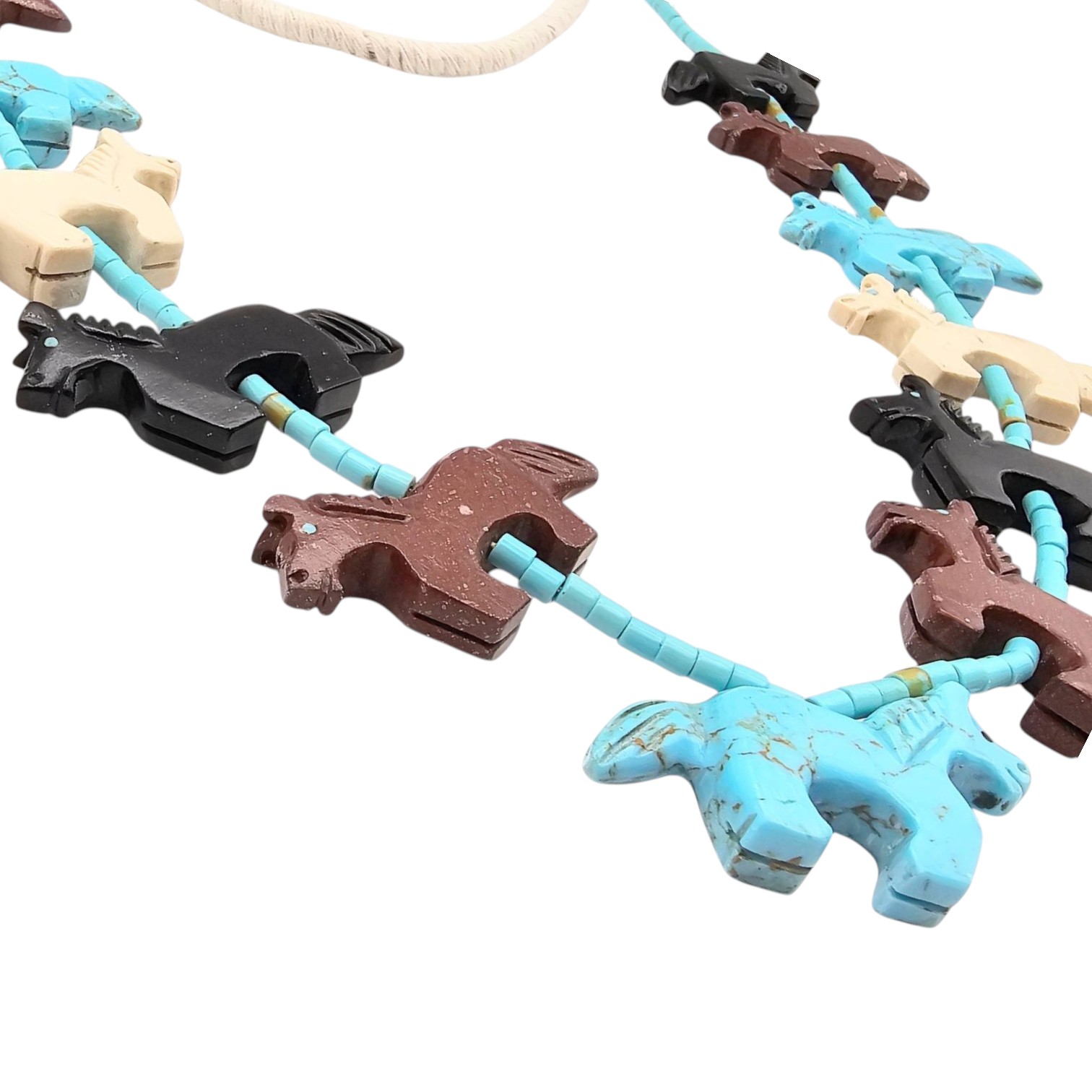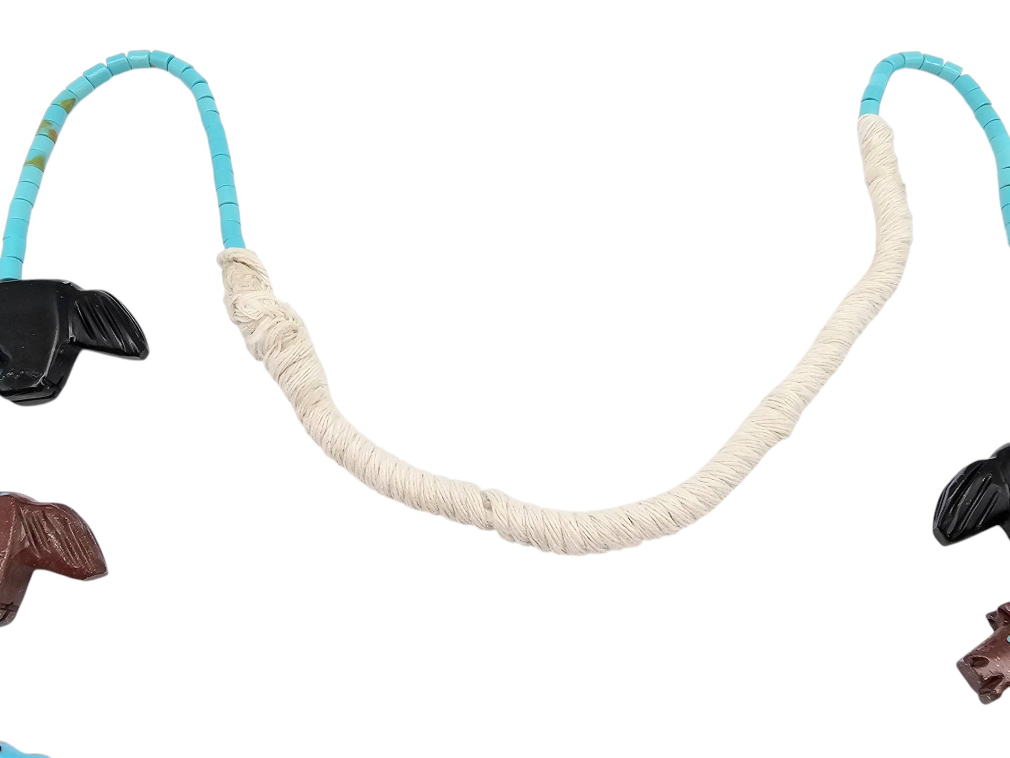 Ben Livingston Navajo handmade fetish necklace featuring animal-shaped carvings in turquoise, black, brown, and cream-colored stones. The necklace incorporates turquoise bead spacers and a cloth-wrapped section. It measures approximately 27 inches in length and features 16 animal carvings, each intricately detailed. Traditional Navajo craftsmanship is evident throughout.