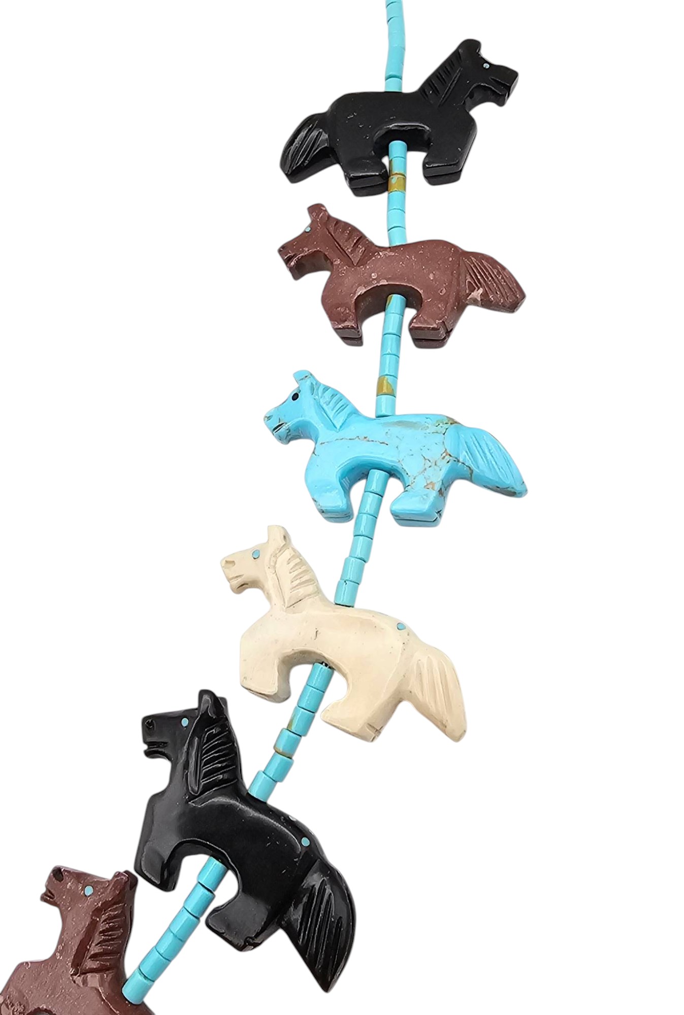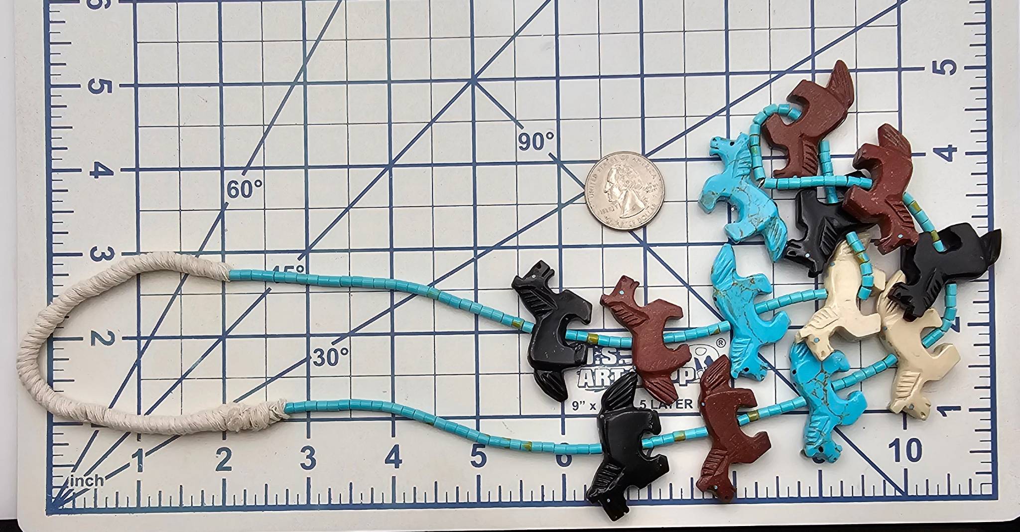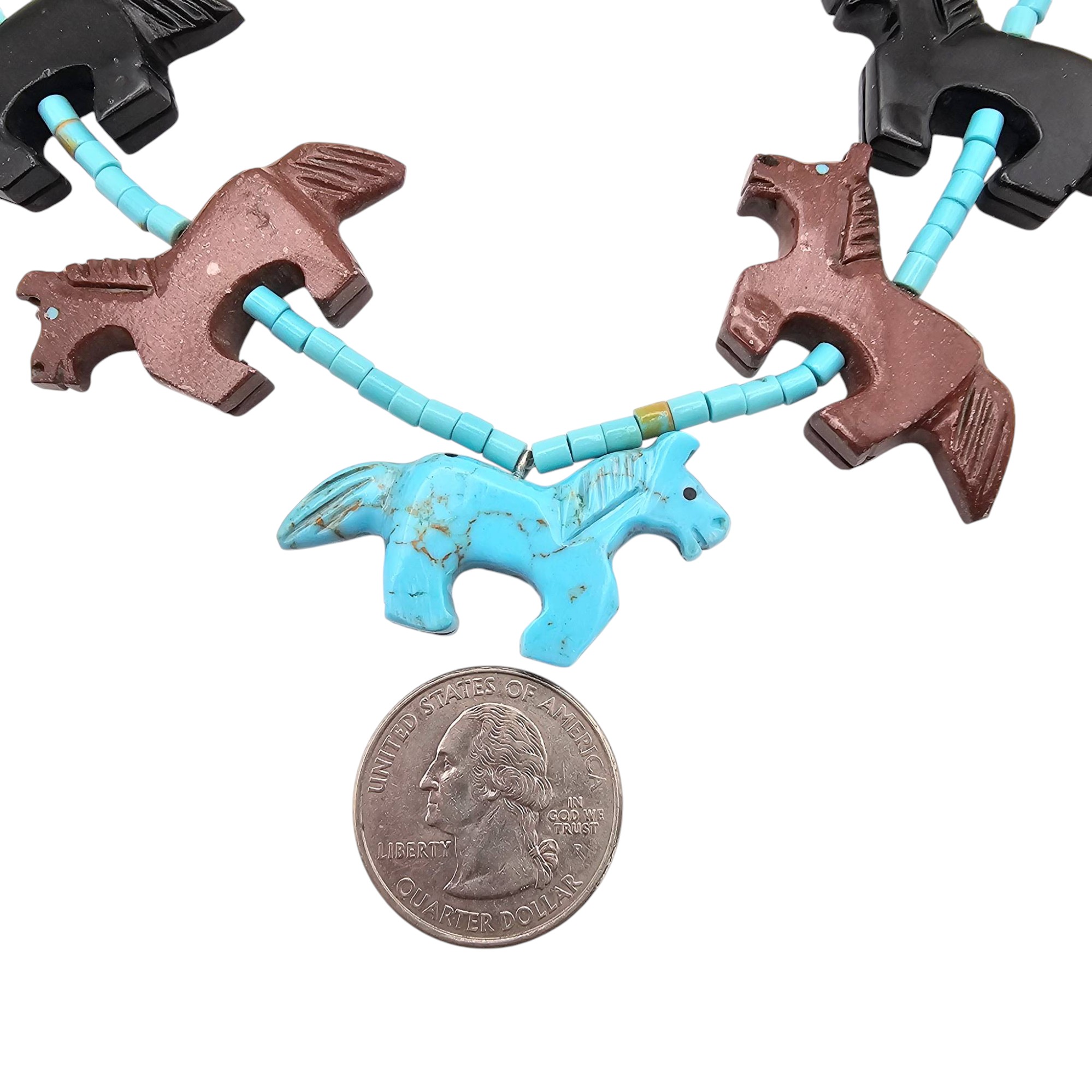Ben Livingston Navajo handmade fetish necklace featuring animal-shaped carvings in turquoise, black, brown, and cream-colored stones. The necklace incorporates turquoise bead spacers and a cloth-wrapped section. It measures approximately 27 inches in length and features 16 animal carvings, each intricately detailed. Traditional Navajo craftsmanship is evident throughout.