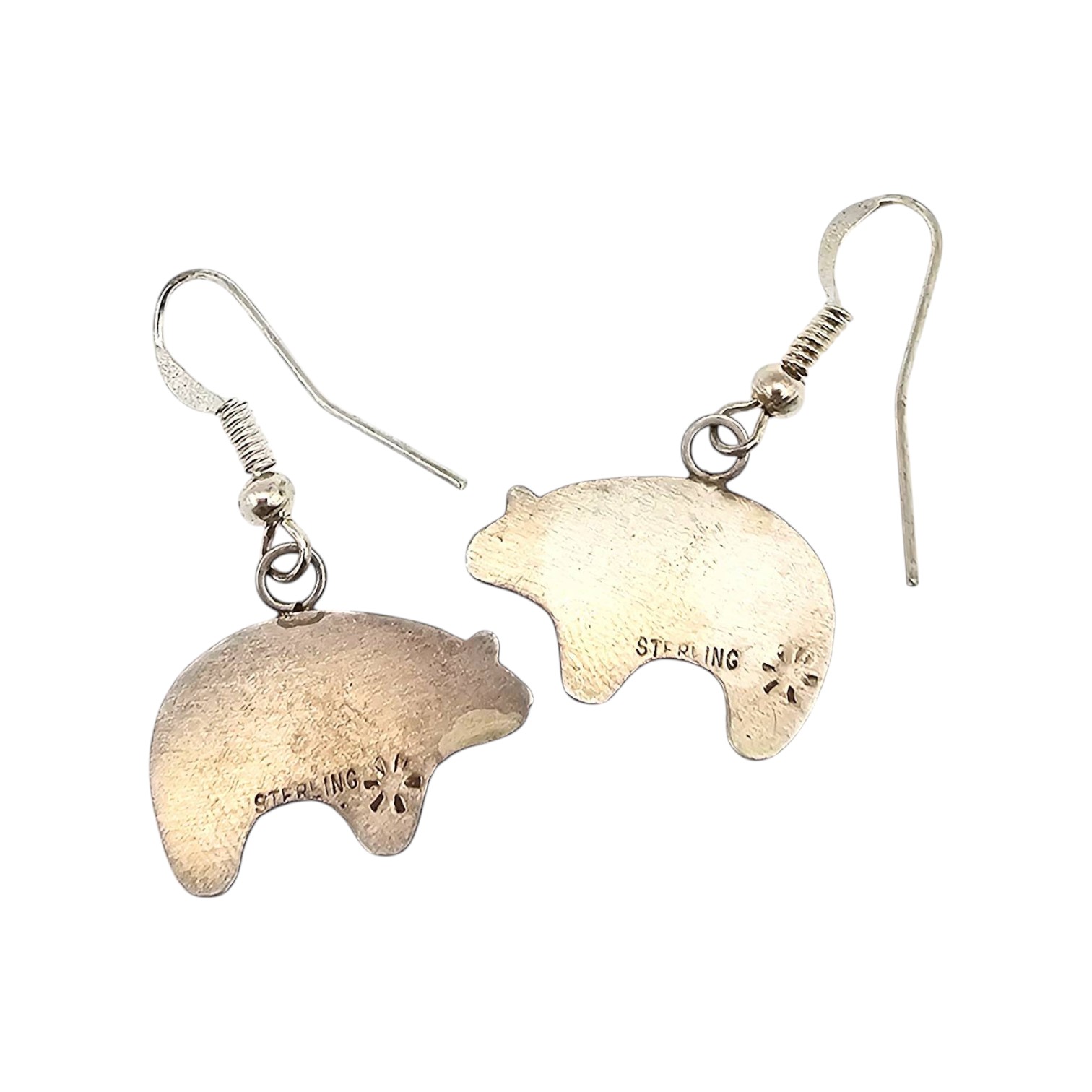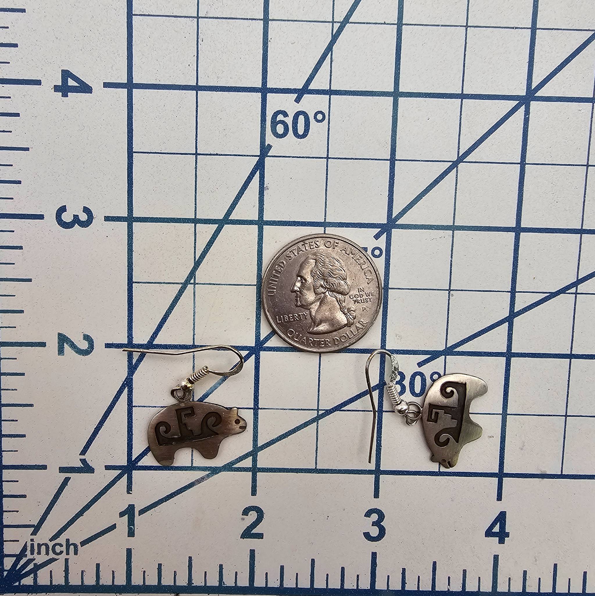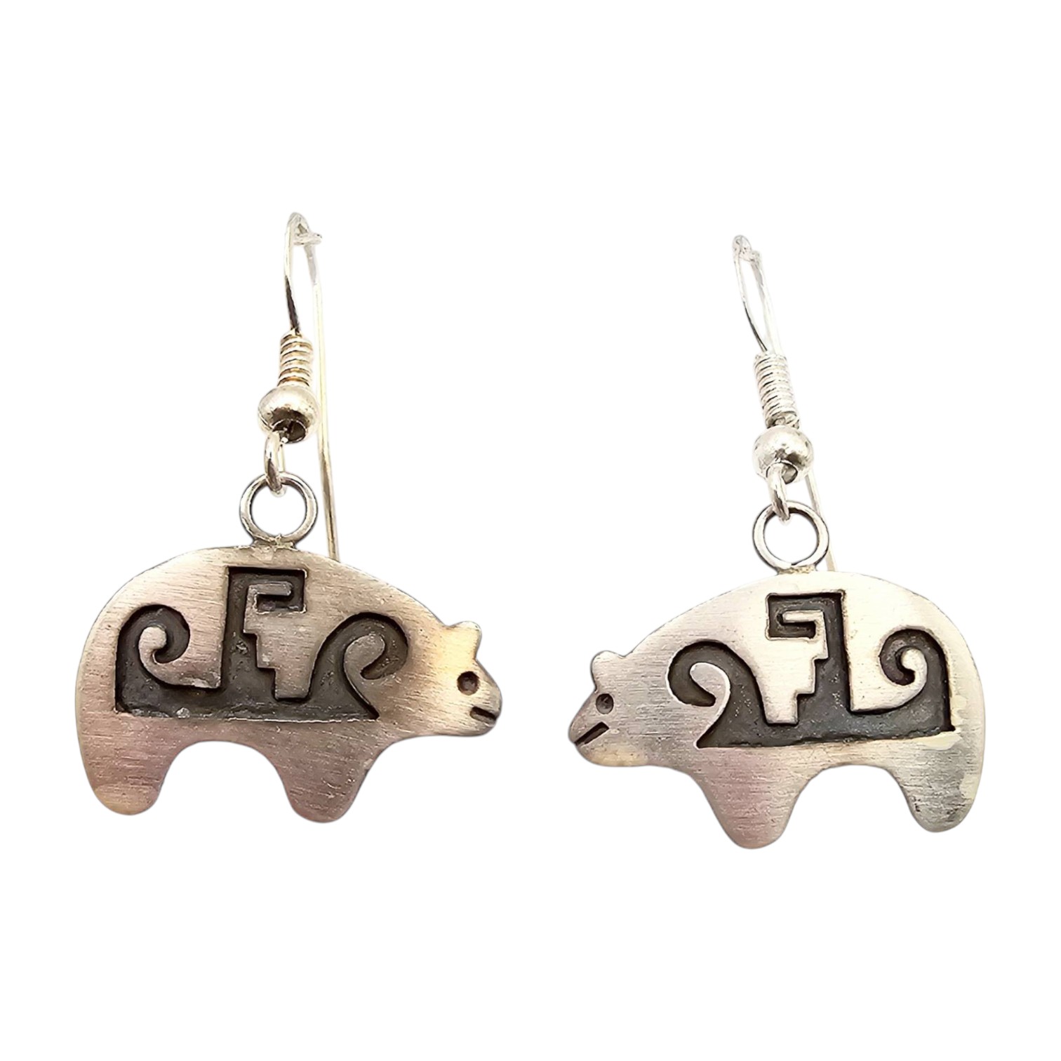 Handmade earrings by Robert Gene featuring a Navajo design. The earrings are crafted from sterling silver in an overlay style and shaped like bears with intricate patterns. The reverse side is stamped with ‘STERLING’ and the artist’s hallmark. They weigh approximately 2.3 grams and include attached ear wires for wearing.