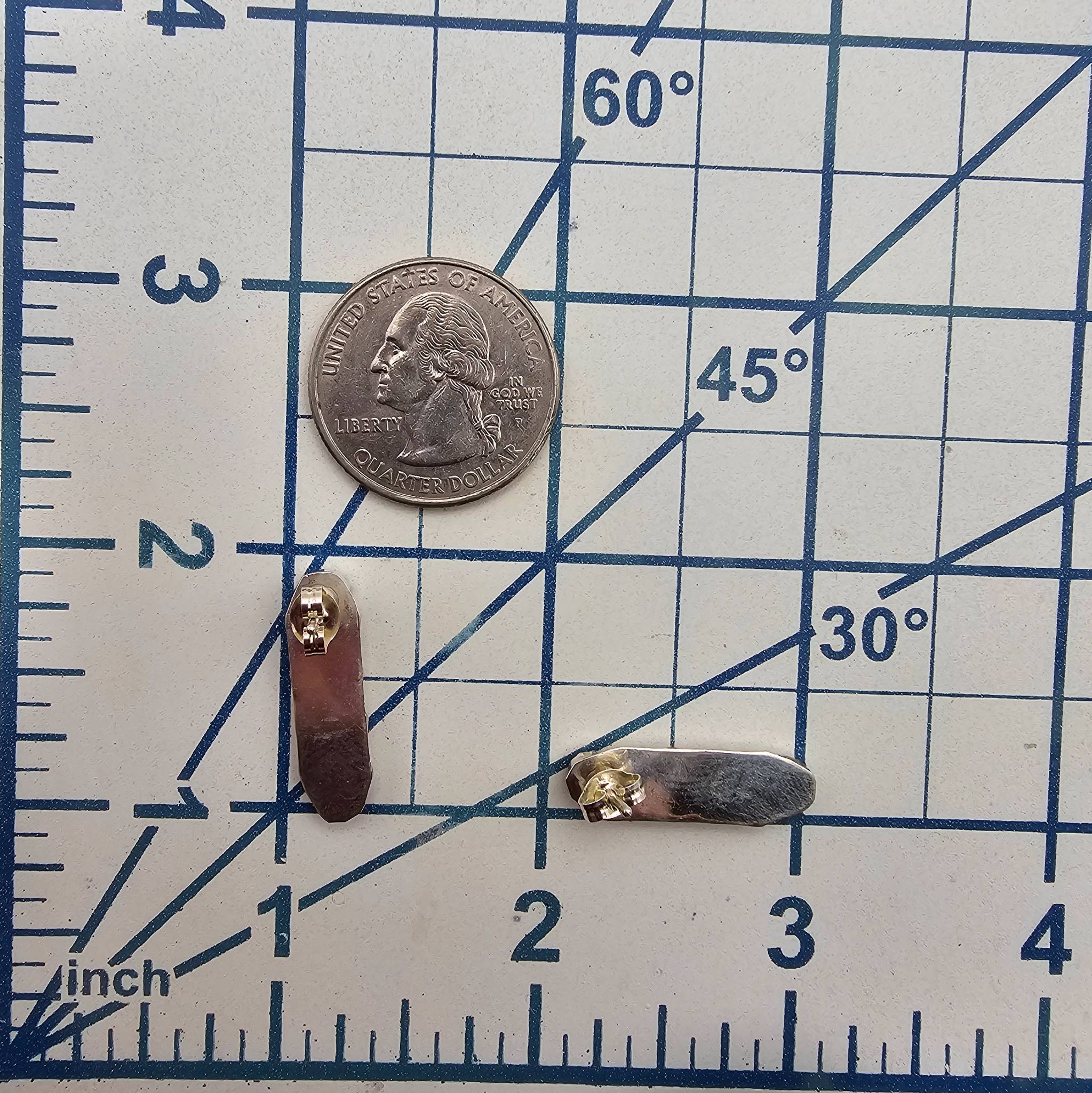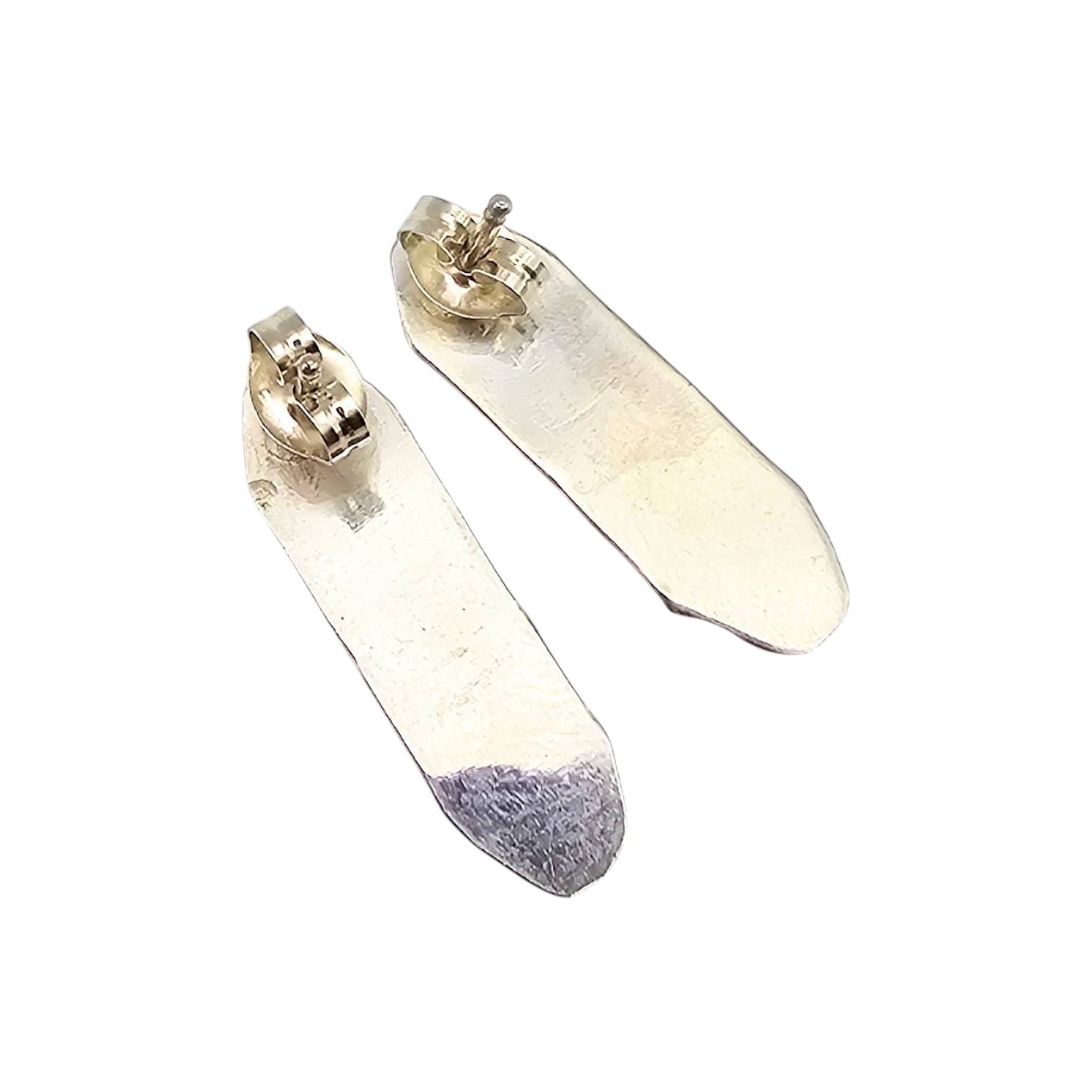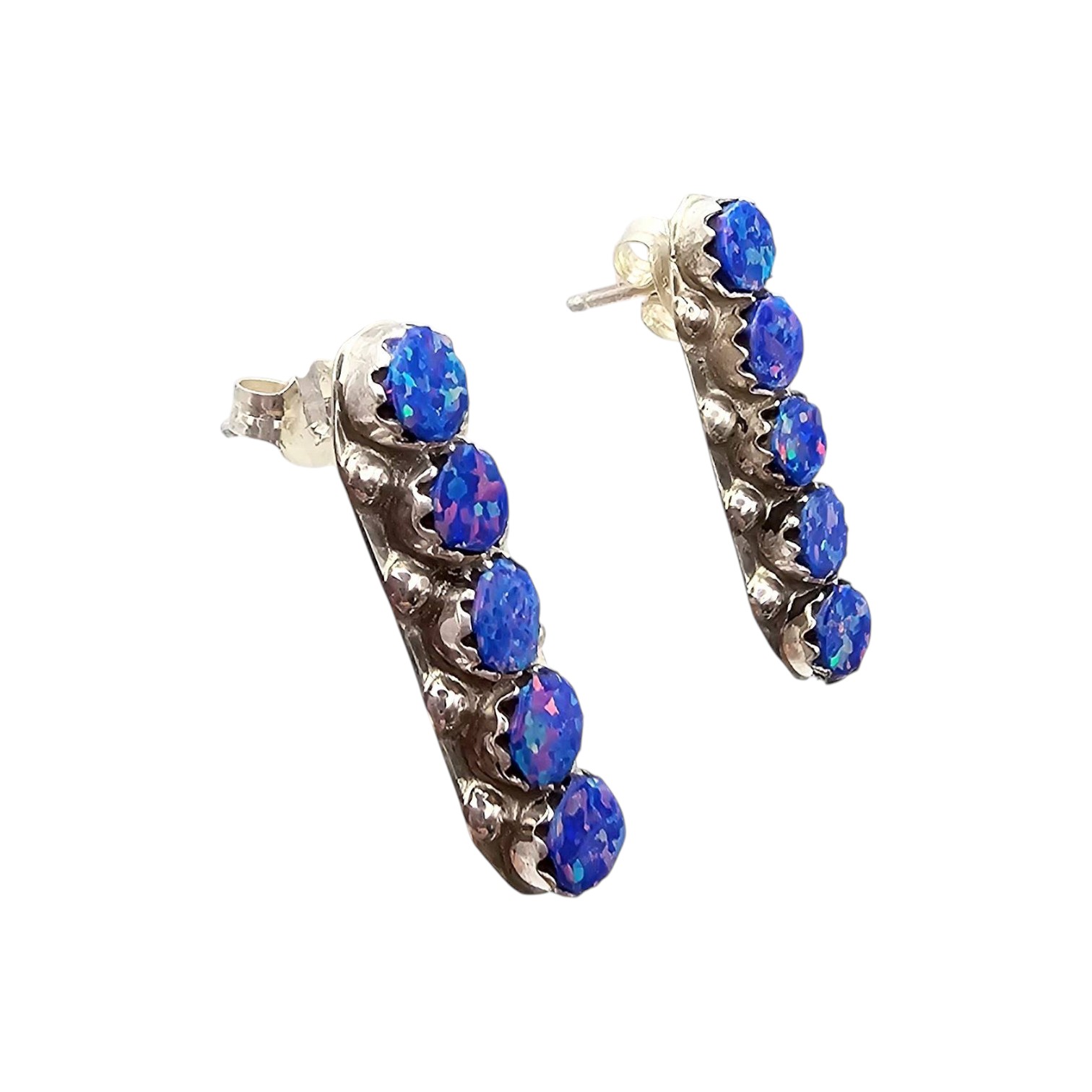 Handcrafted earrings by Zuni artisan Swain Charley. Made of sterling silver, each earring features a vertical row of vibrant synthetic opals set in a bezel-style setting. The earrings are lightweight at 3 grams total and measure approximately 1 inch in length. Post-back closures are included for secure wear.