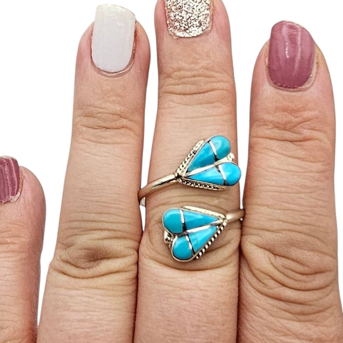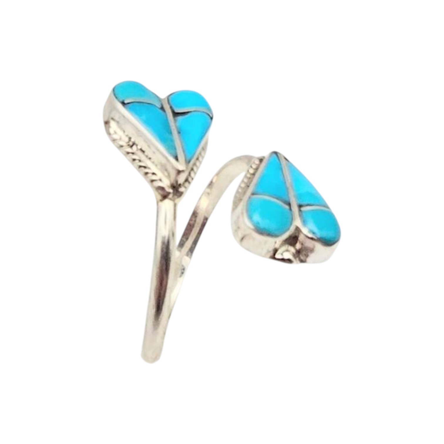 Handcrafted by Zuni artist Velda Nastacio, this sterling silver adjustable ring features two heart-shaped inlays of Kingman turquoise. The design is adorned with silver details along the edges of the inlays. The ring is marked as sterling silver and weighs approximately 3.2 grams. Adjustable to fit various sizes. Original label indicates a retail price of $175.