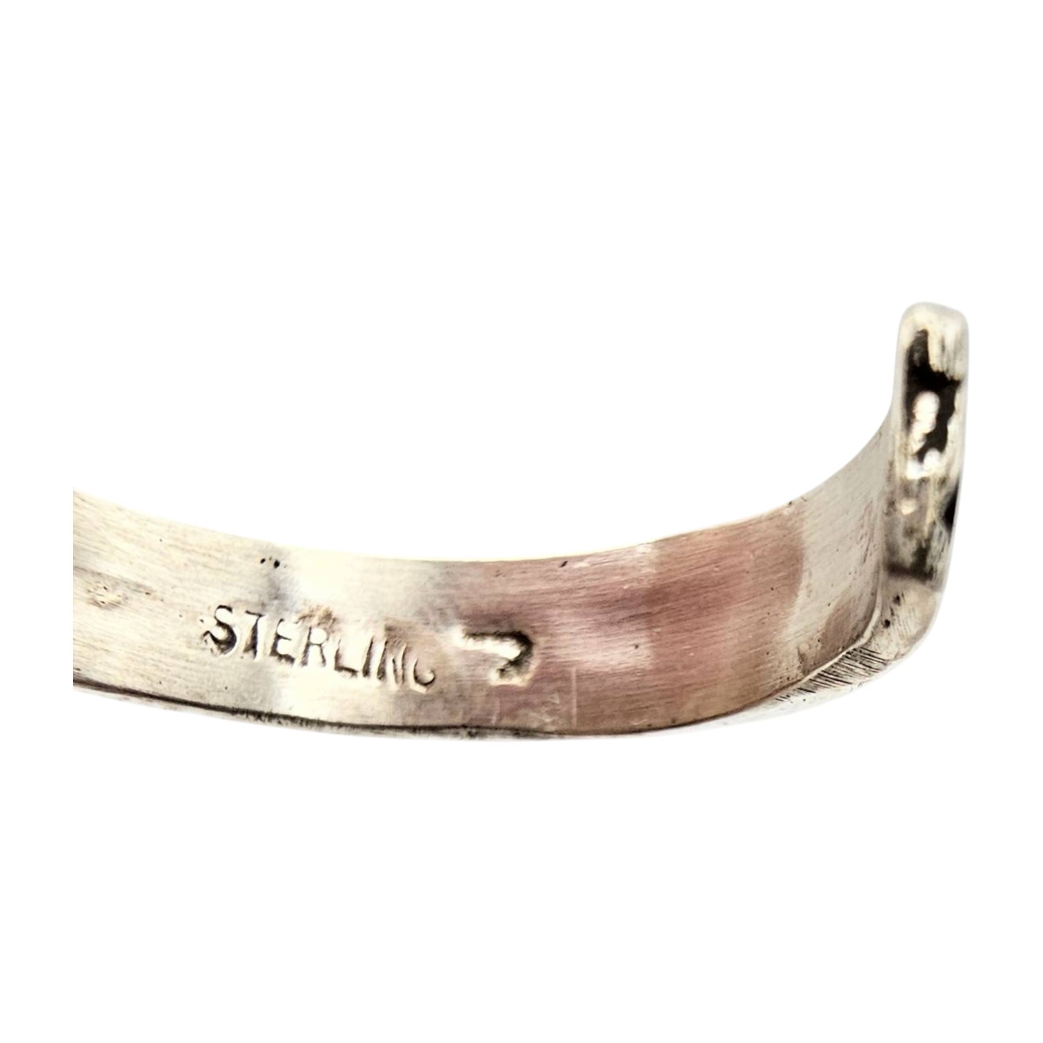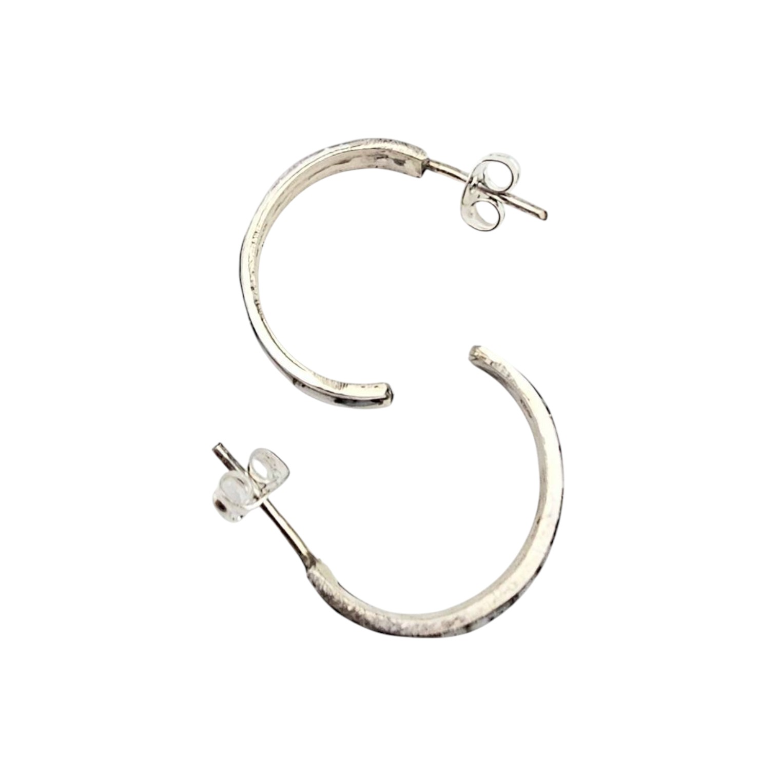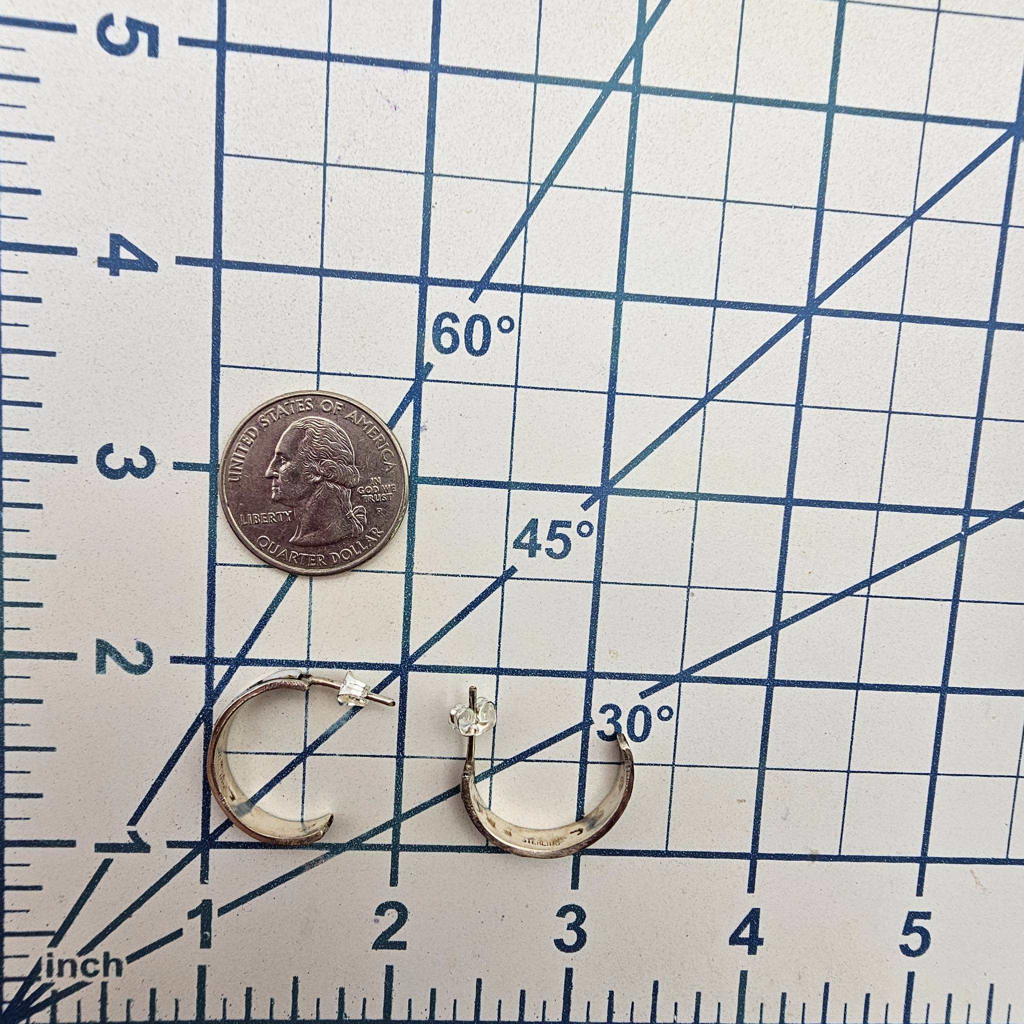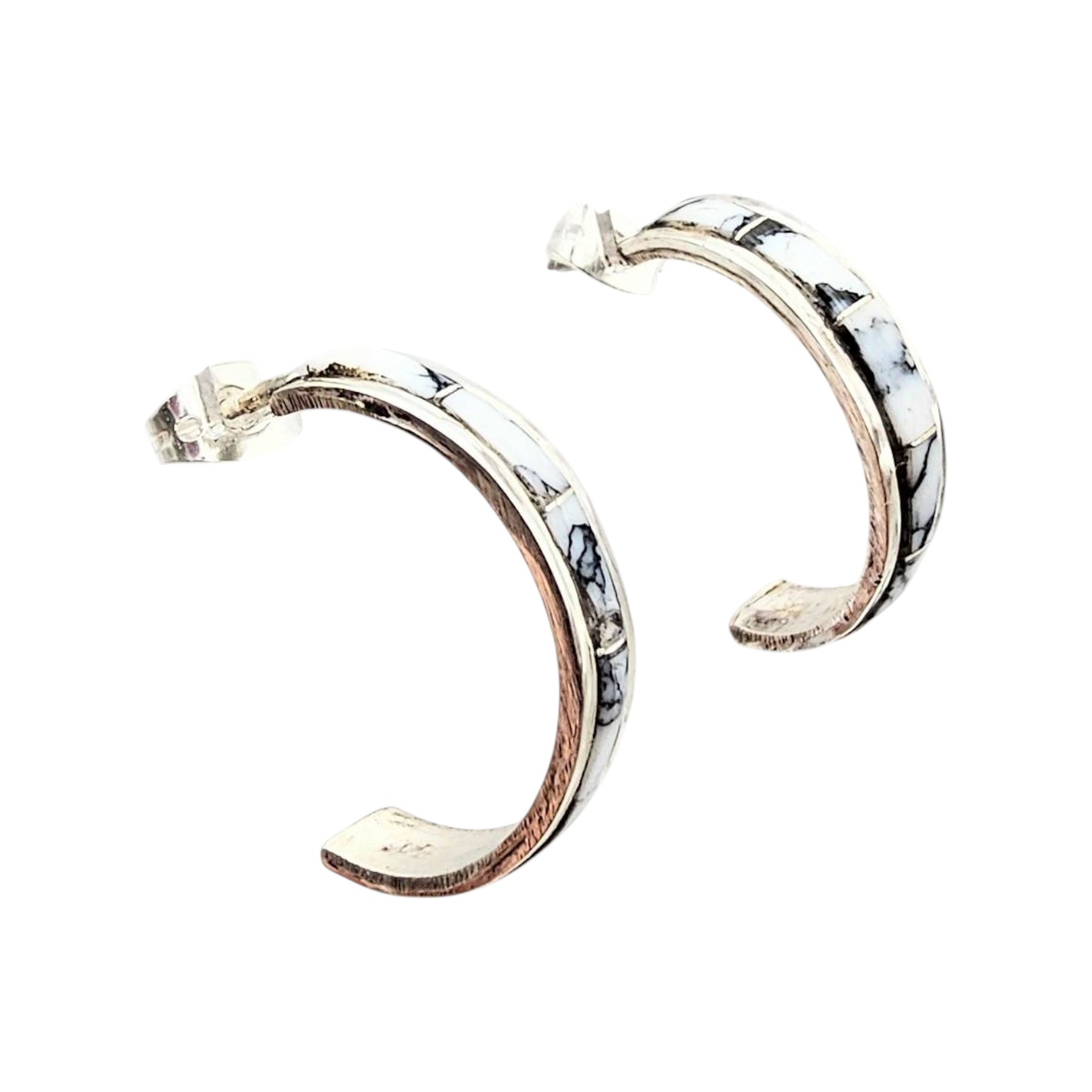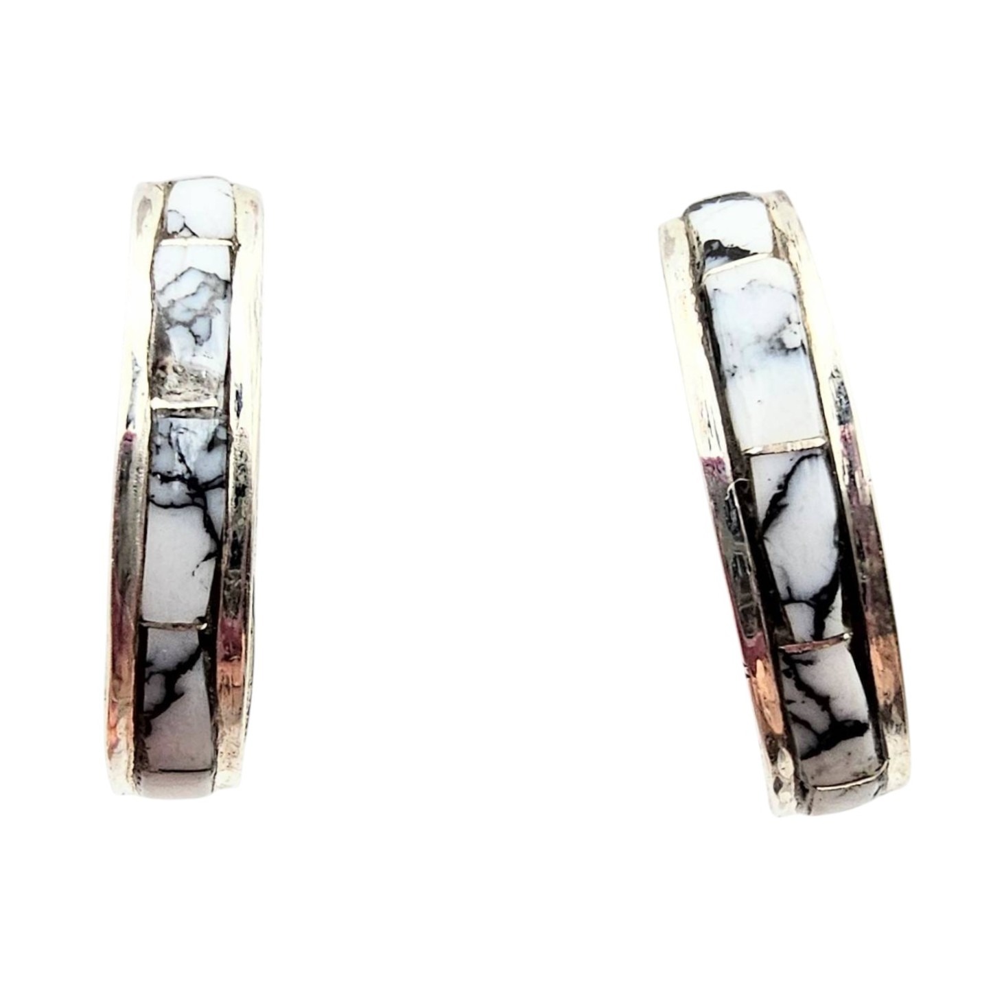 Navajo handmade sterling silver hoop earrings by artisan Jamie Johnson featuring white buffalo stone inlay. The earrings weigh 3.2 grams and include sterling silver barrel clasps. The interior is stamped ‘STERLING.’ These earrings demonstrate traditional Navajo craftsmanship.