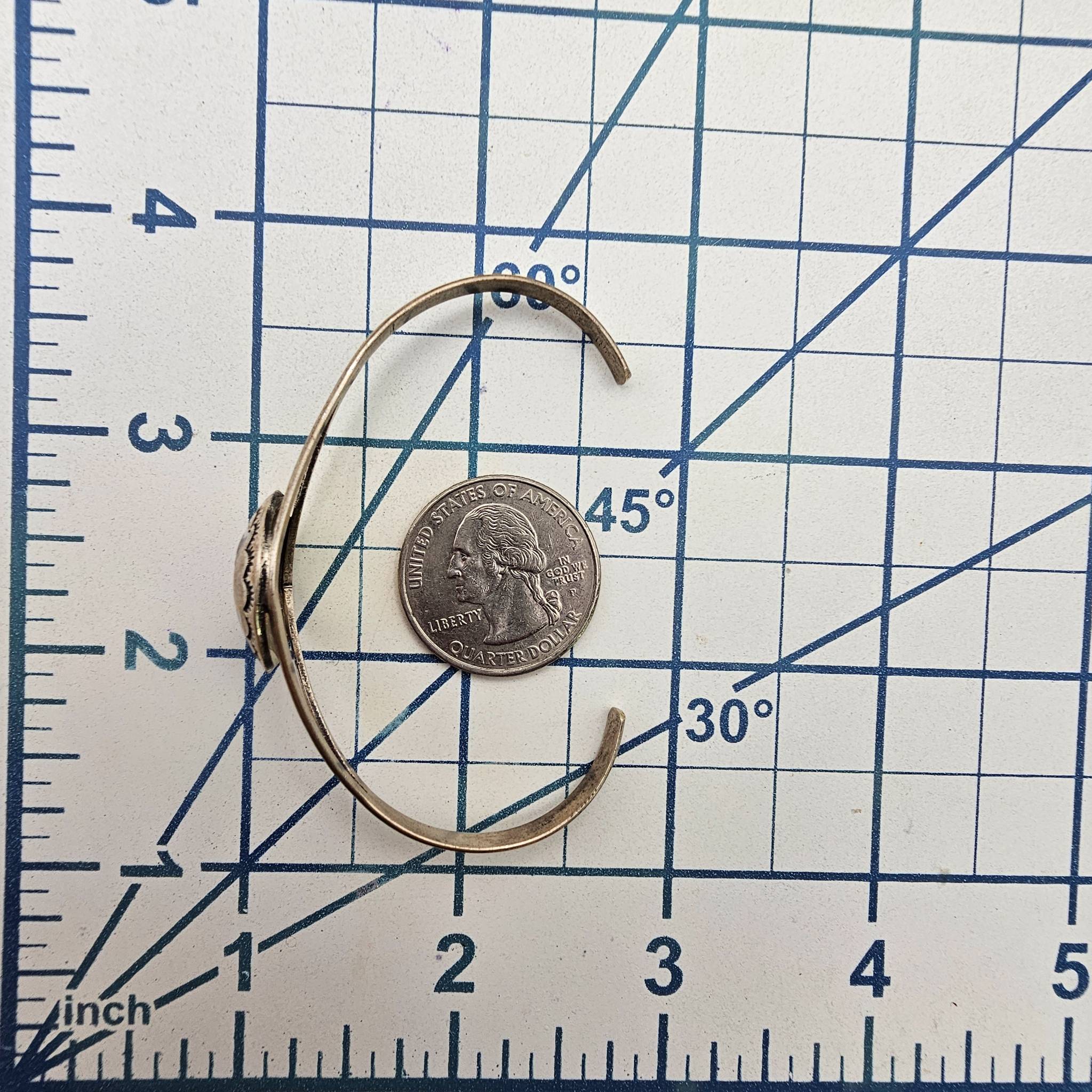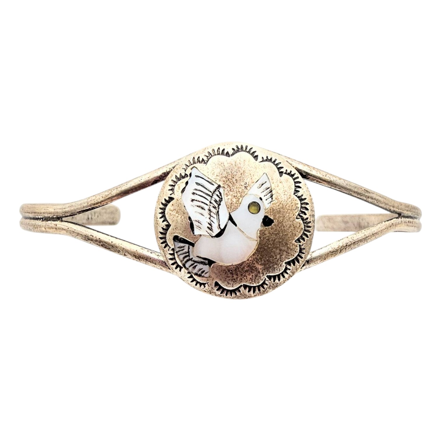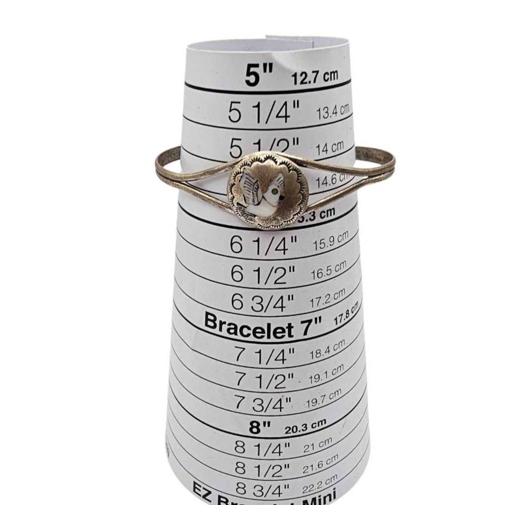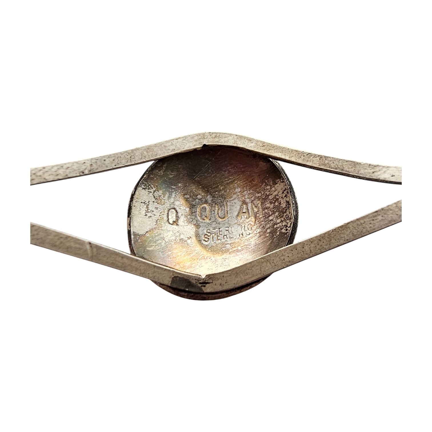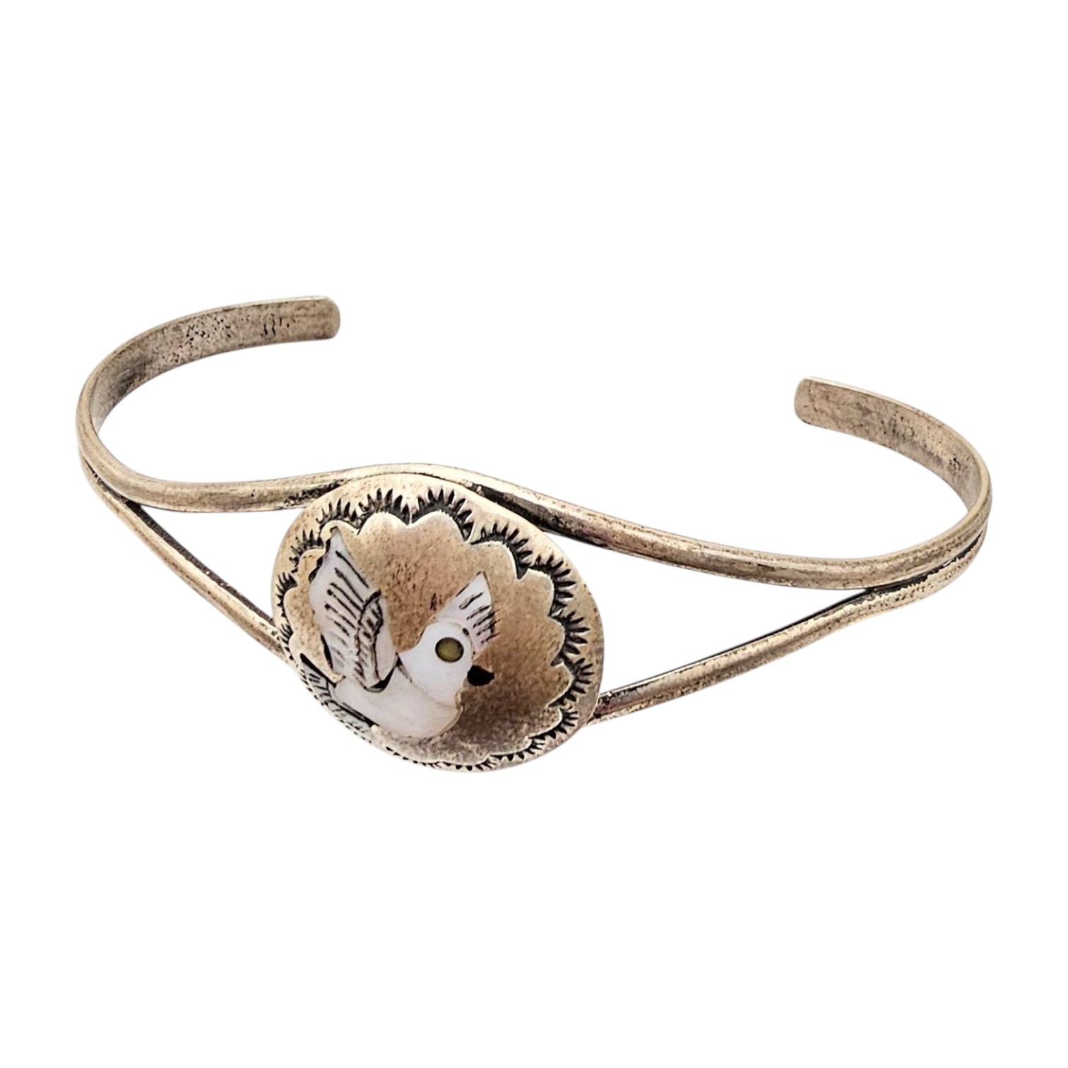 Sterling silver bracelet handcrafted by Quinton Quam from the Zuni tribe. Features an intricately inlaid bird design on a scalloped oval centerpiece. Stamped “Q. QUA STERLING” on the back. Bracelet weighs 6.6 grams and has a diameter of approximately 6 1/4 inches. Handmade with traditional Zuni techniques.